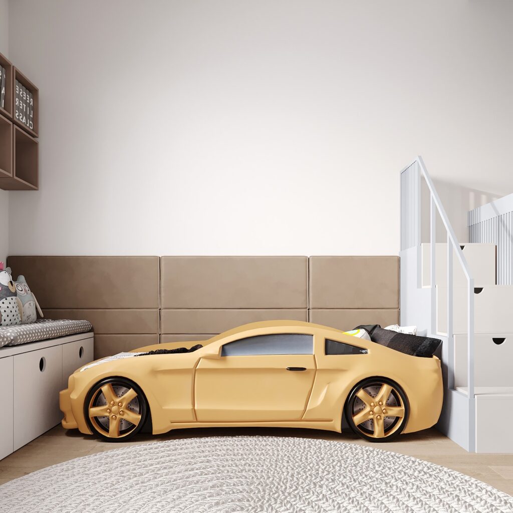 Themed beds are one of the most desired elements for kids, as they are not just furniture, but a place for imaginary adventures. A bed shaped like a rocket or car will be the centerpiece of the room, but it’s important that it doesn’t dominate the space. Use neutral wall colors and other minimalist furniture elements to avoid overwhelming brightness.