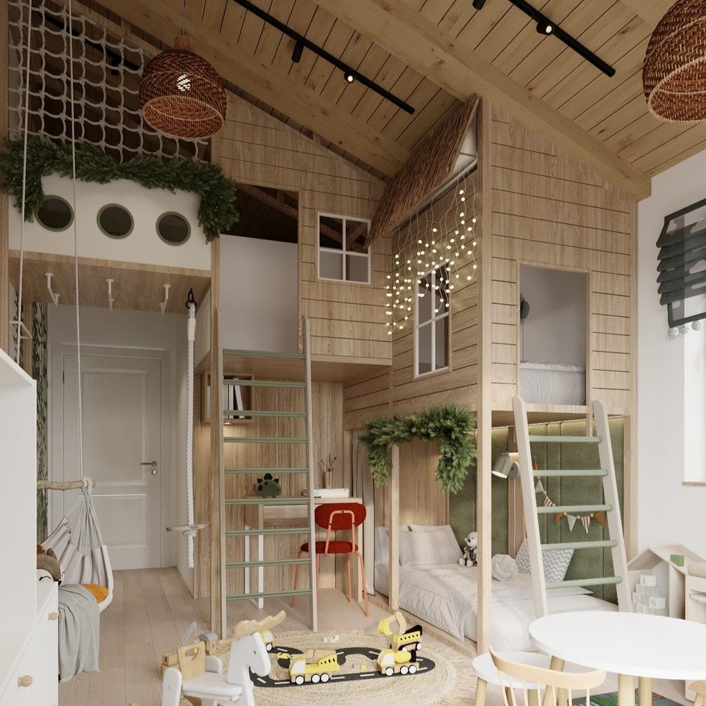 Another option is a bunk bed, where the top level can be turned into a real play fortress or hideout. You can create a space for resting, playing, or reading by using curtains, decorative pillows, and soft lighting.
