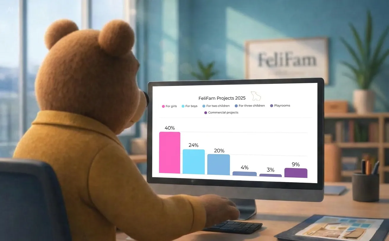 This year, FeliFam design projects were distributed as follows: 40% for girls, 24% for boys, 20% for two children, 4% for three children, 3% for playrooms, and 9% for commercial projects.