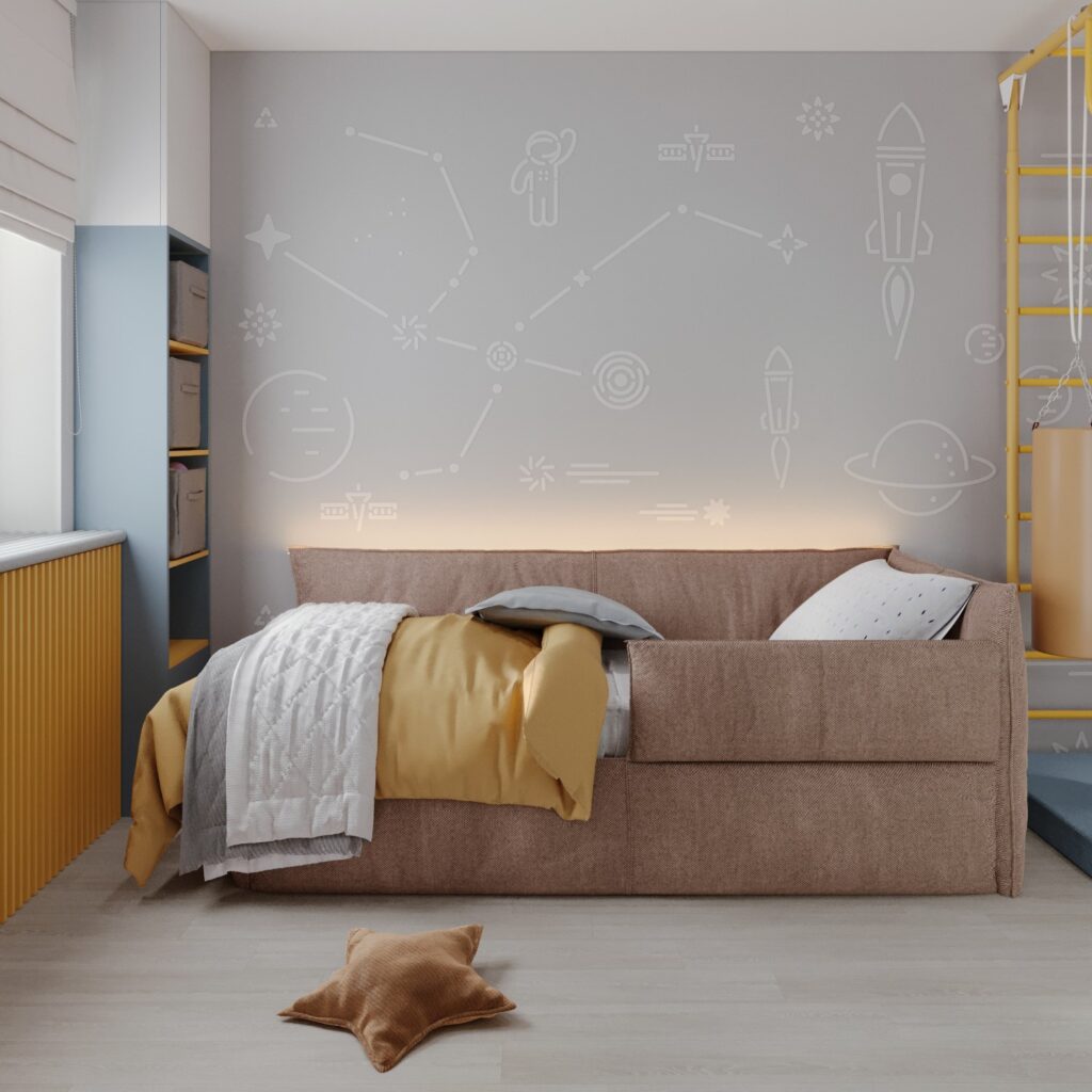 Even in a minimalist interior, you can create comfort by using the right materials and details. Textiles such as soft blankets, pillows, rugs and curtains add warmth and comfort to a room, making it more inviting. Soft lighting, such as warm bulbs or LED strips, creates a calm and cozy atmosphere, which is especially important in children’s rooms, where an atmosphere for sleep and relaxation is important.