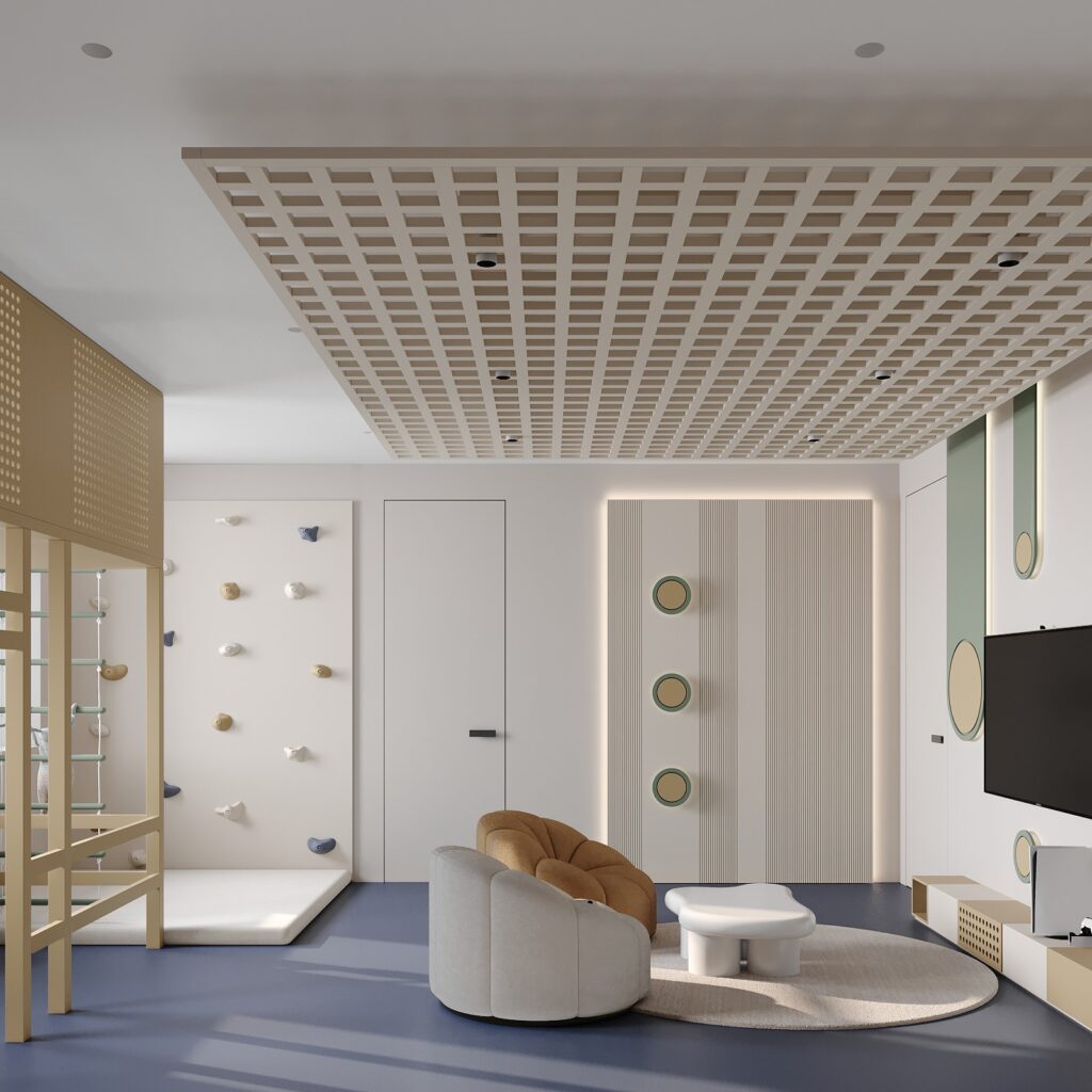 One of the unique elements of the project was the design of part of the ceiling: we decorated it with MDF panels, on which we placed lighting. It looks simple but original, creating a modern and elegant look of the space. Such a solution not only adds style, but also functionality, because the soft lighting creates a comfortable atmosphere, ideal for children’s games and relaxation. This element has become a real decoration of the room, emphasizing its uniqueness and modernity.