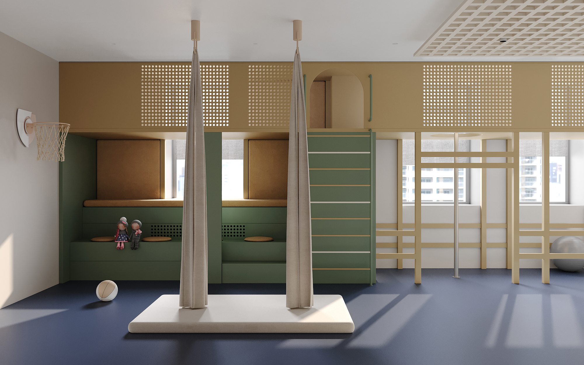 The space of the room allowed us to comfortably divide it into zones, each of which corresponds to the interests of the children. For example, we arranged the area for training with a handrail, ropes and parallel bars in a special niche, which allowed us to create a separate space for physical activity. We allocated another part of the room for aerial gymnastics, where soft mats were specially arranged for safety during training.