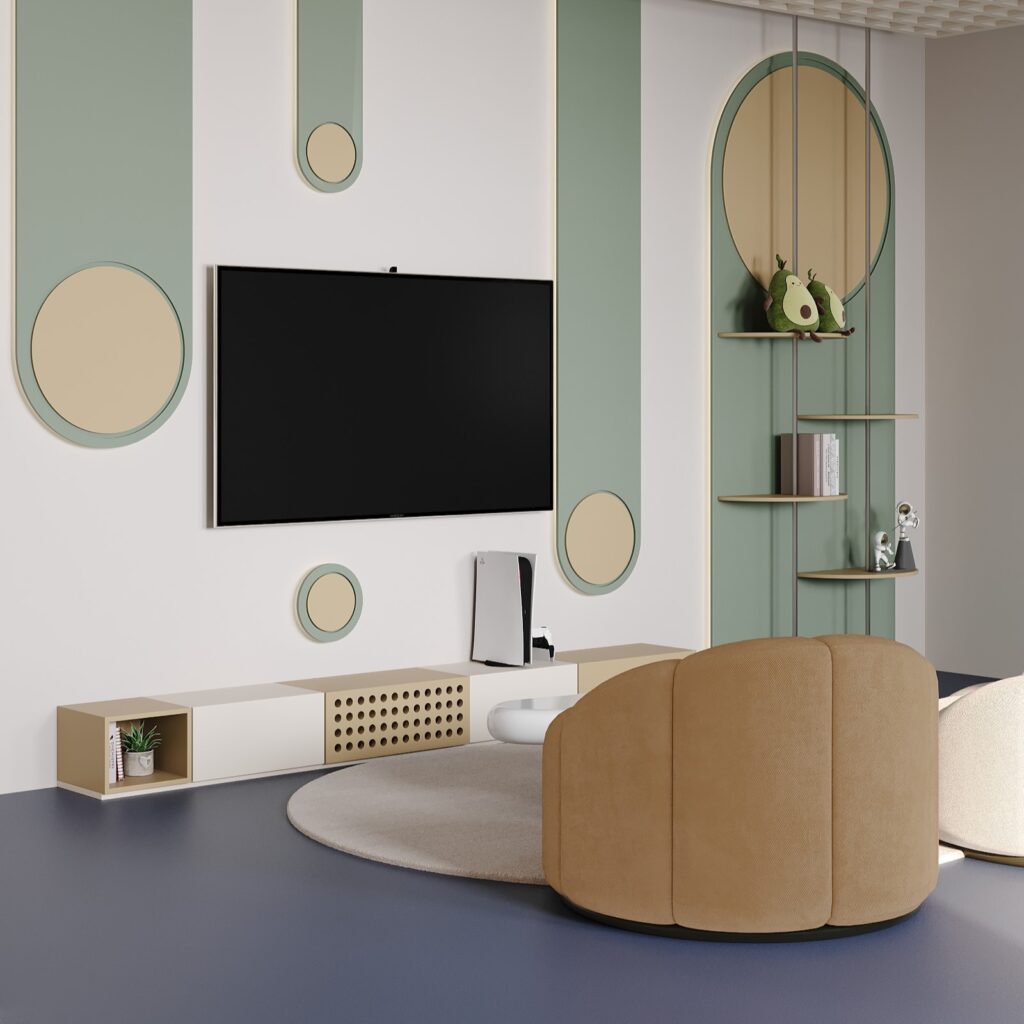 The style of the room was chosen with an emphasis on a calm atmosphere. To create comfort and harmony, pastel colors were used, complemented by bright accents. The blue floor became the central element that visually connects all the zones. Also, to create a lightness and natural atmosphere, green elements were used on the walls, adding freshness and tranquility to the room.