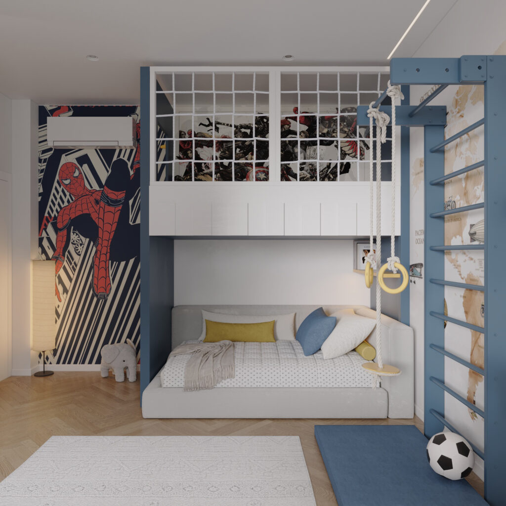 When designing rooms for kids, we use wallpaper with trendy prints that reflect the interests and hobbies of this age group. As designers, the choice may include graphic motifs, abstractions, sports or technological elements that blend harmoniously with other aspects of the interior, creating a stylish and functional atmosphere.