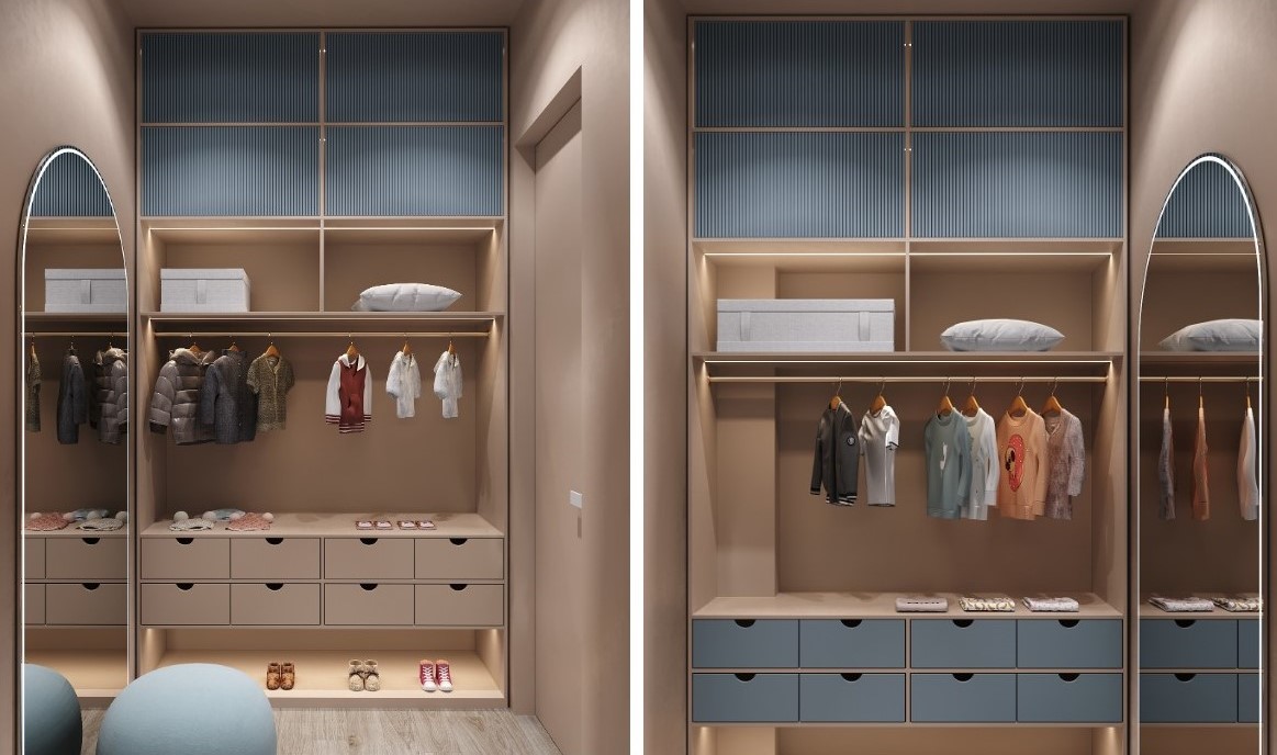Limited functionality: Children’s needs change over time, so a dressing room that seems optimal for a baby may become unsuitable when the child grows up. This may require additional costs for redevelopment or adaptation of the space. However, an optimally designed and implemented dressing room can maintain its functionality for a long time, which makes it a profitable solution.