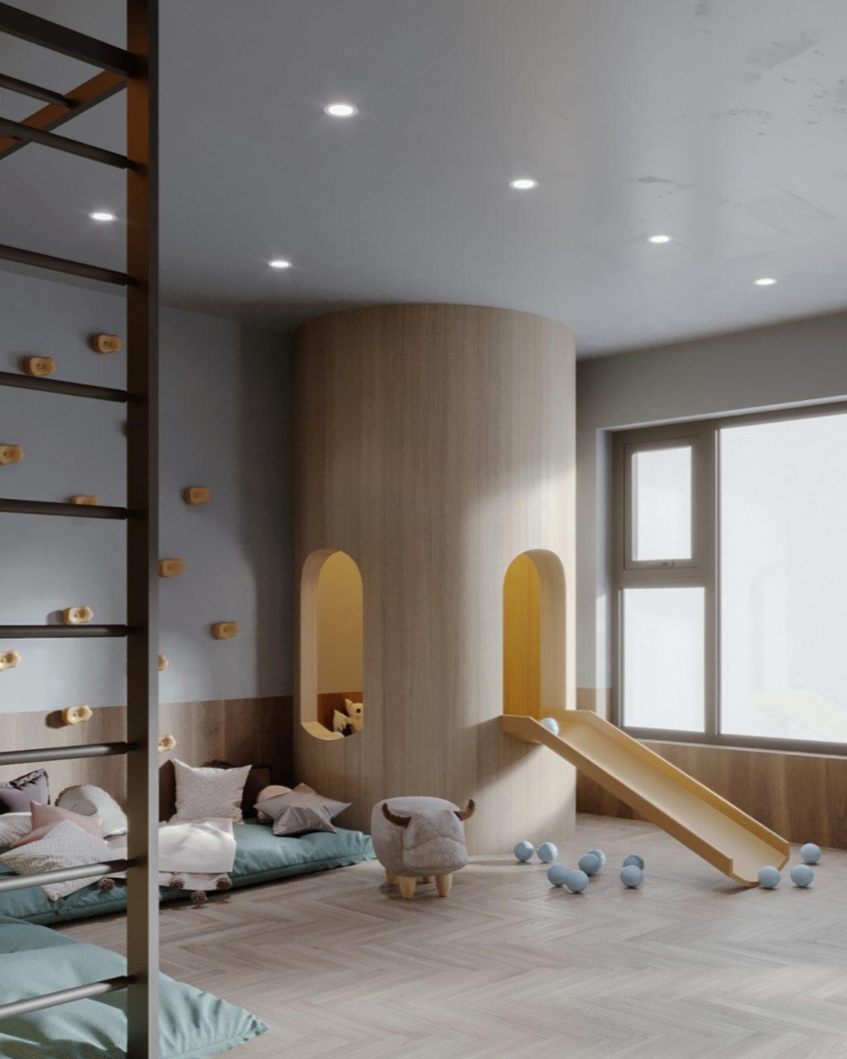 A spacious and immersive kids’ playroom where entertainment, creativity, and comfort are seamlessly combined. The two-level structure with interactive elements creates a dynamic environment for active play, development, and exploration, while the open layout maintains a sense of lightness and visual harmony.