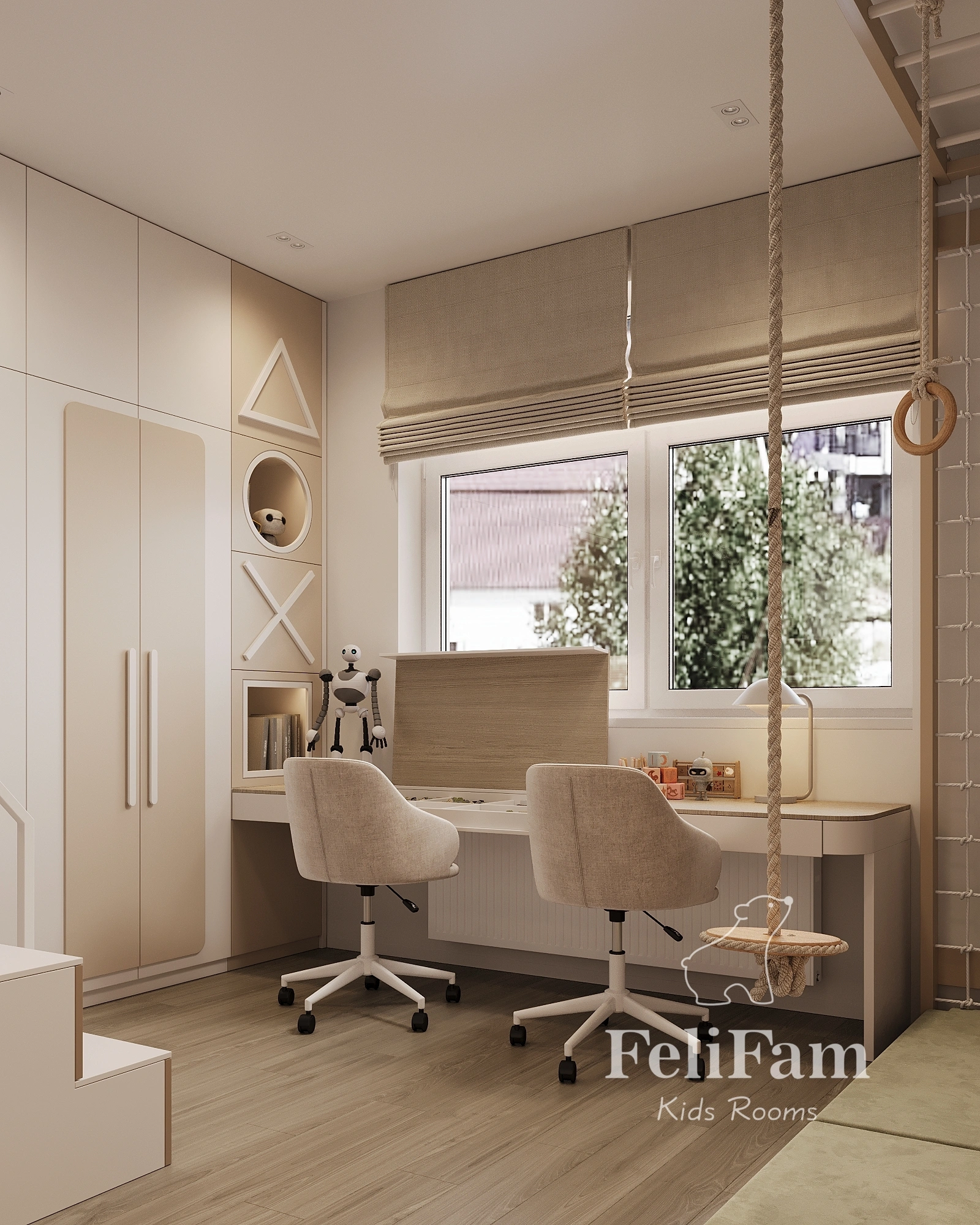 The room features a sports corner for physical activity, and the study area is positioned by the window to take advantage of natural light. Ample storage and open shelves help keep the room organized and make it easy to arrange toys, books, and learning materials, creating a balanced interior for children of different genders.