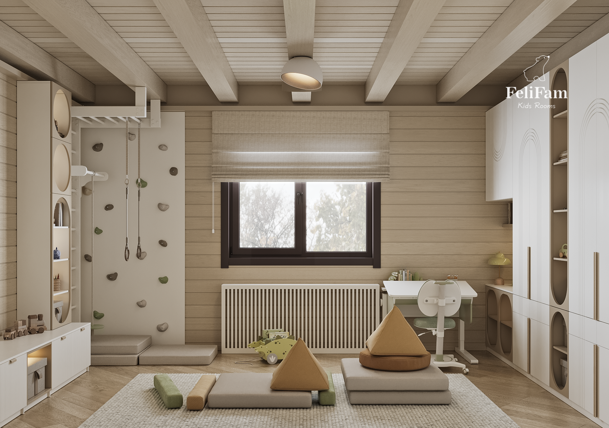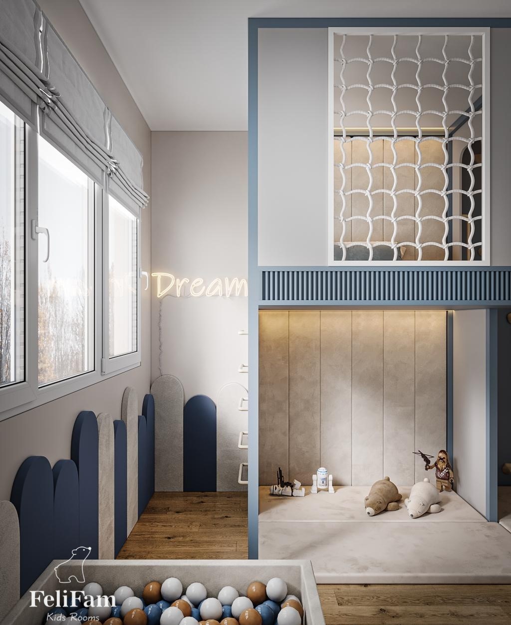 It is a good idea for an active child to have a separate space or even a playroom. In this case, it will be easier to relax in the bedroom and more interesting elements can be placed in the second room.