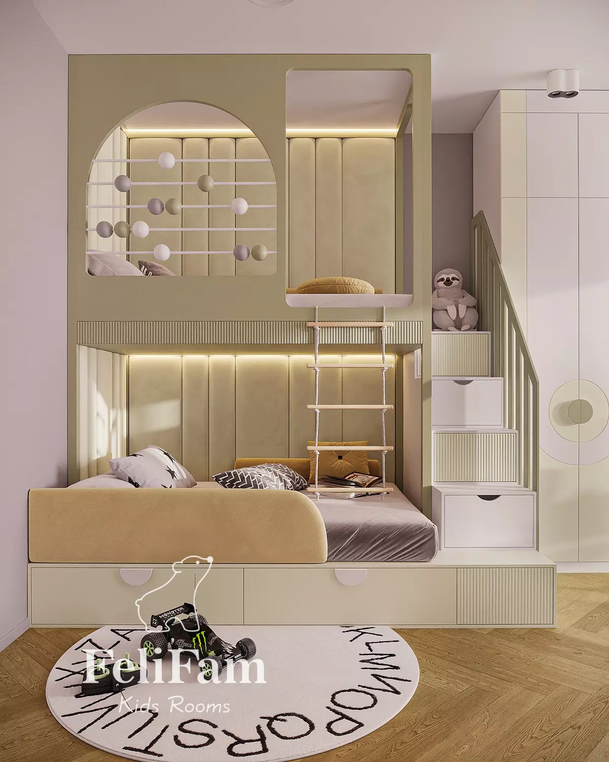 This kids’ room design by FeliFam takes into account the child’s individual needs, offering practicality and aesthetics in every detail.