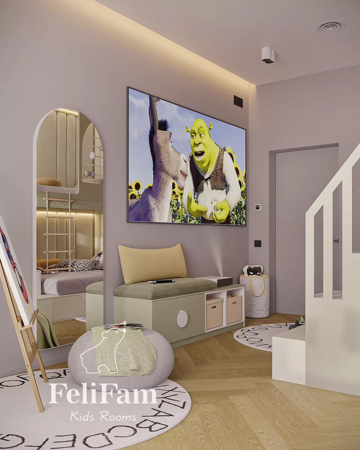 Soft tones create a cozy atmosphere, while functional storage systems, built-in wardrobes, and unique open shelves help keep things organized. The design combines comfort, style, and child development.