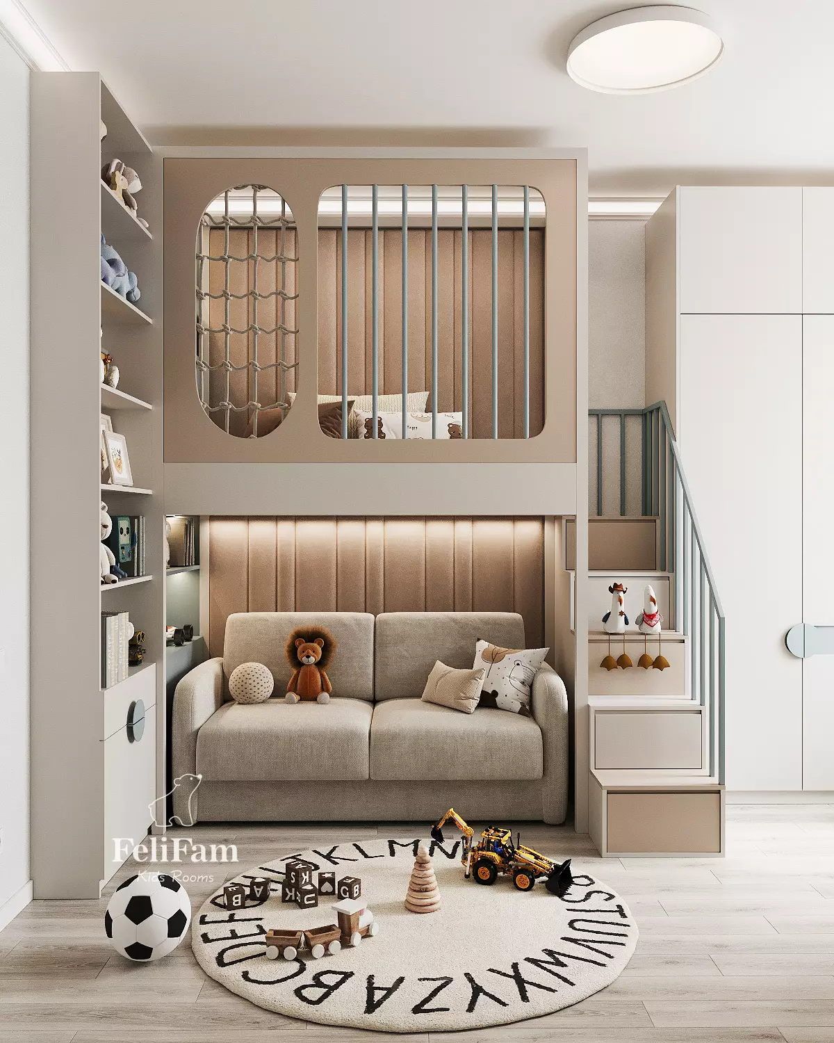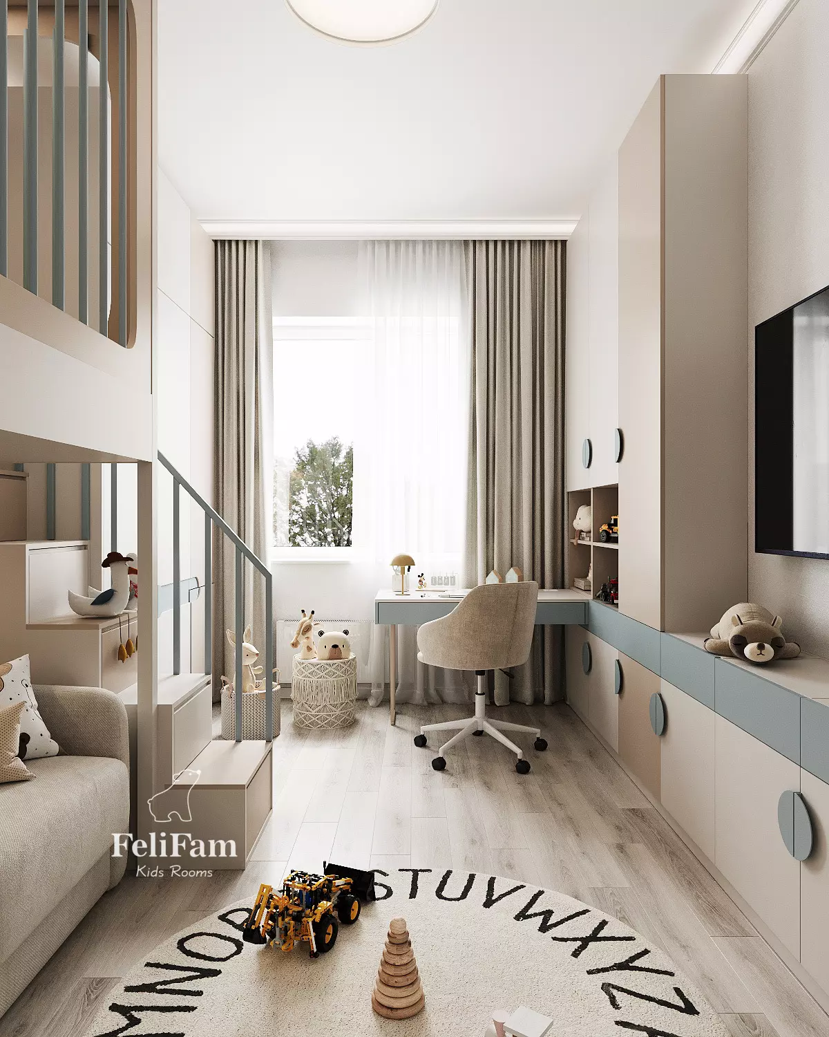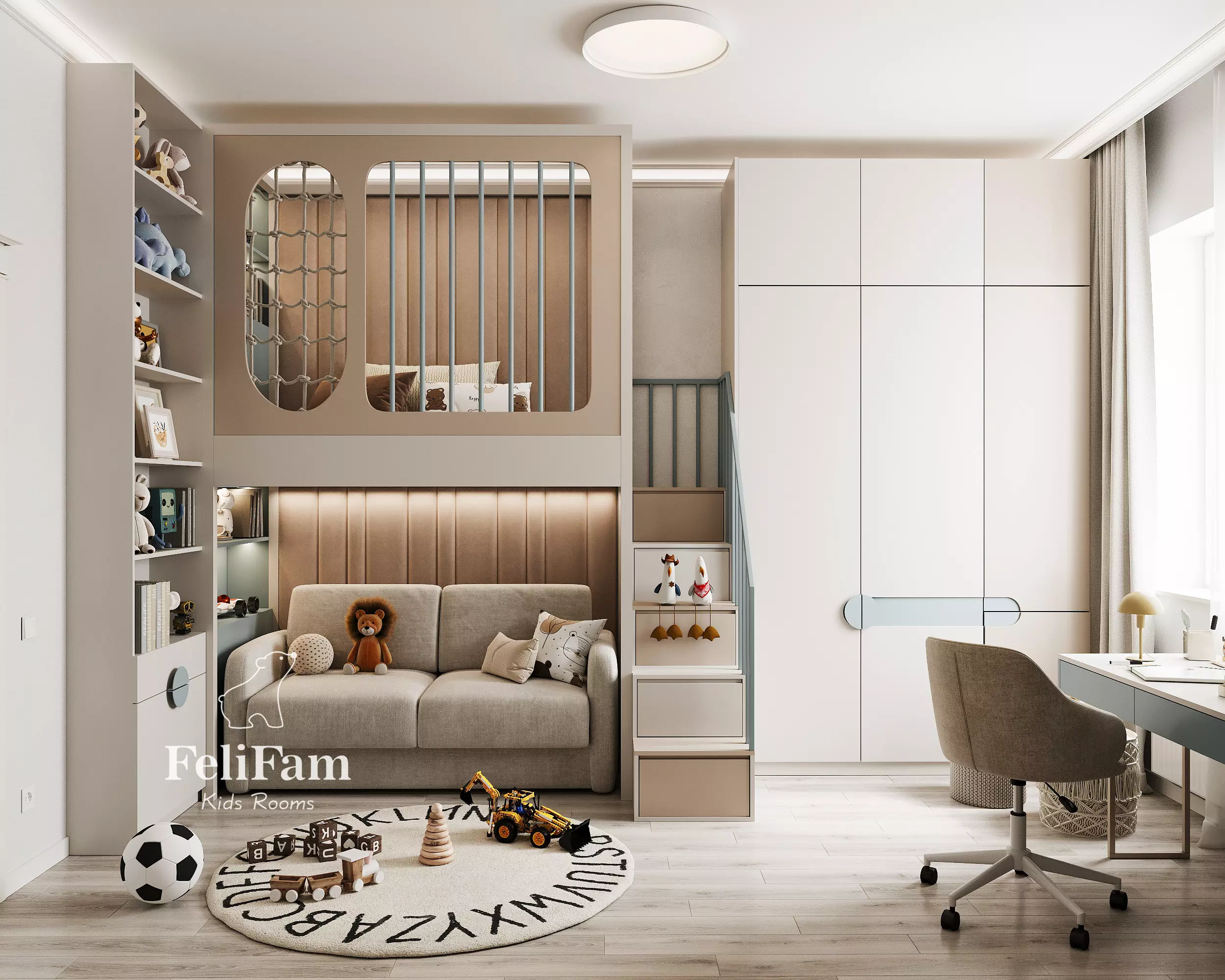 The kids’ room design by FeliFam is created for a boy, combining comfort and style. The bunk bed, with a sofa on the lower level and a sleeping area on the upper level, ensures practical use of space. The desk is seamlessly integrated into the design, providing a convenient area for study and creativity.