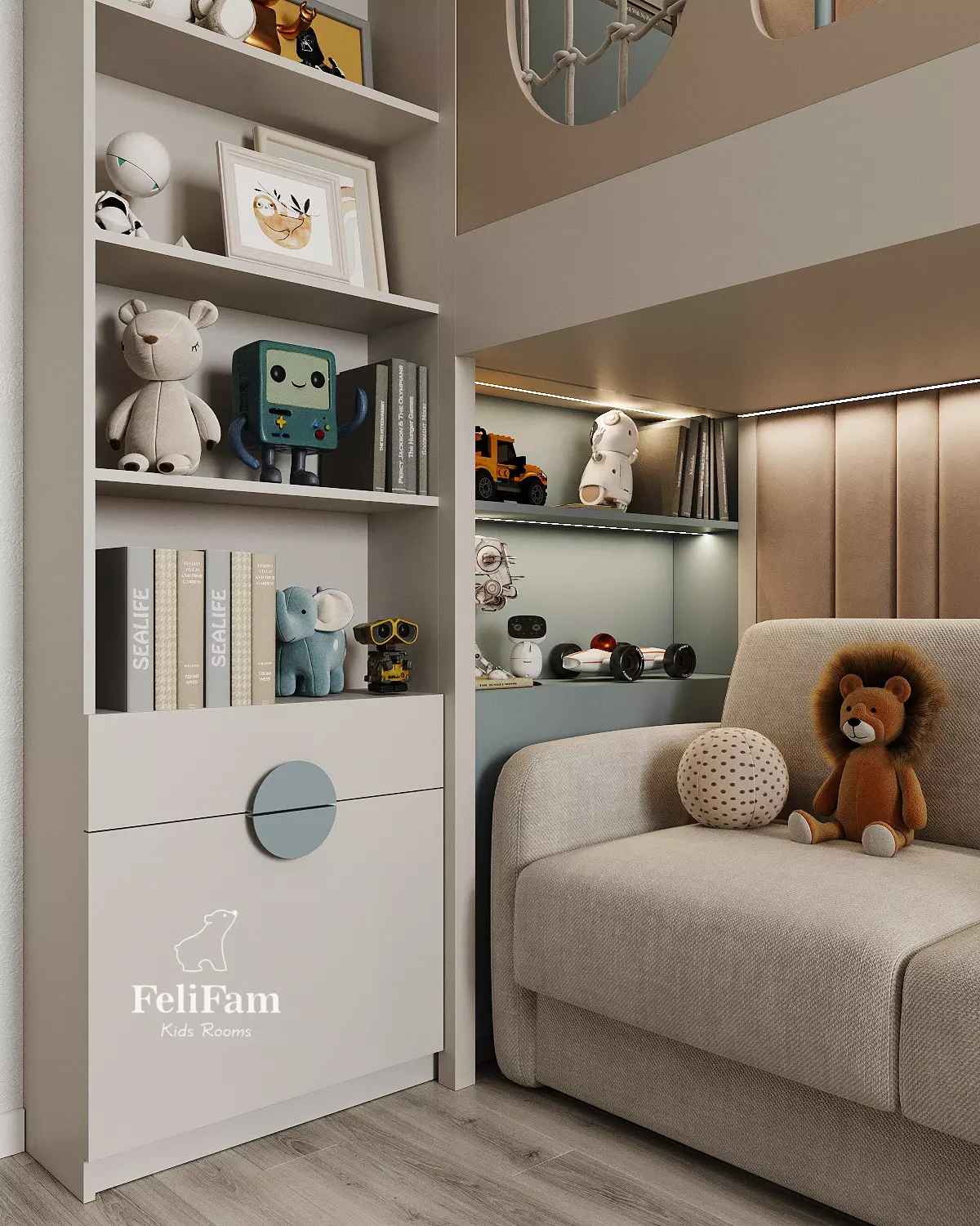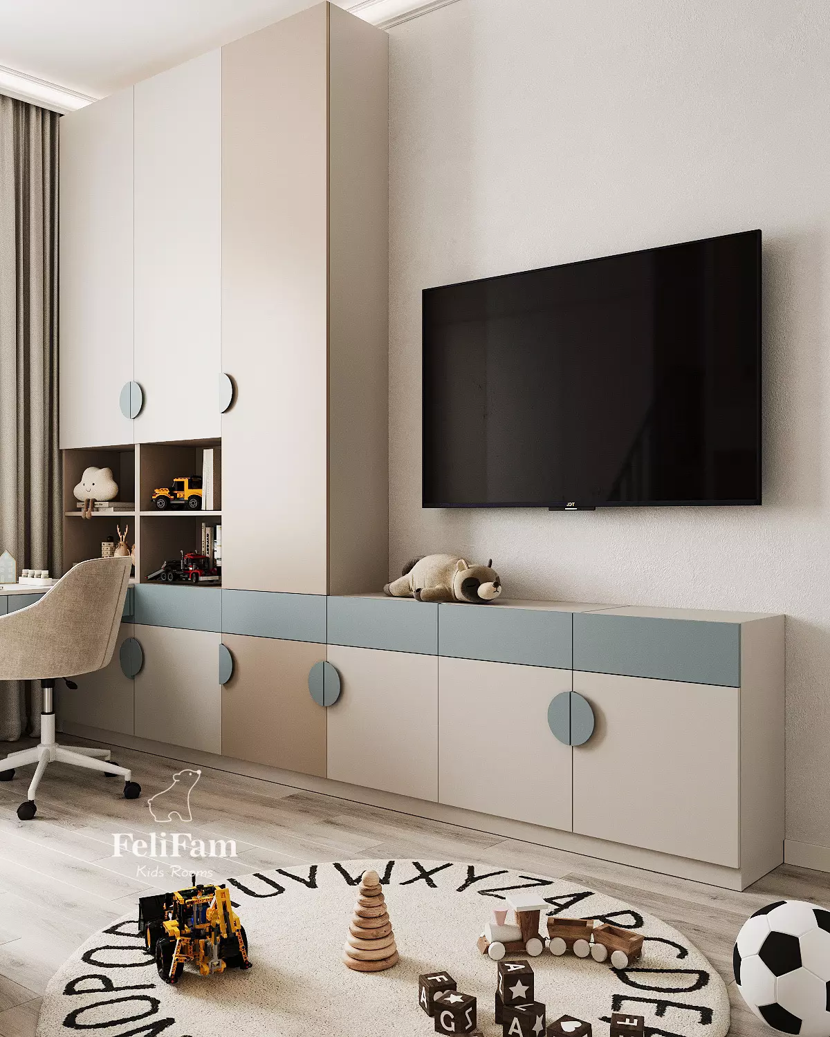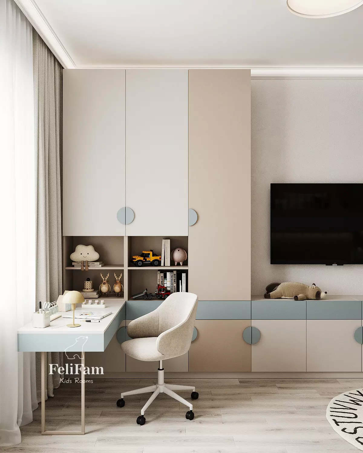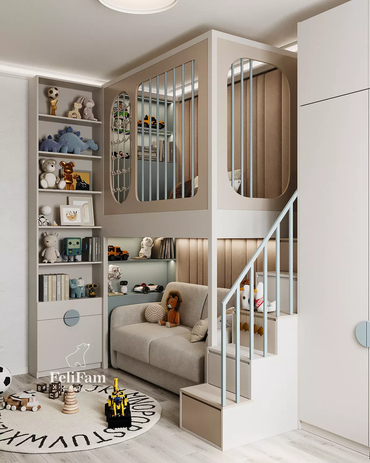 The kids’ room design by FeliFam is created for a boy, combining comfort and style. The bunk bed, with a sofa on the lower level and a sleeping area on the upper level, ensures practical use of space. The desk is seamlessly integrated into the design, providing a convenient area for study and creativity.