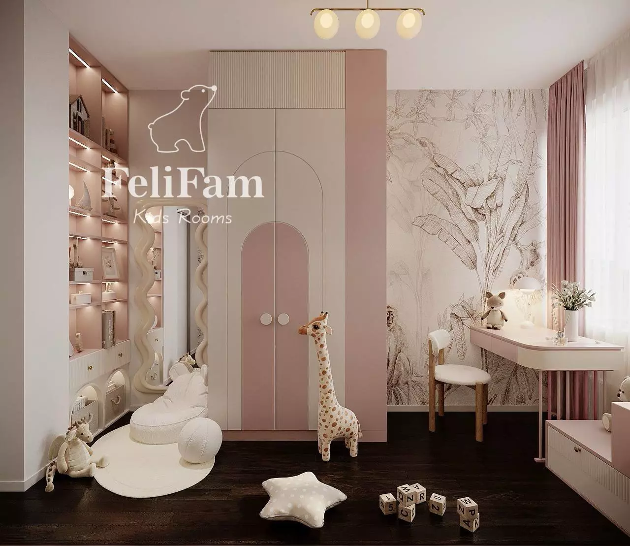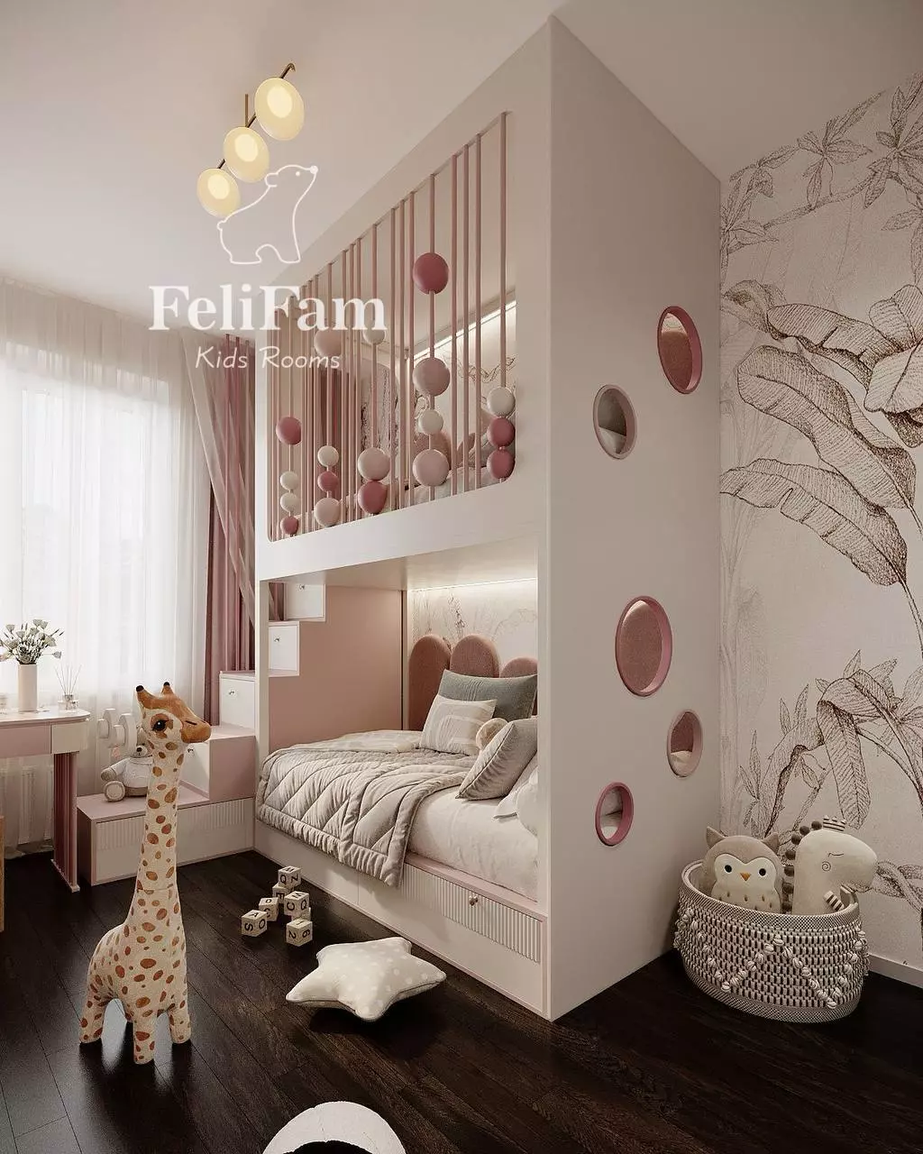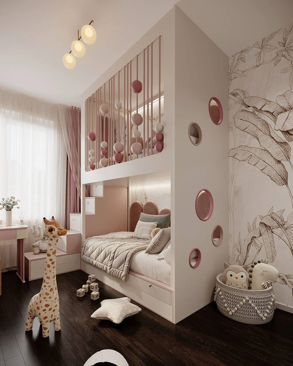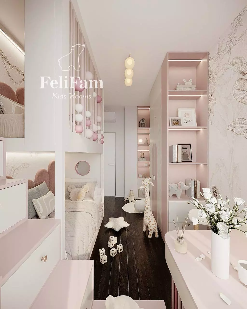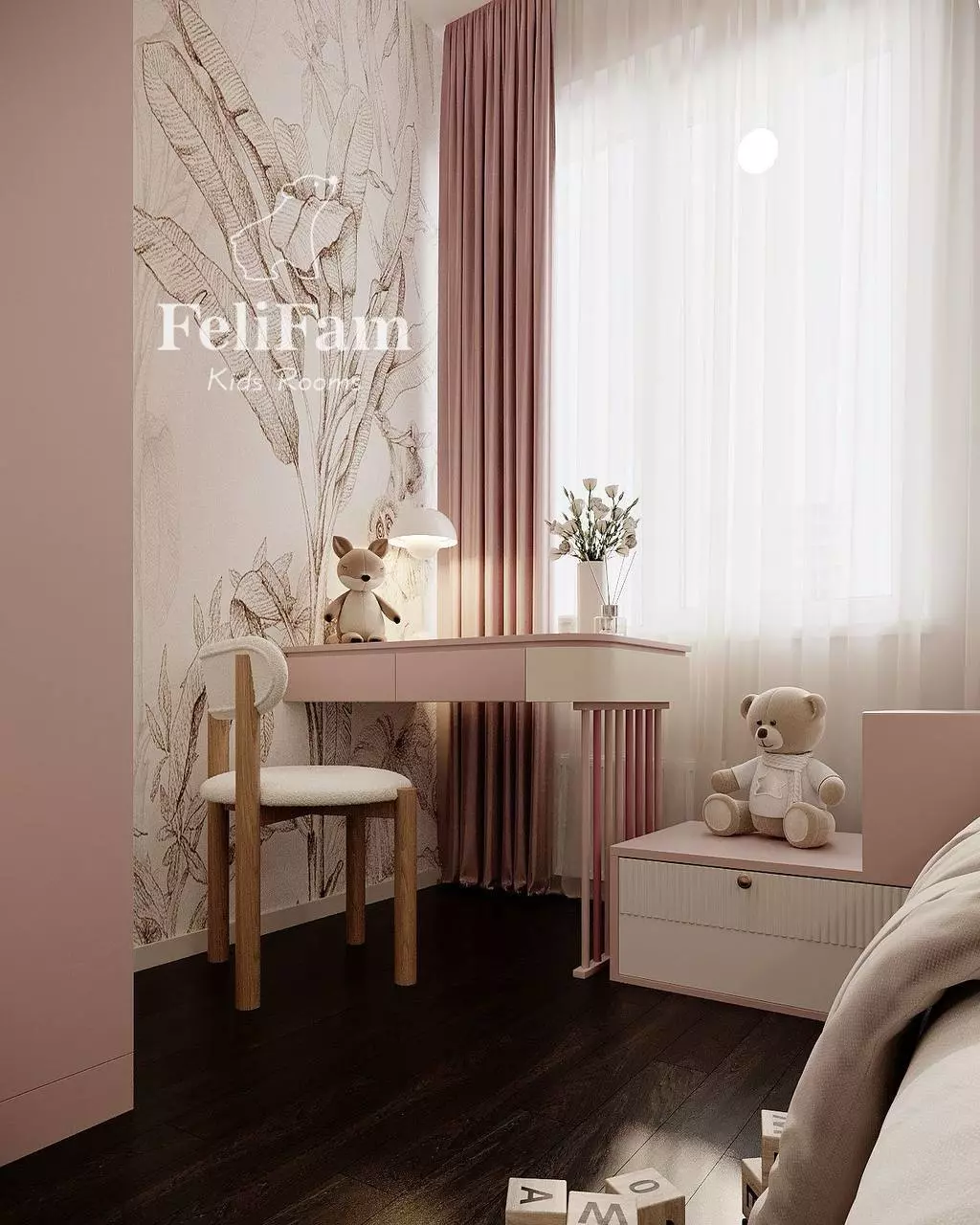 This small kids’ room combines practicality and aesthetics, creating a comfortable space for play and learning.