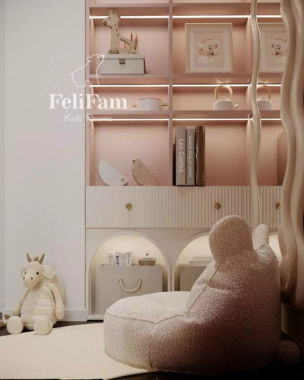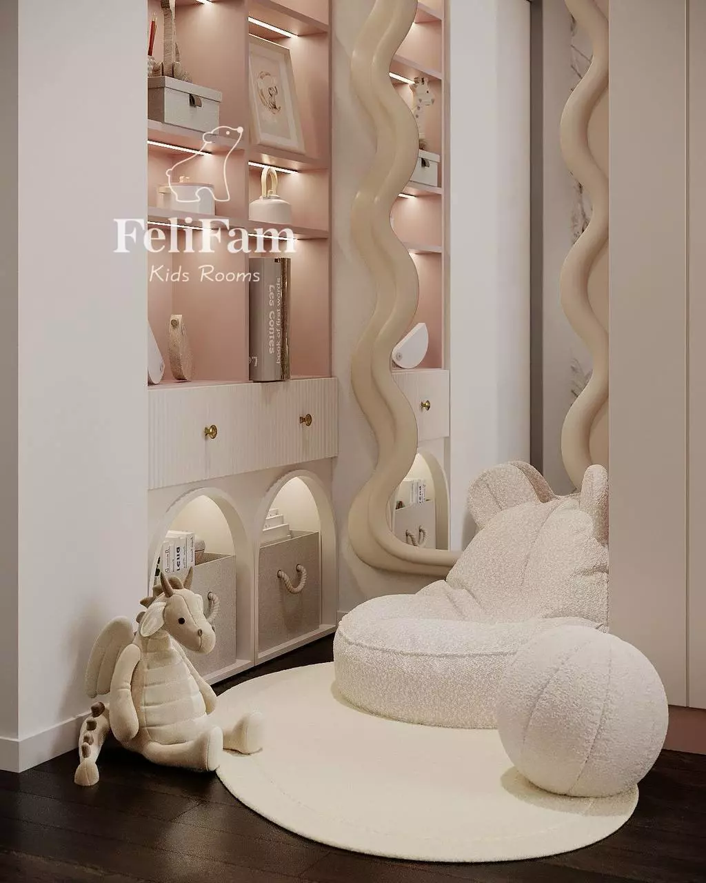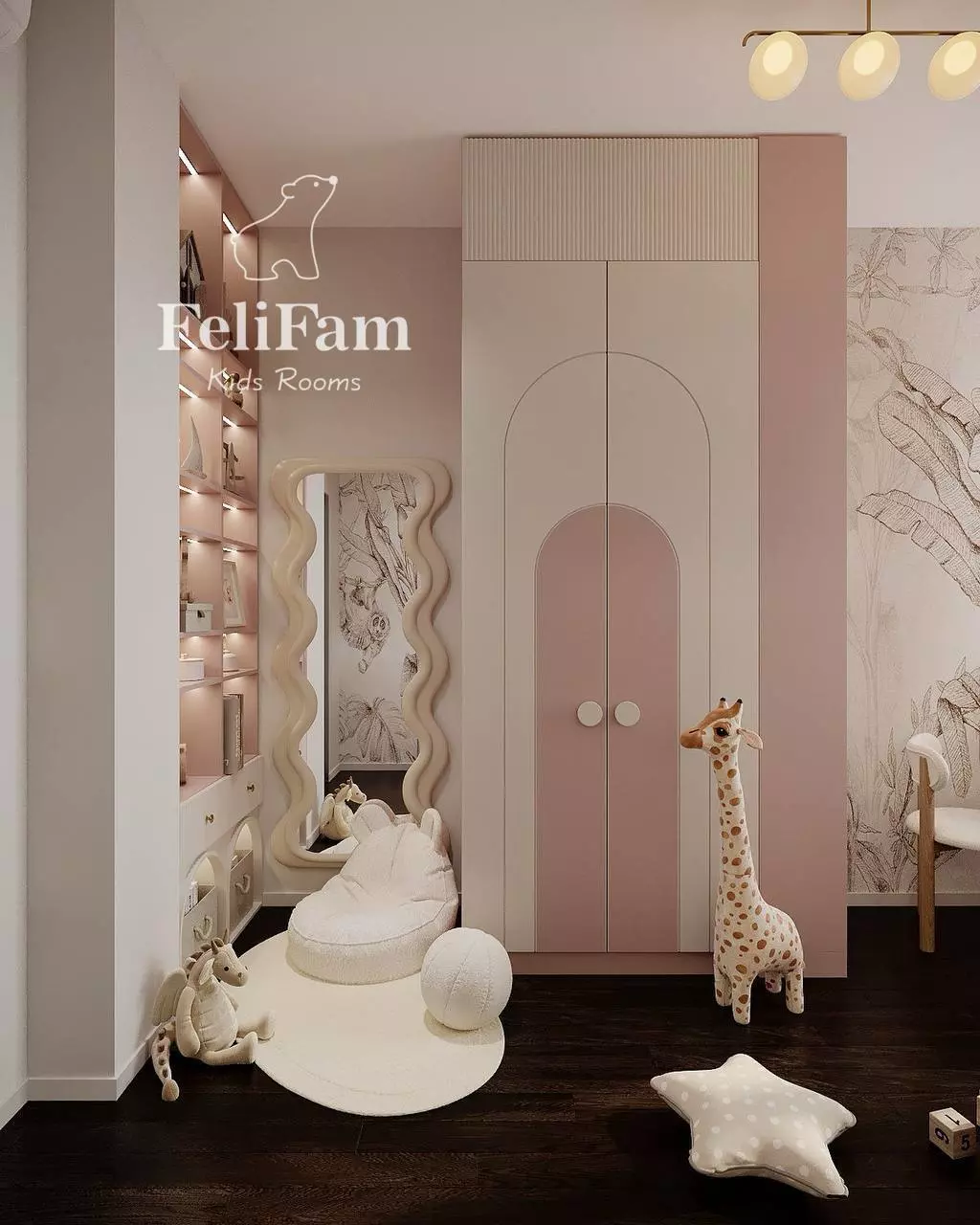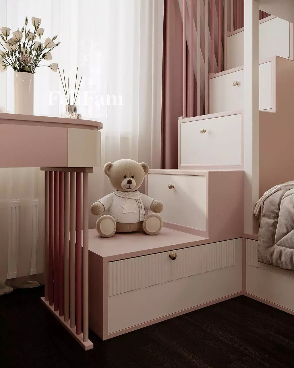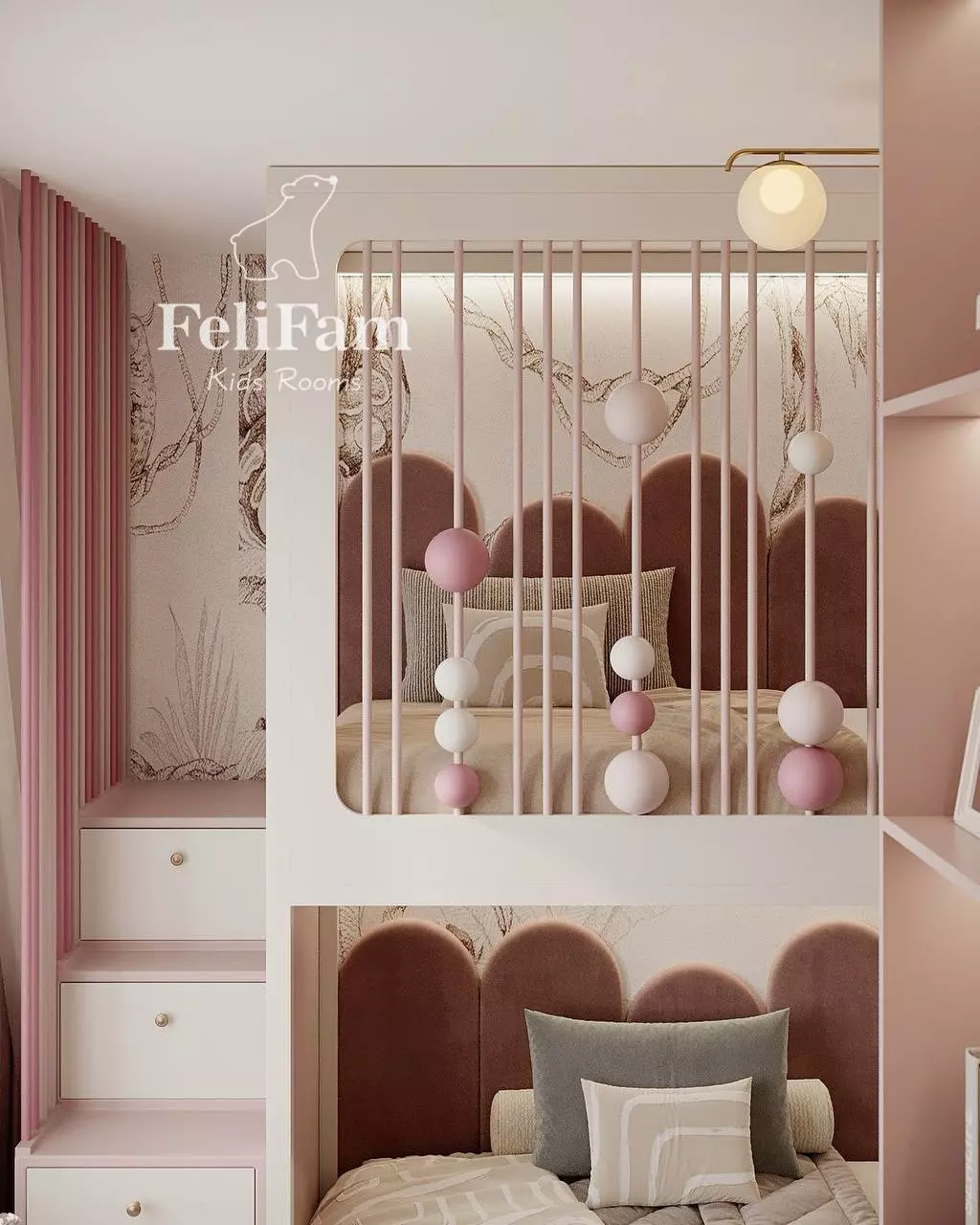 This 10 sq. m. kids’ room project demonstrates how a compact space can be organized for maximum functionality. The bunk structure with a bed, wardrobe, and work area efficiently utilizes every meter. The steps include storage compartments, while open shelves with lighting and a mirror with a decorative frame add style and coziness.