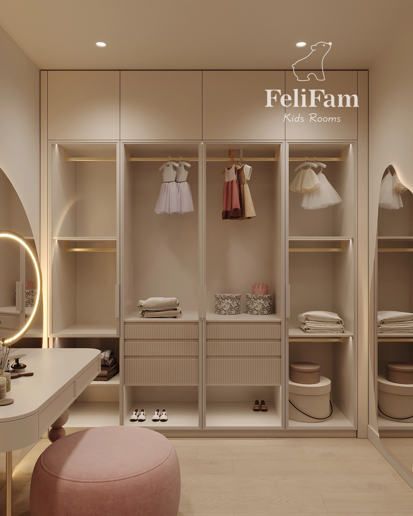 A walk-in closet for a girl measuring 8 m² impresses with its thoughtful combination of style and functionality. Open and closed shelves provide convenient storage, while cabinets with textured fronts add elegance. A vanity table and mirrors create a cozy atmosphere for daily routines.