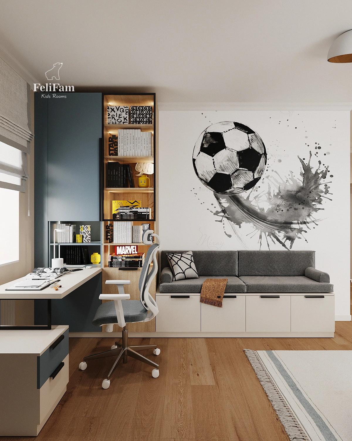 The kids’ room project for a boy, measuring 25 m², combines style and comfort even with a non-standard layout. The corner window has been transformed into a cozy play and relaxation area with soft mats, creating an atmosphere of joy and safety.