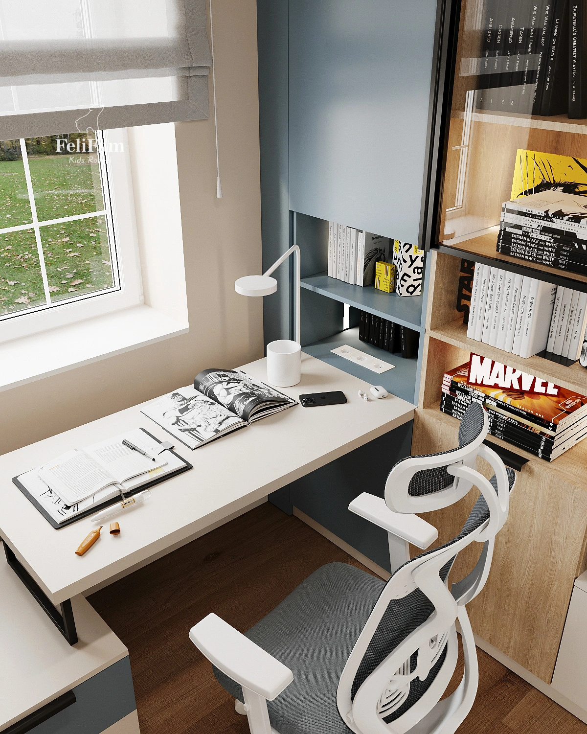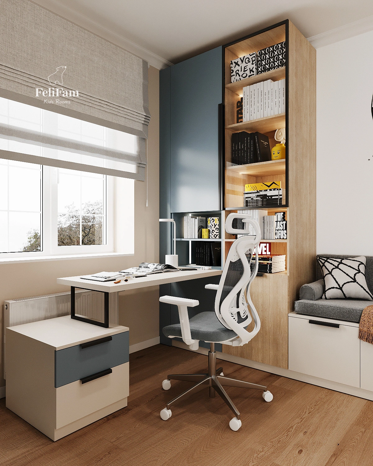 A desk with drawers and open shelves organizes the space for study and creativity. Soft blue-gray tones paired with accent wallpaper and veneered furniture fronts add a touch of modernity and harmony.