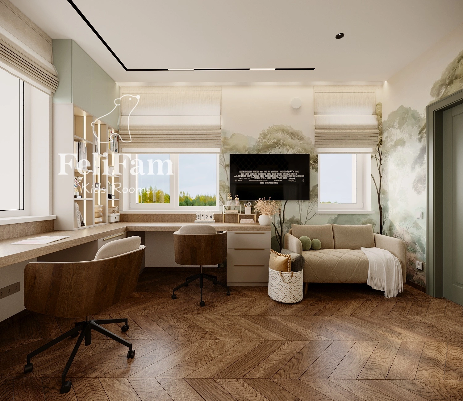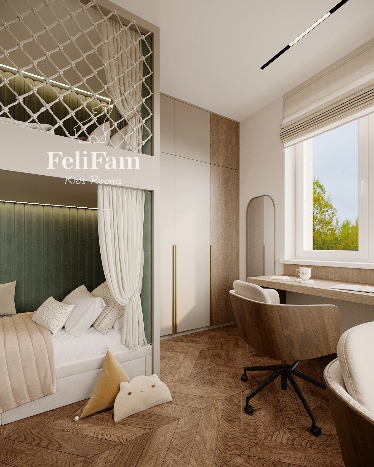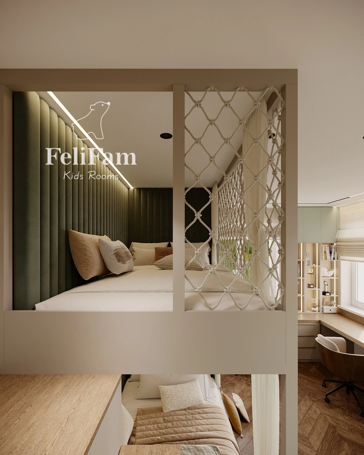 The interior is styled in natural tones, with built-in wardrobes and open shelving for optimal storage. This shared bedroom combines functionality and style, providing a comfortable and cozy space for play, study, and personal growth.