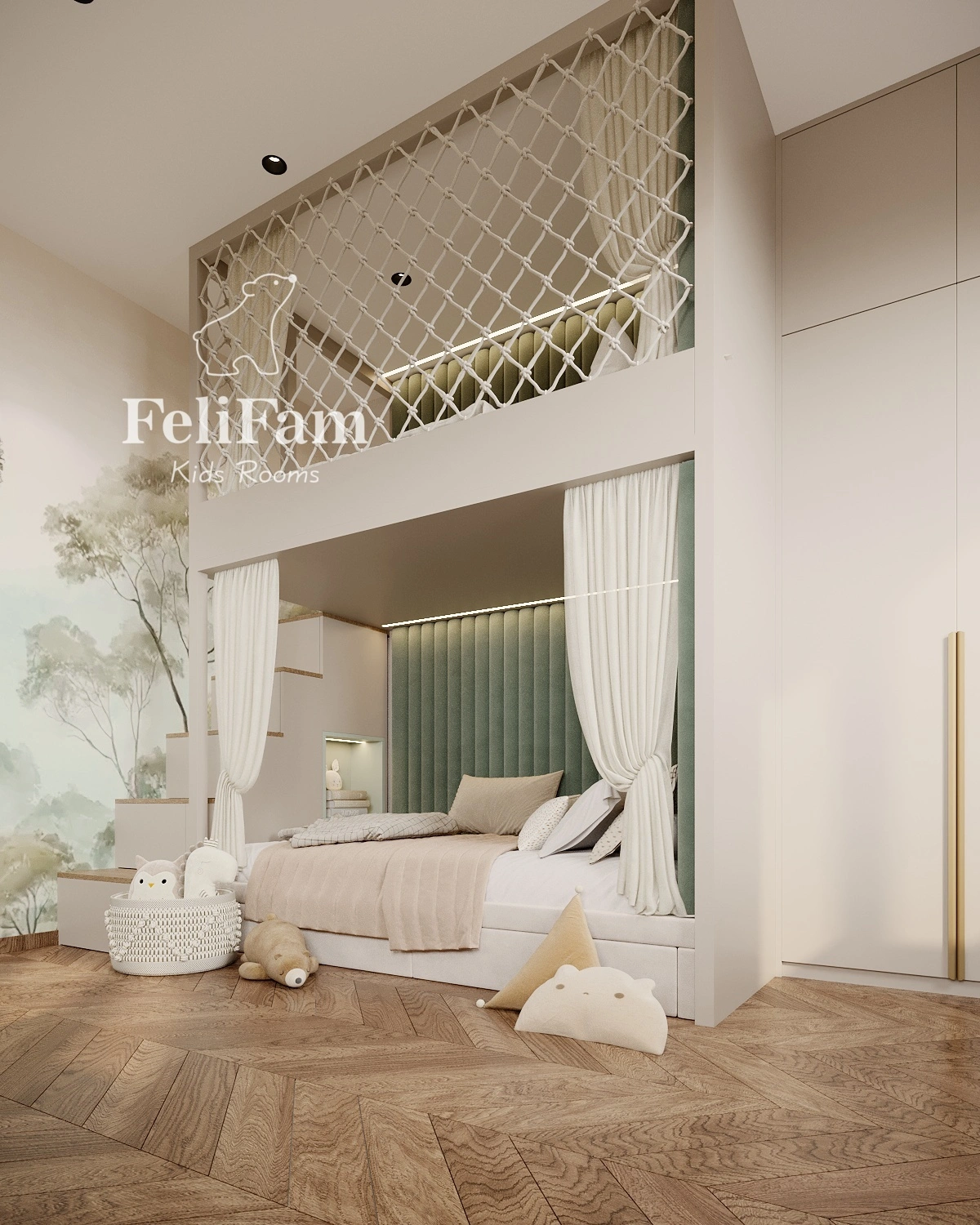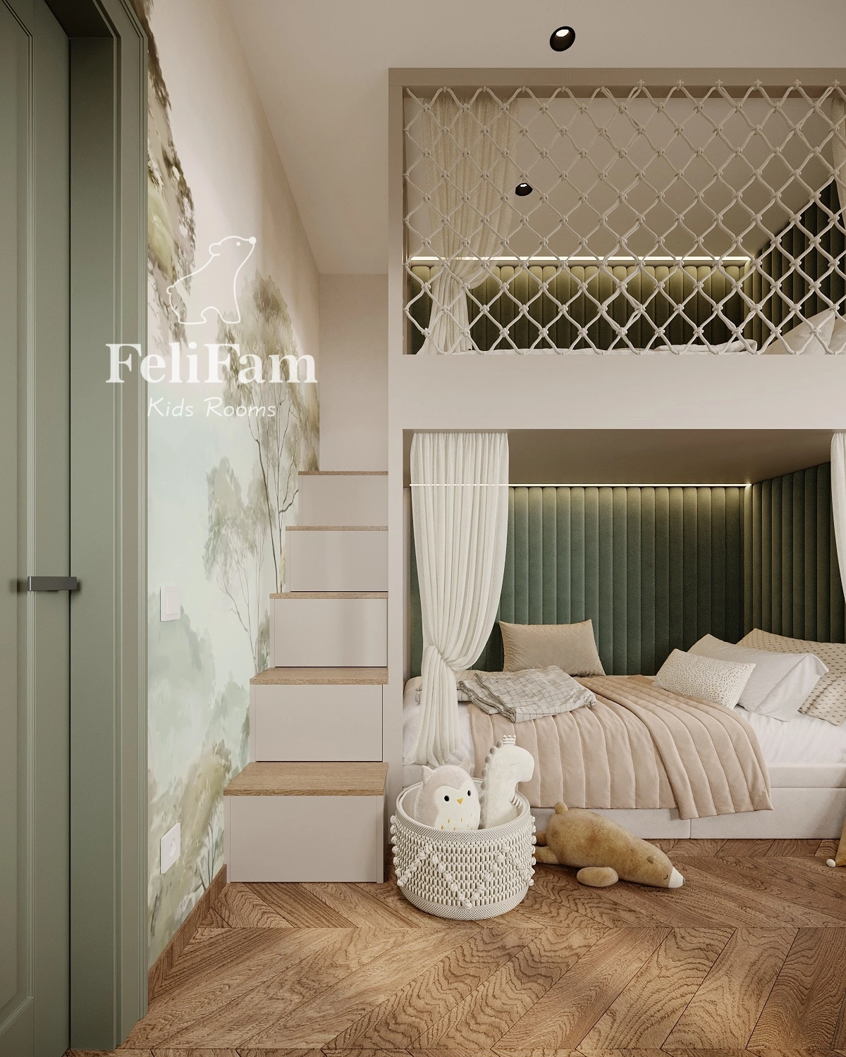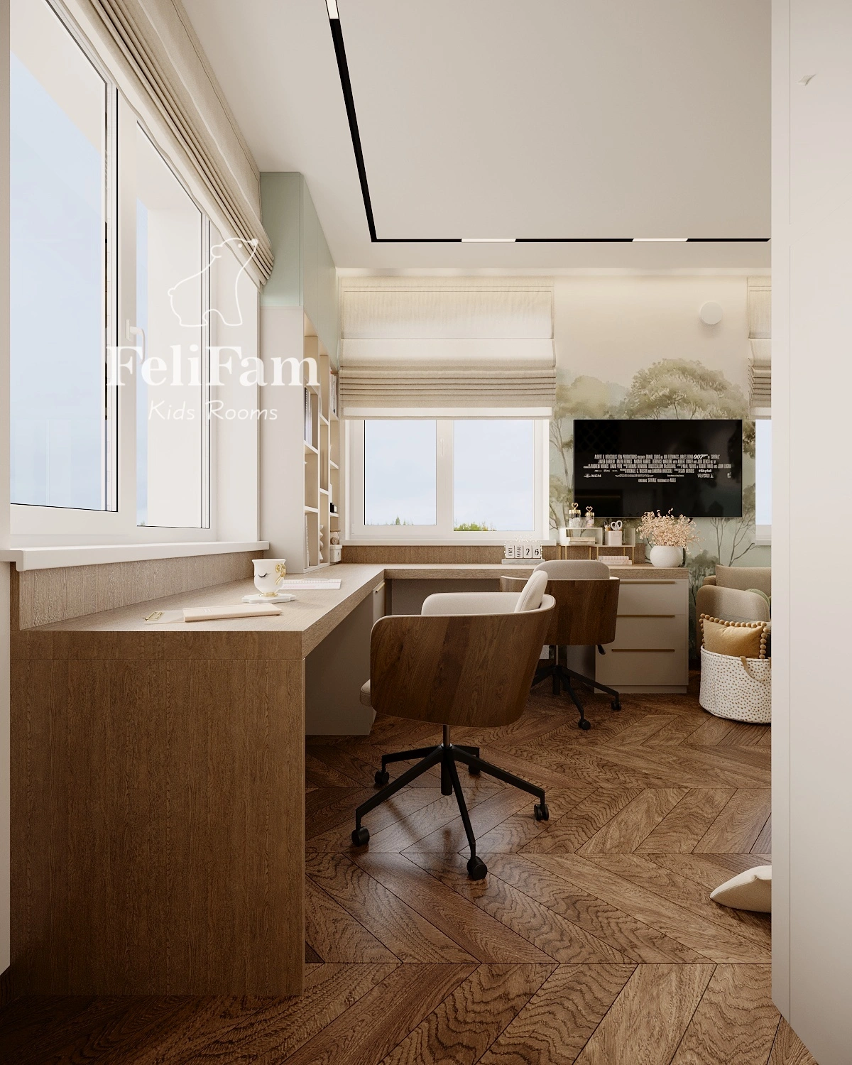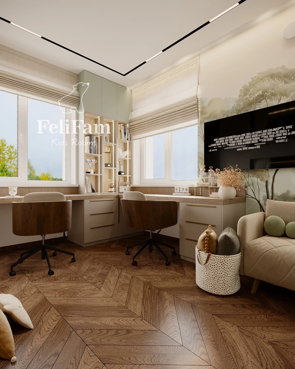 The interior is styled in natural tones, with built-in wardrobes and open shelving for optimal storage. This shared bedroom combines functionality and style, providing a comfortable and cozy space for play, study, and personal growth.