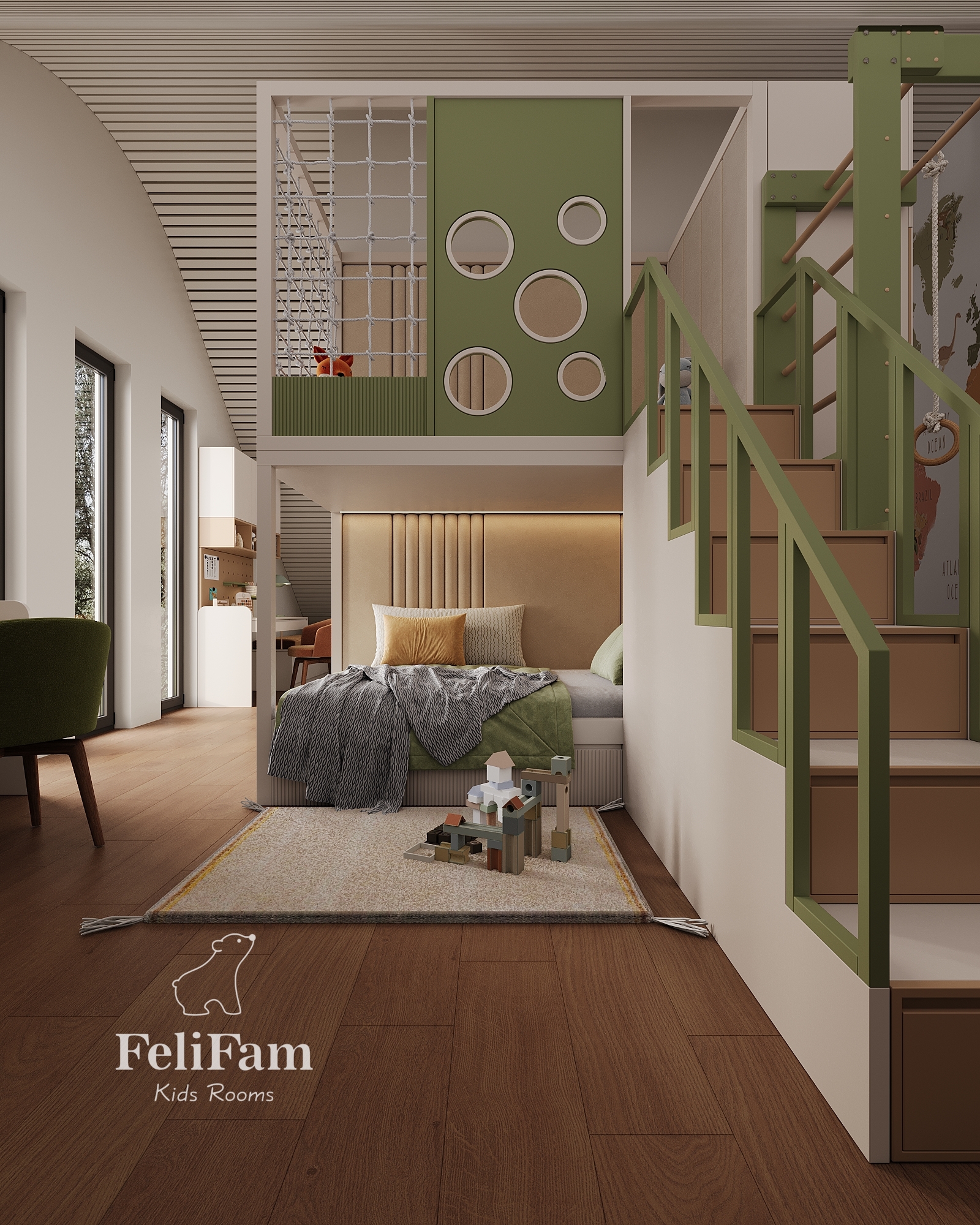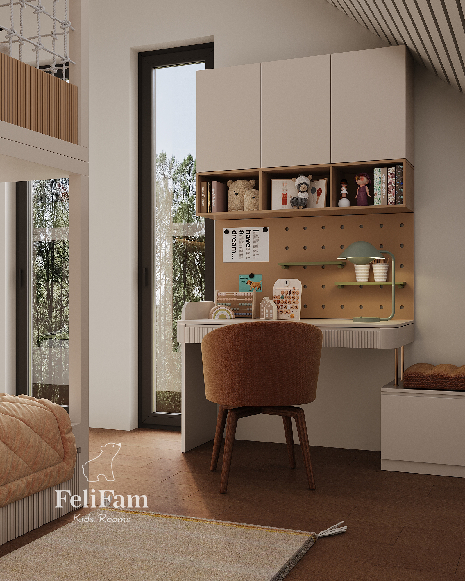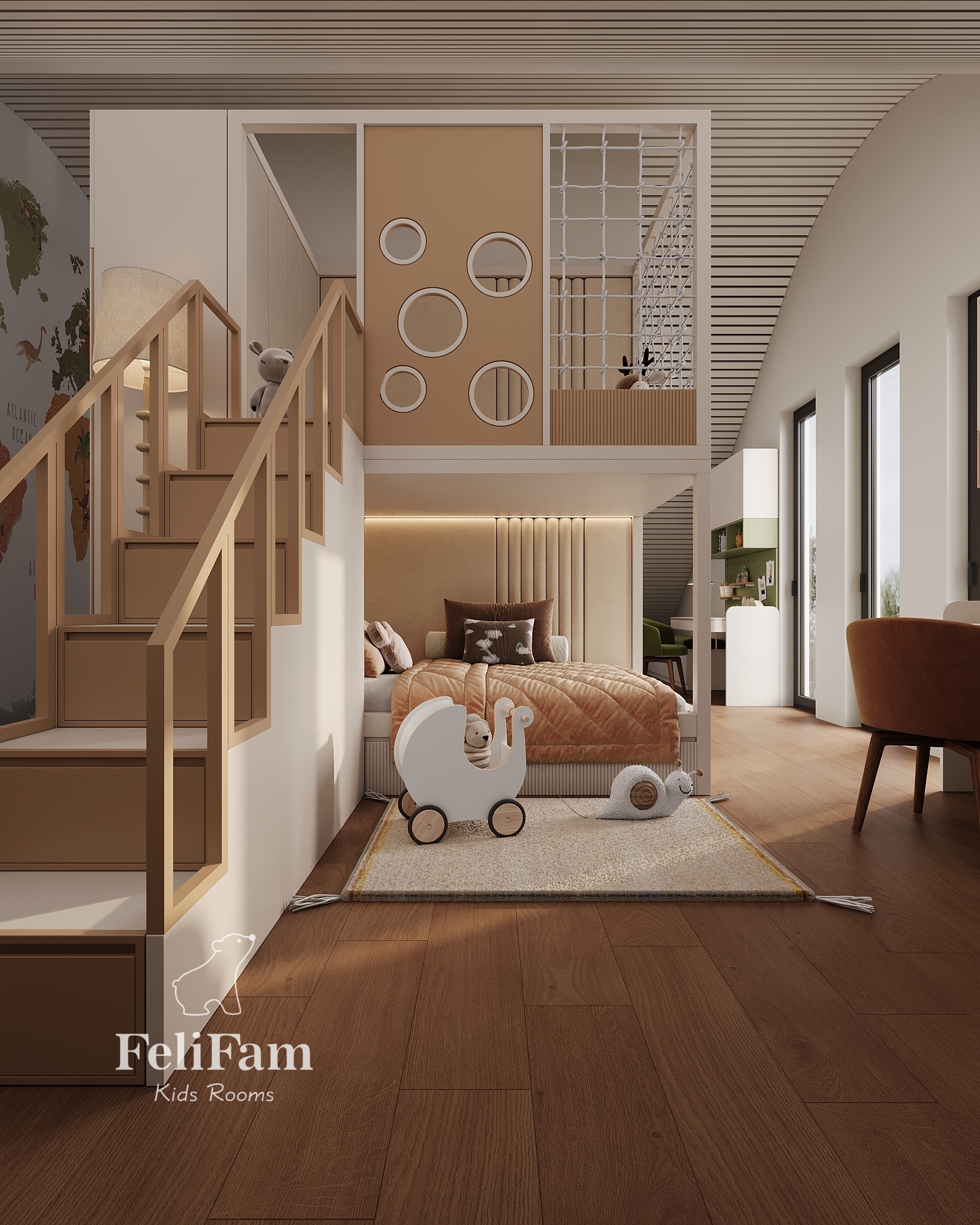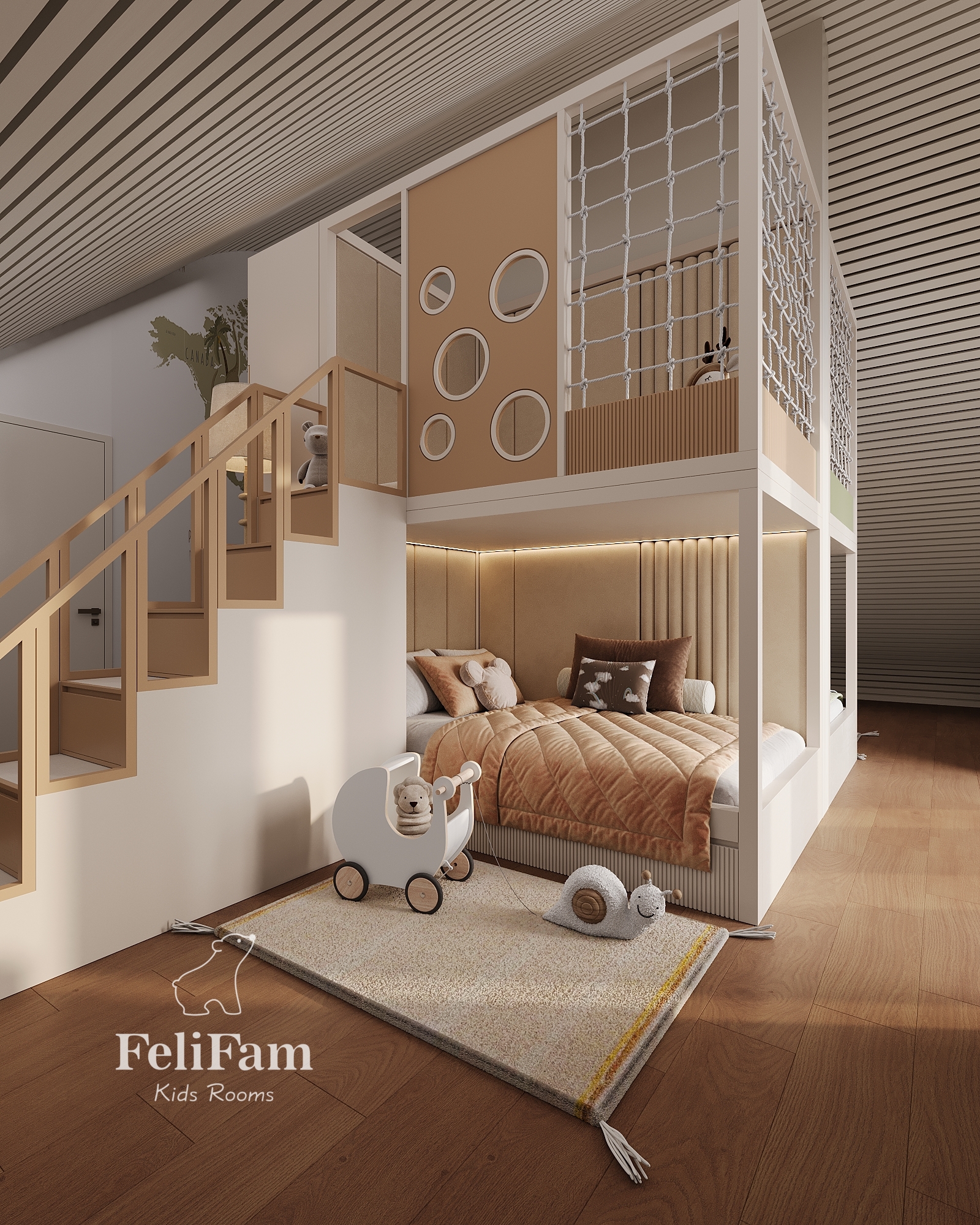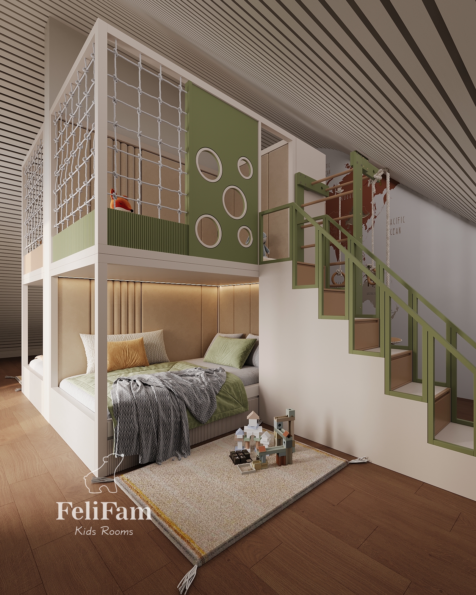 The designers introduced a unique solution — a double-sided bunk structure that divides the room into two equal parts. On both sides, identical modules feature a bed below and a play area above, allowing each child to enjoy their own space for rest, play, and growth.