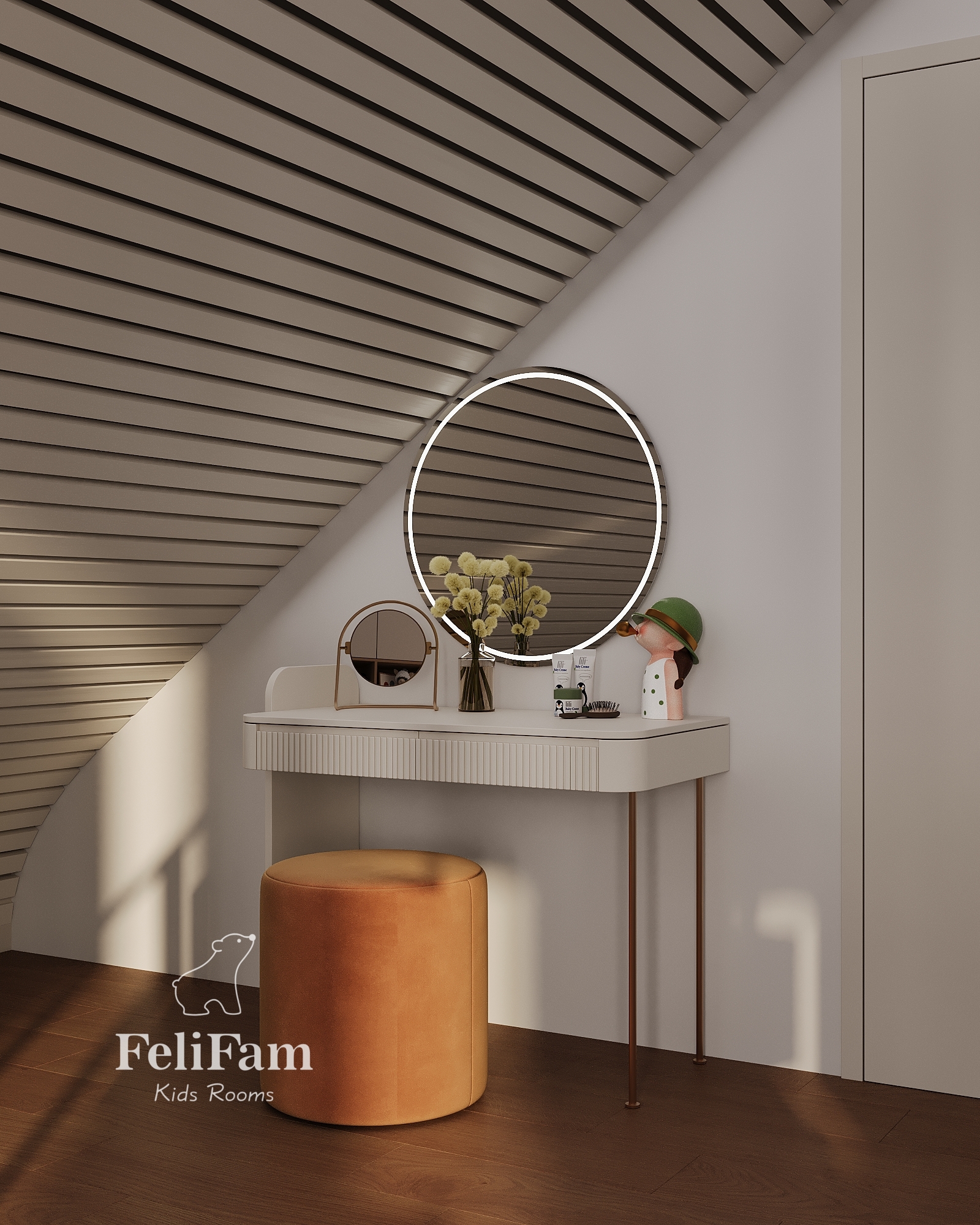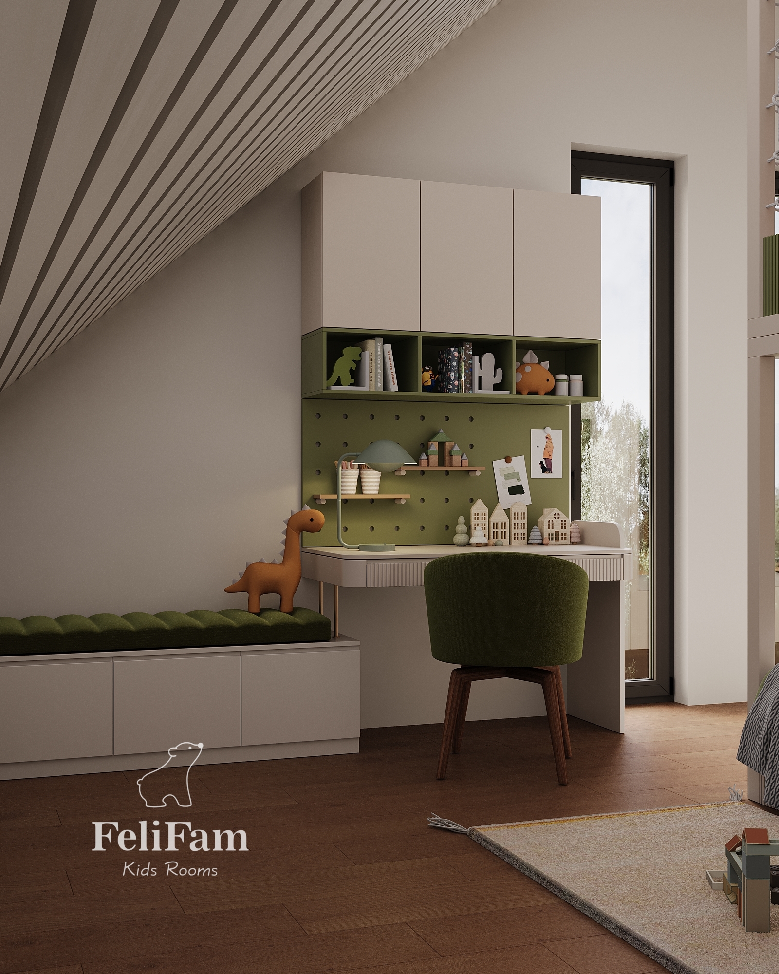 The room also includes two identical study areas and thoughtfully planned lighting. The design embraces a modern style with a forward-looking approach.