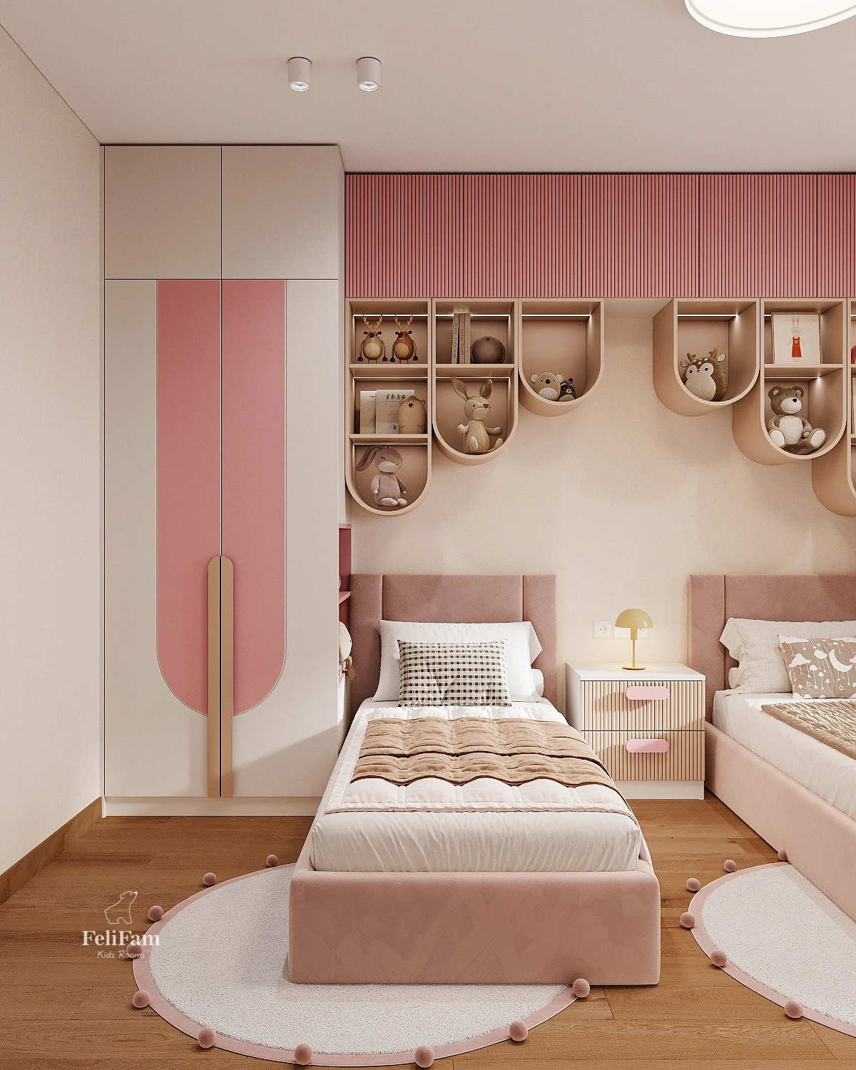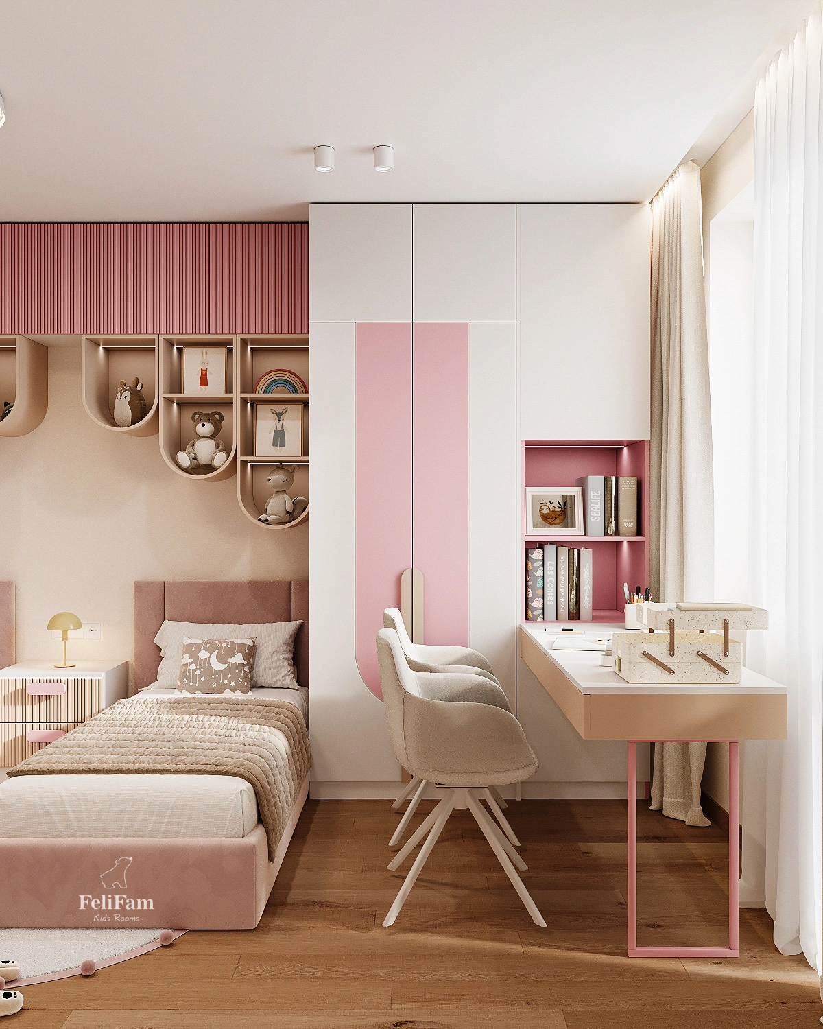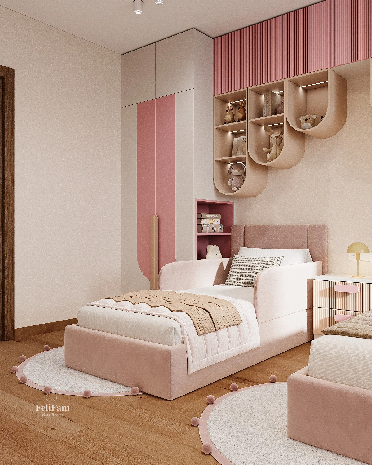 The incredible children’s pink bedroom design for two girls by FeliFam combines comfort, functionality, and style. The space is created in soft pink tones and thoughtfully tailored to the needs of two girls aged 7 and 2. One of the beds features removable soft bumpers to ensure safe sleep for the little one.