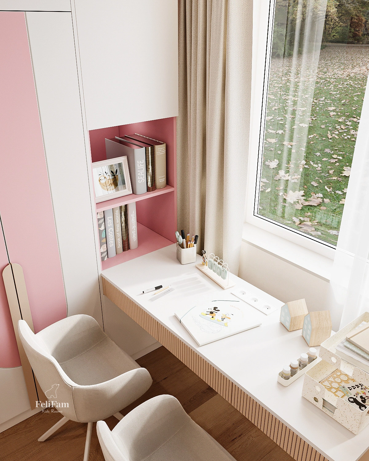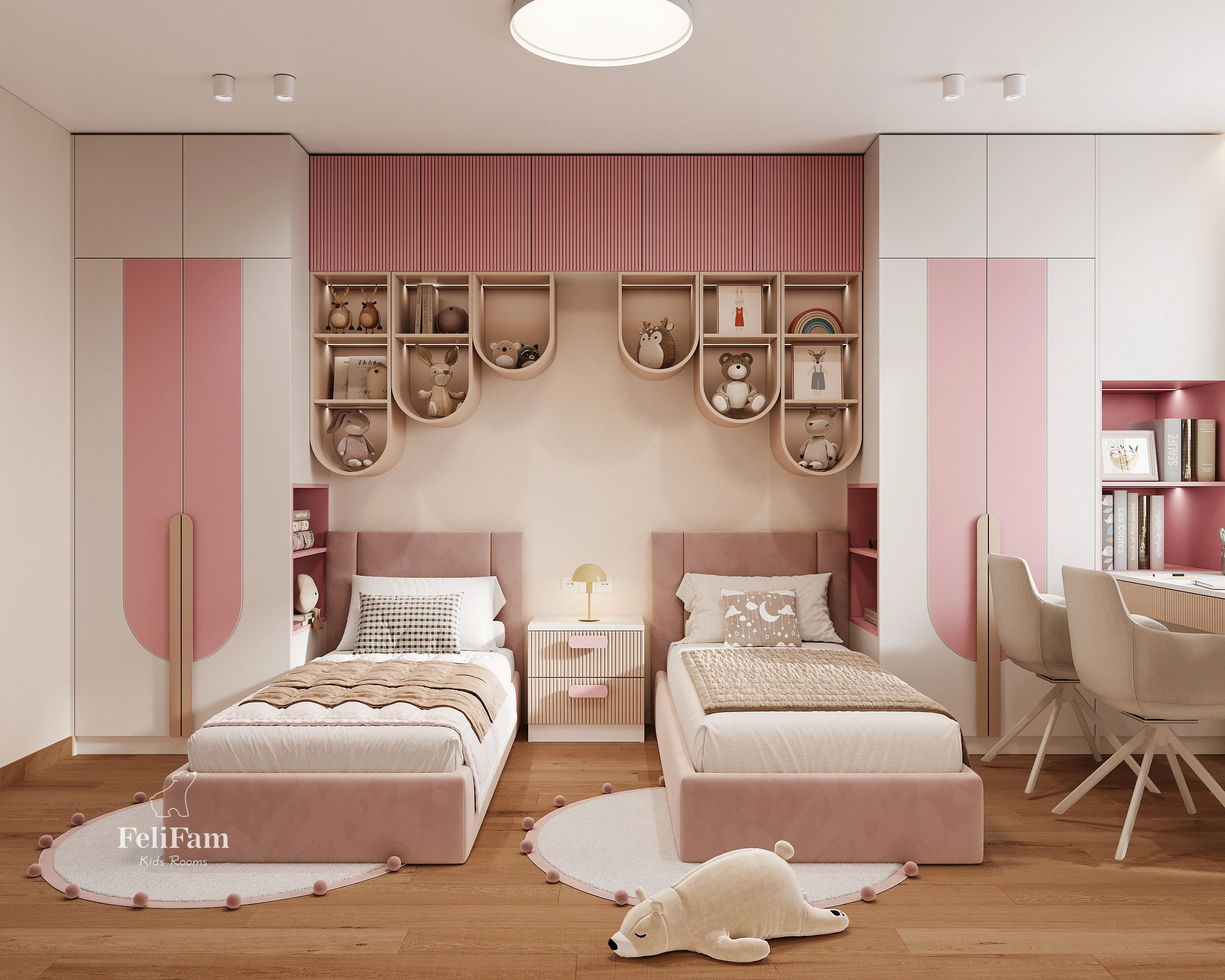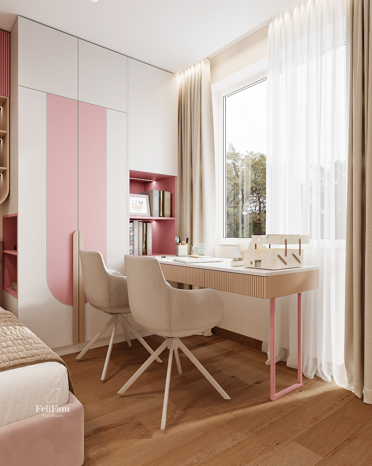 The incredible children’s pink bedroom design for two girls by FeliFam combines comfort, functionality, and style. The space is created in soft pink tones and thoughtfully tailored to the needs of two girls aged 7 and 2. One of the beds features removable soft bumpers to ensure safe sleep for the little one.