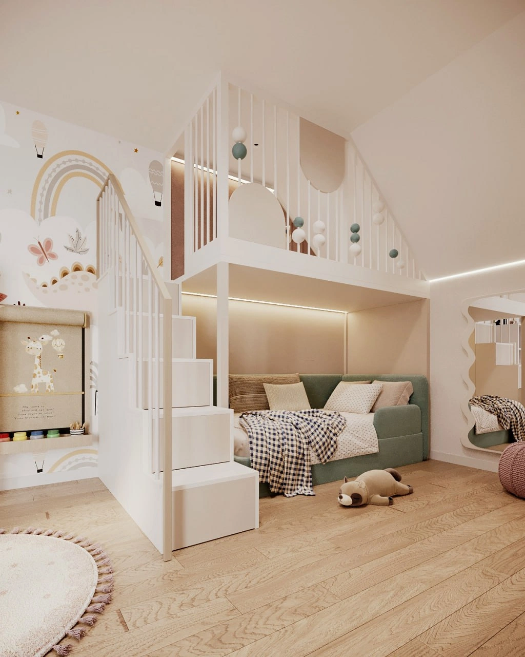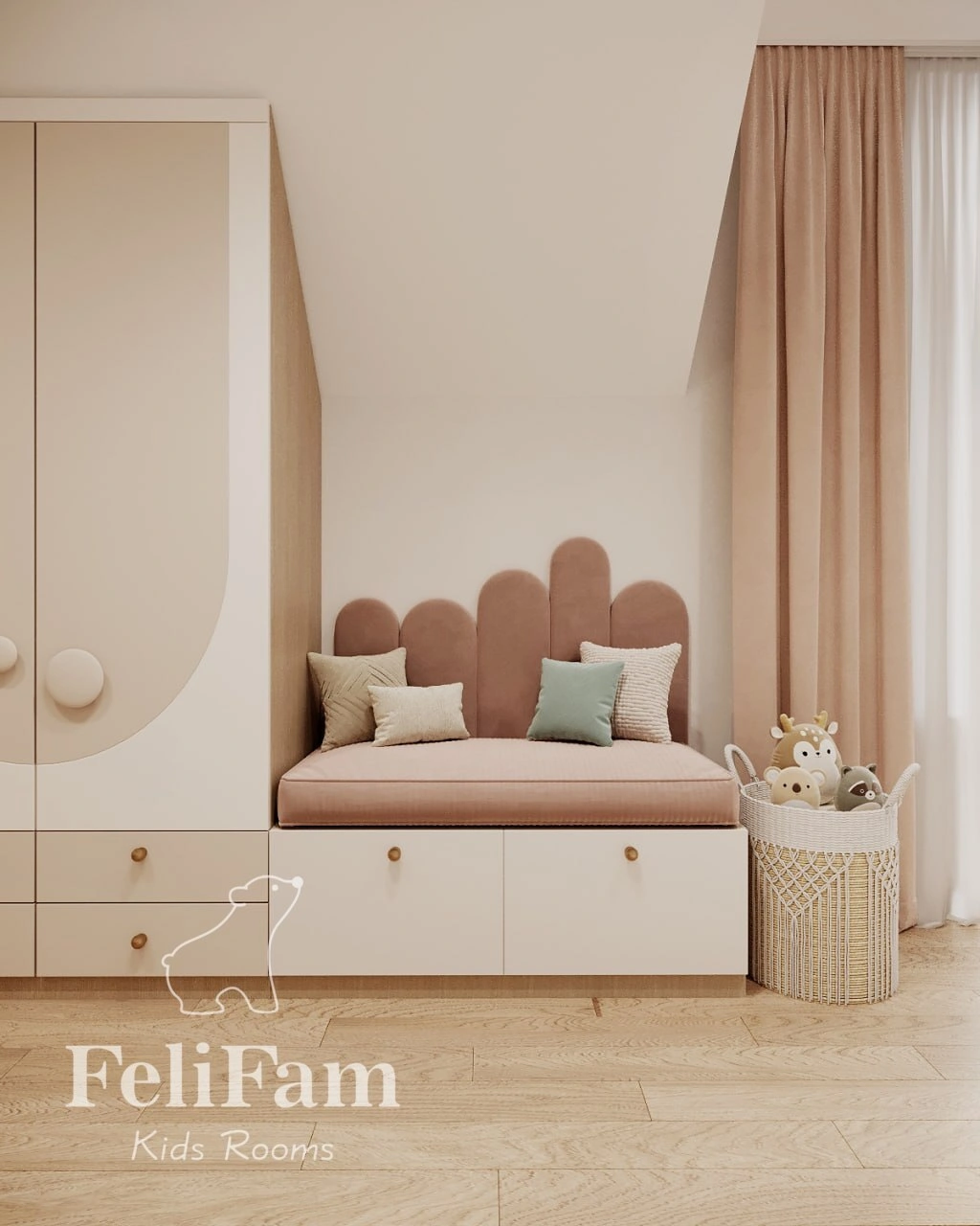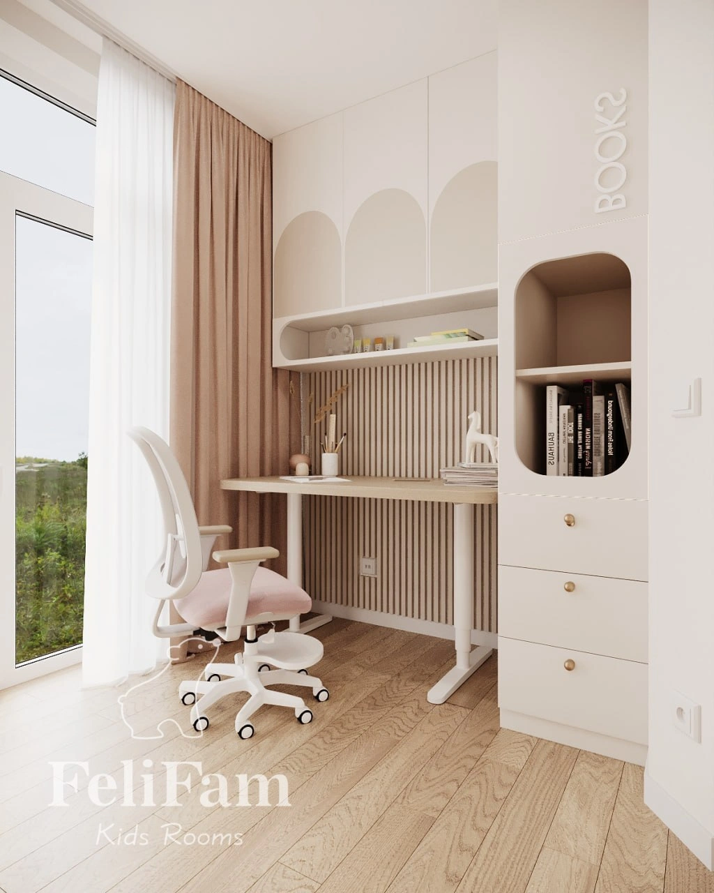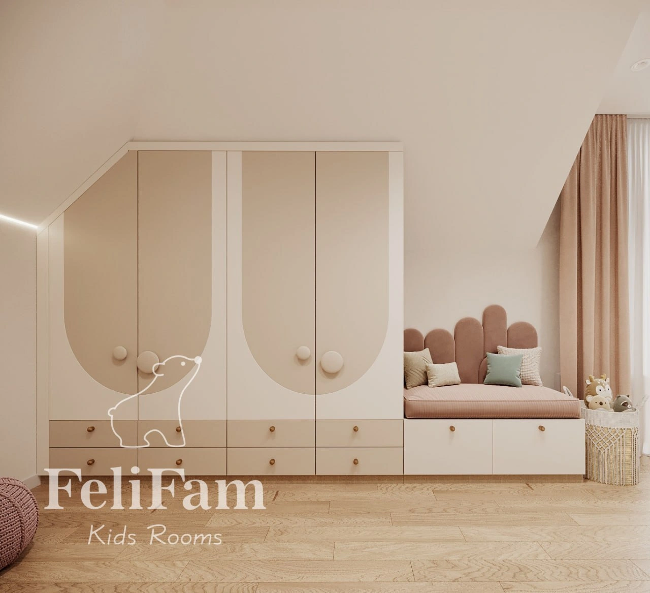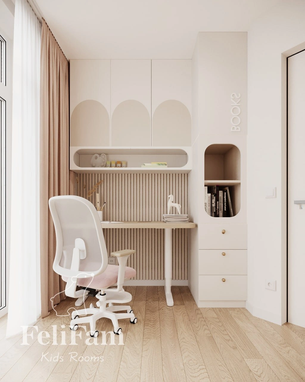 The study desk and custom furniture are adapted to the room’s non-standard ceiling, maximizing the use of space. The room’s design combines practicality with aesthetics, creating an atmosphere for learning, creativity, and development. Every element is carefully planned to meet the girl’s needs, ensuring comfort and functionality for years to come.