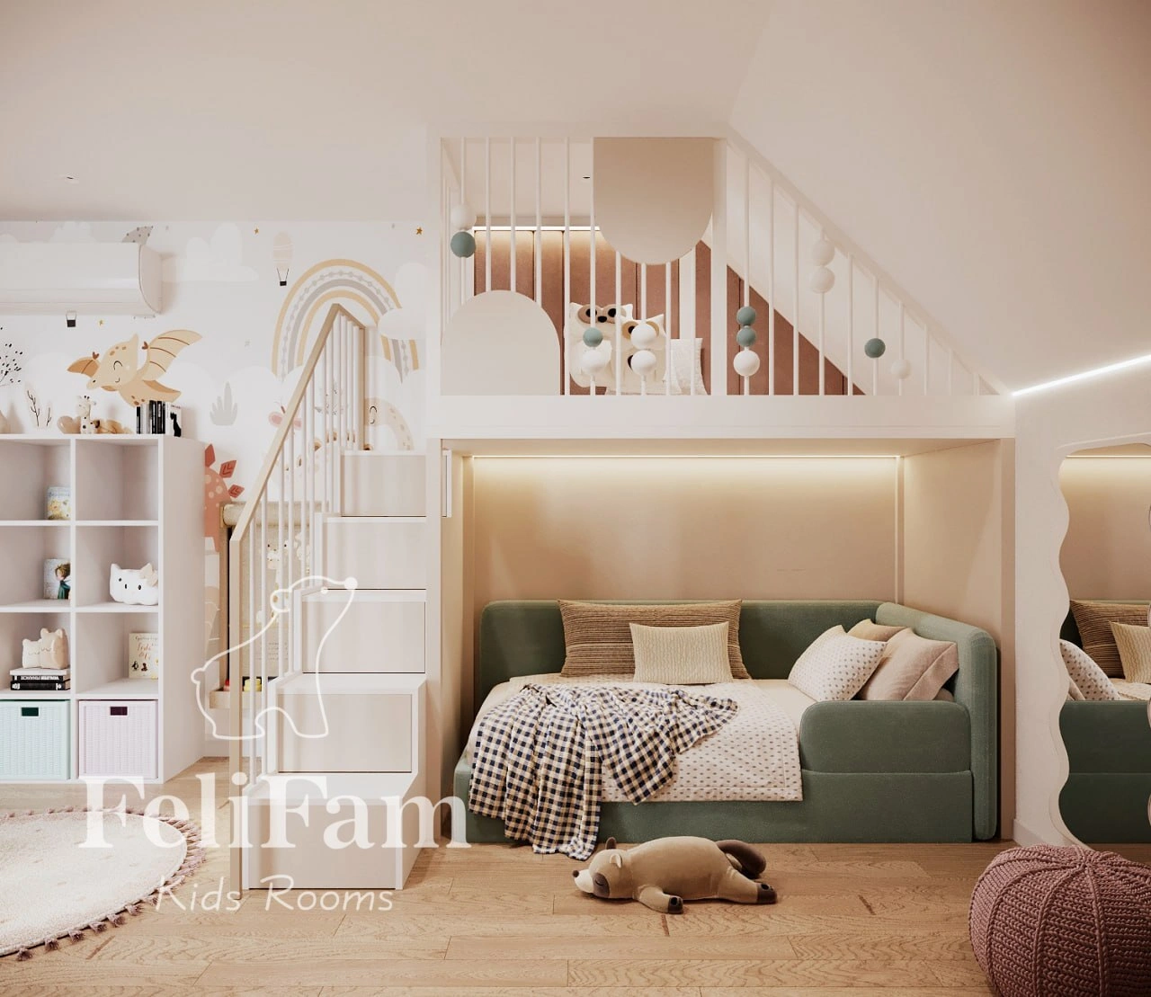 This 18 sq. m kids’ room for a 5-year-old girl is designed with a focus on comfort and safety. The bed features a soft safety railing, while the second level is dedicated to a play area, making the space both functional and engaging for the child. Thoughtful zoning ensures easy access to all furniture, allowing the child to play and relax in a safe environment.