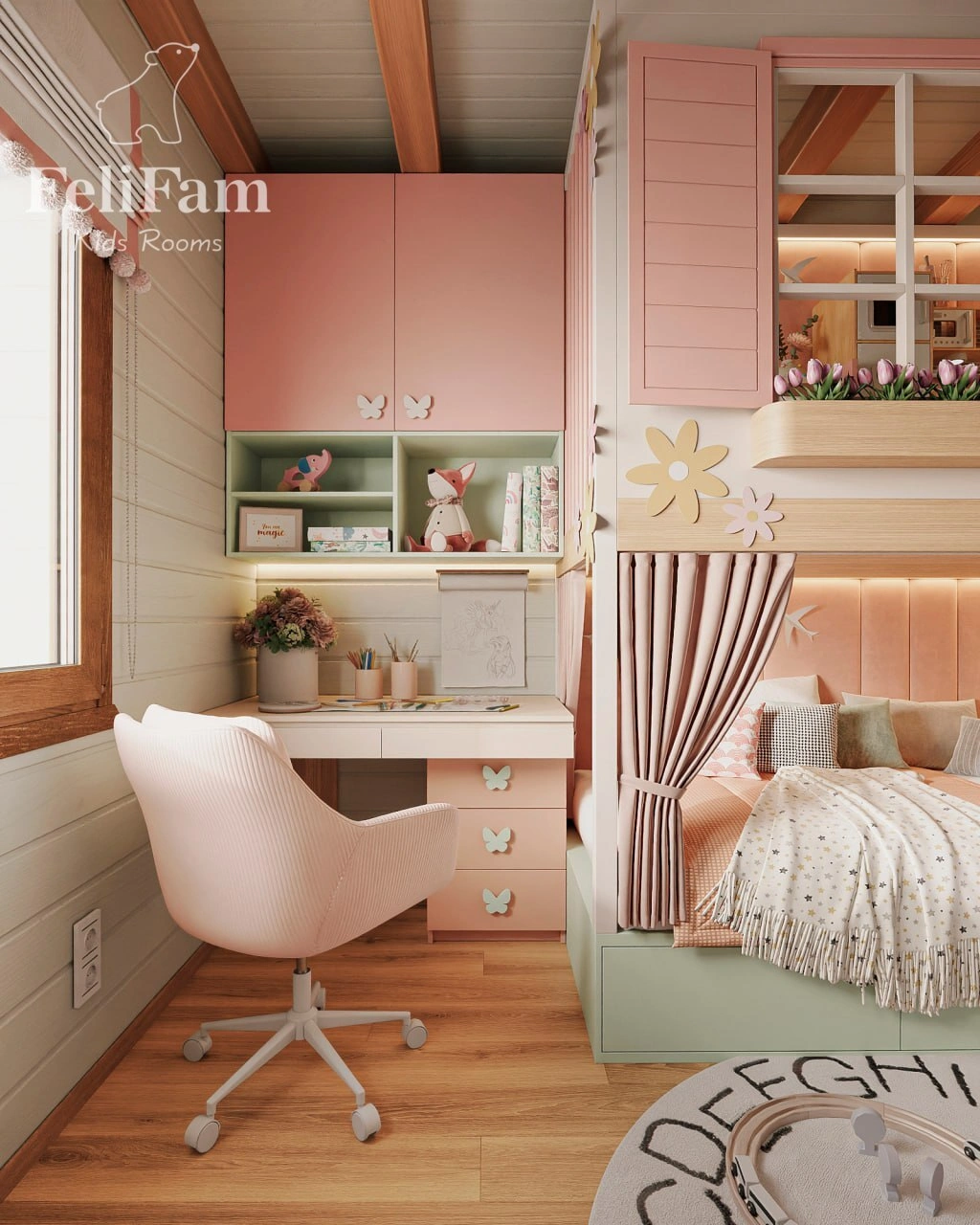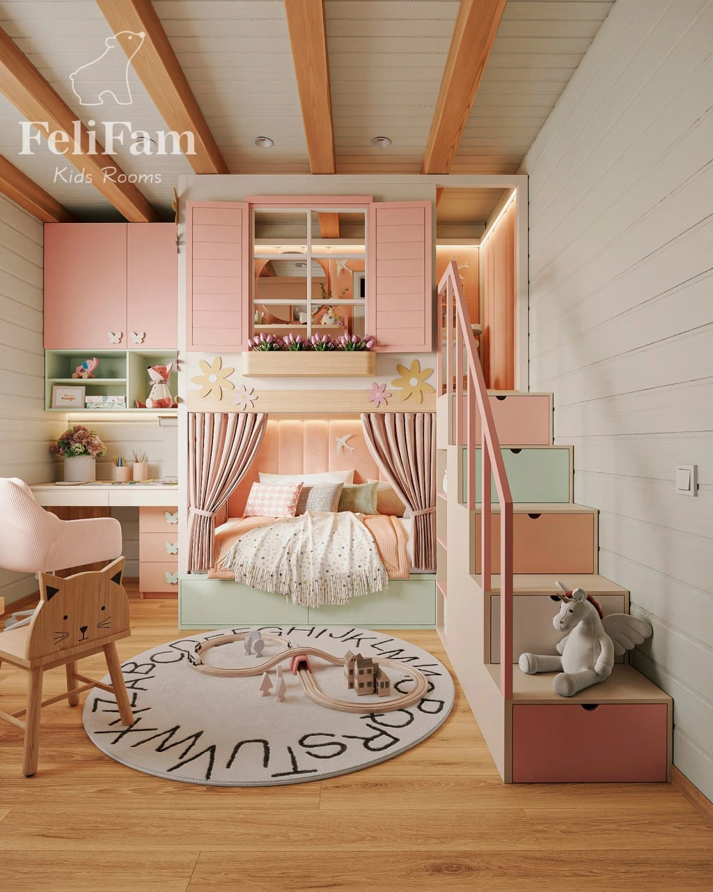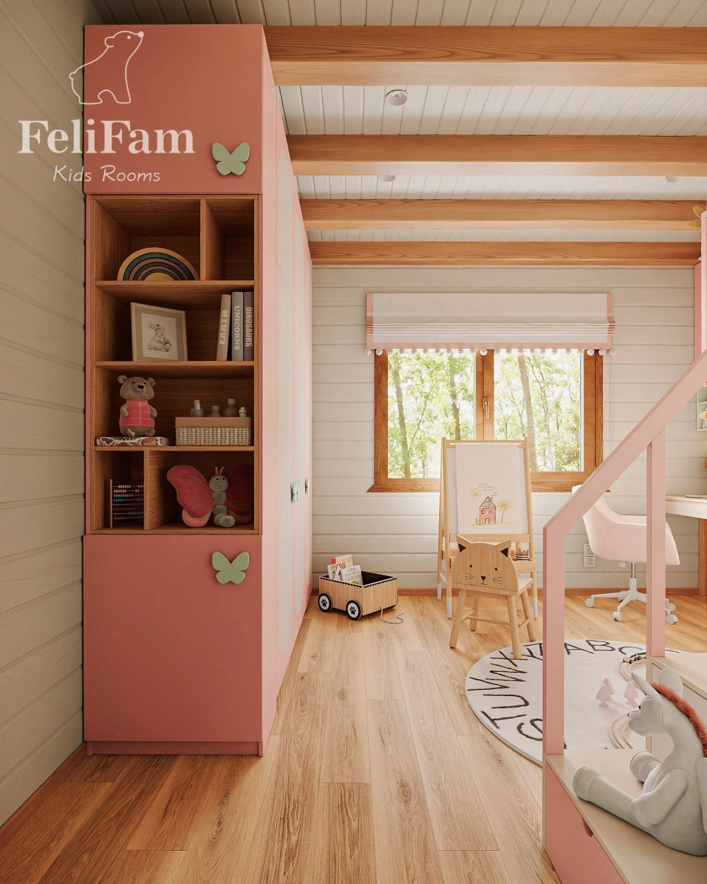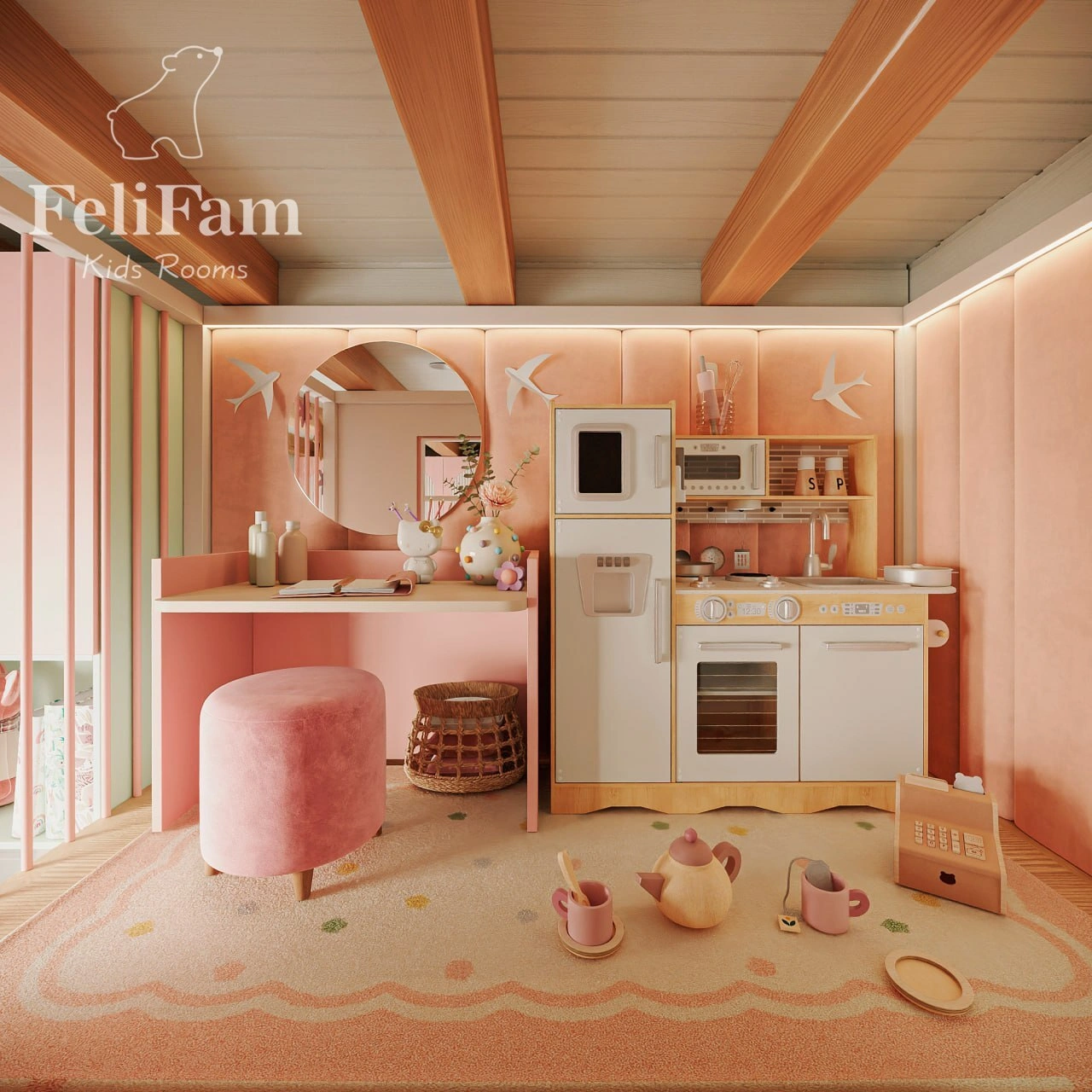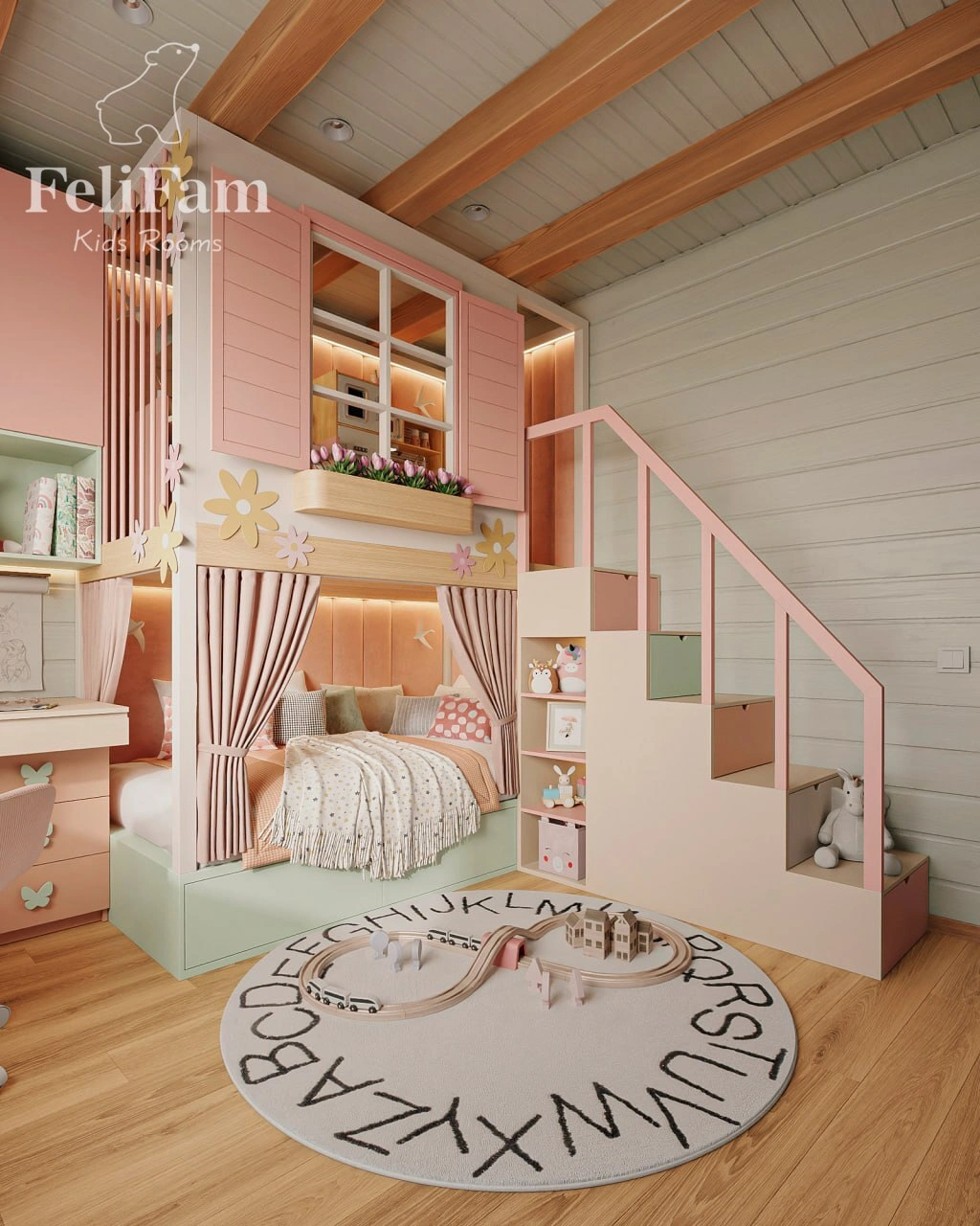 This kids’ room for a little girl features a bed-house as the centerpiece, designed for active play and imaginative development. The two-level structure combines comfort with a safe design. The room also includes a play area with a toy kitchen, a play toilet, and storage spaces, making it functional and convenient for daily activities.