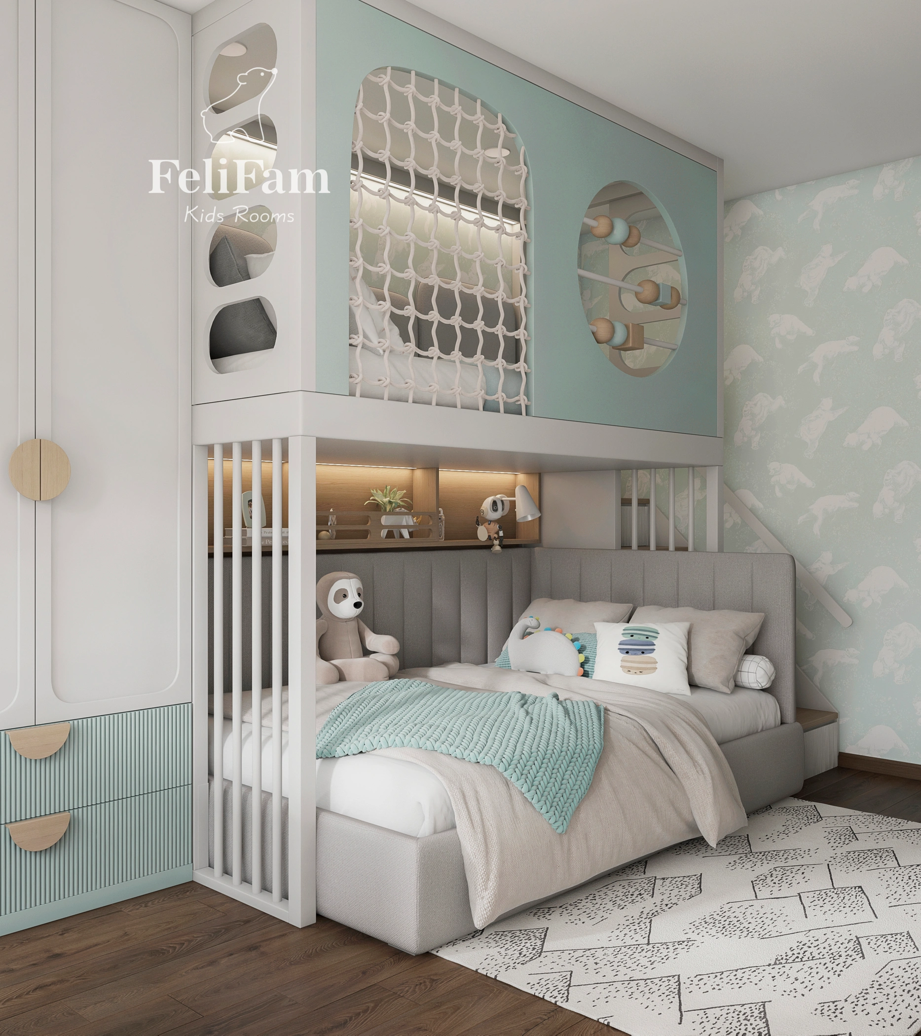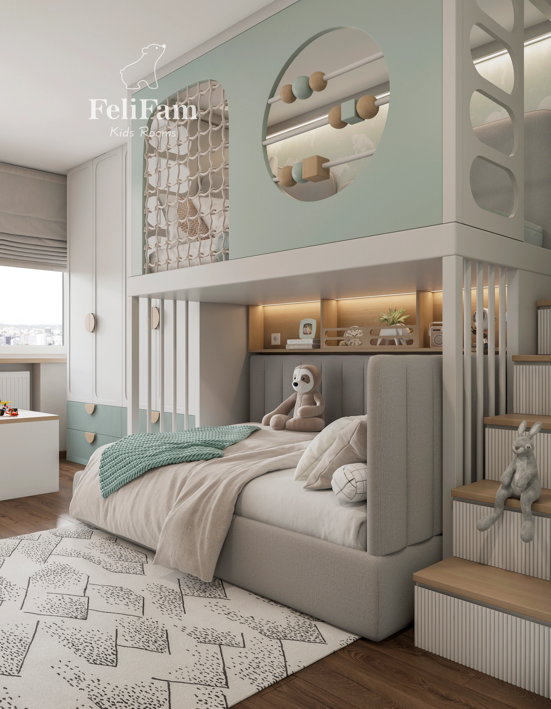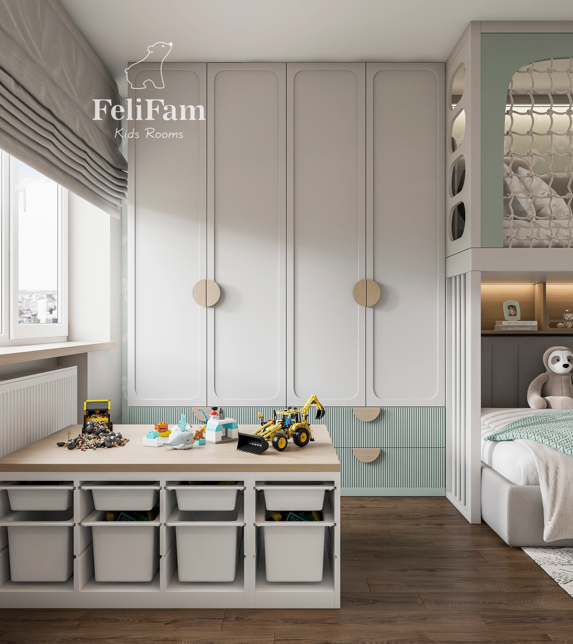 The room includes organized storage zones, a spacious wardrobe, and a thoughtful combination of open and closed shelves. Pleasant colors create a comfortable atmosphere for rest and study, while furniture ensures the space remains practical and adaptable as both children grow.