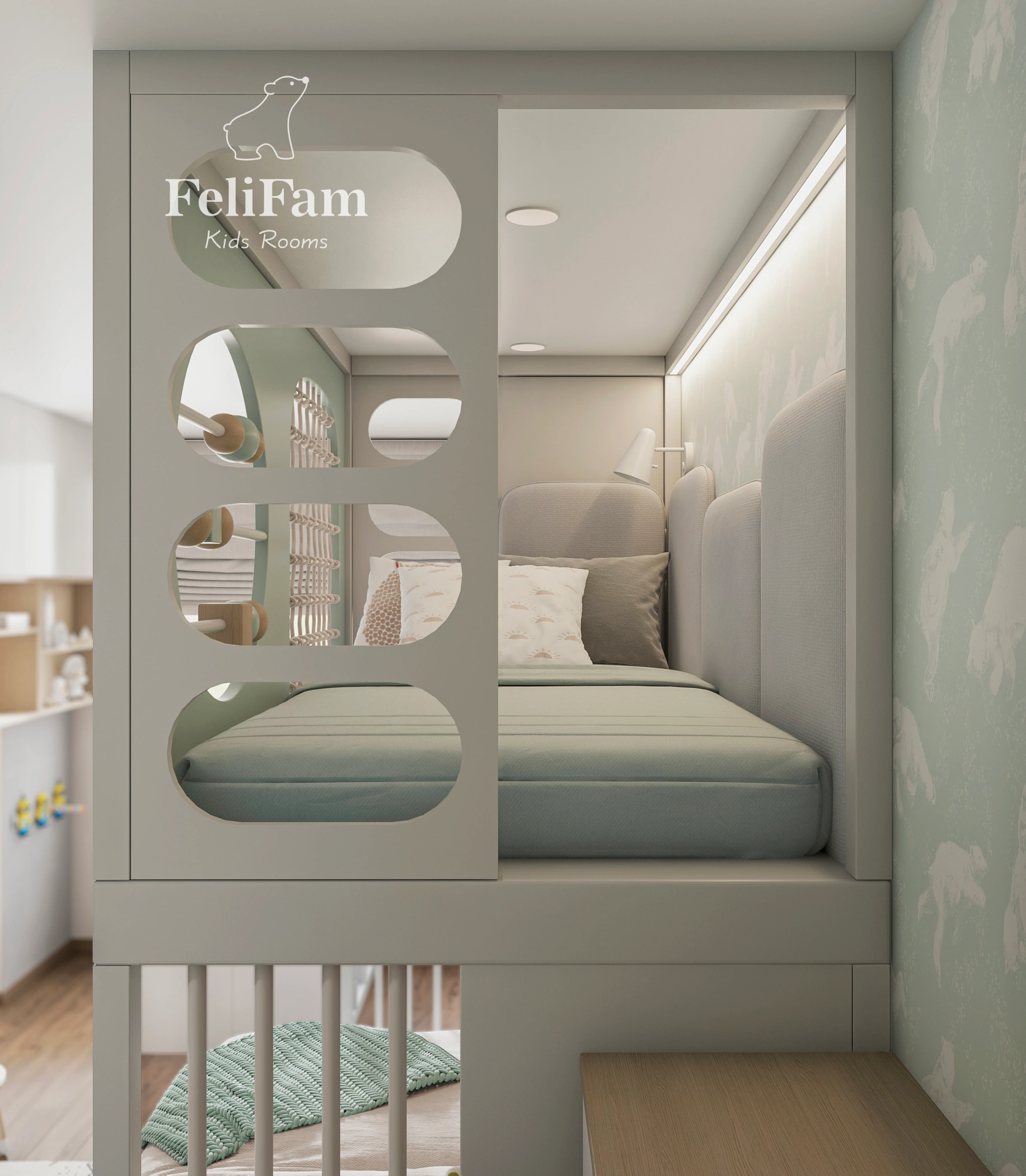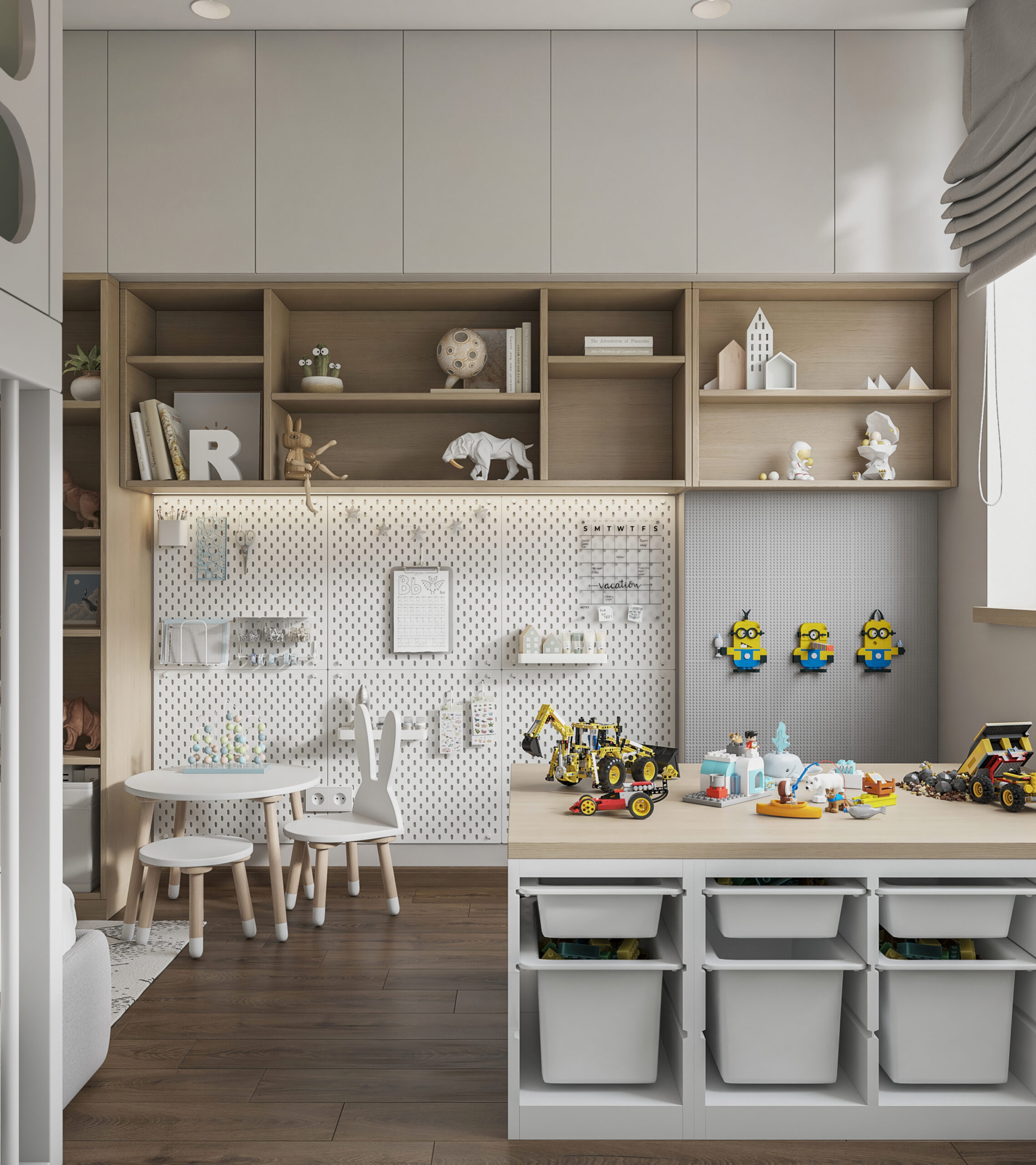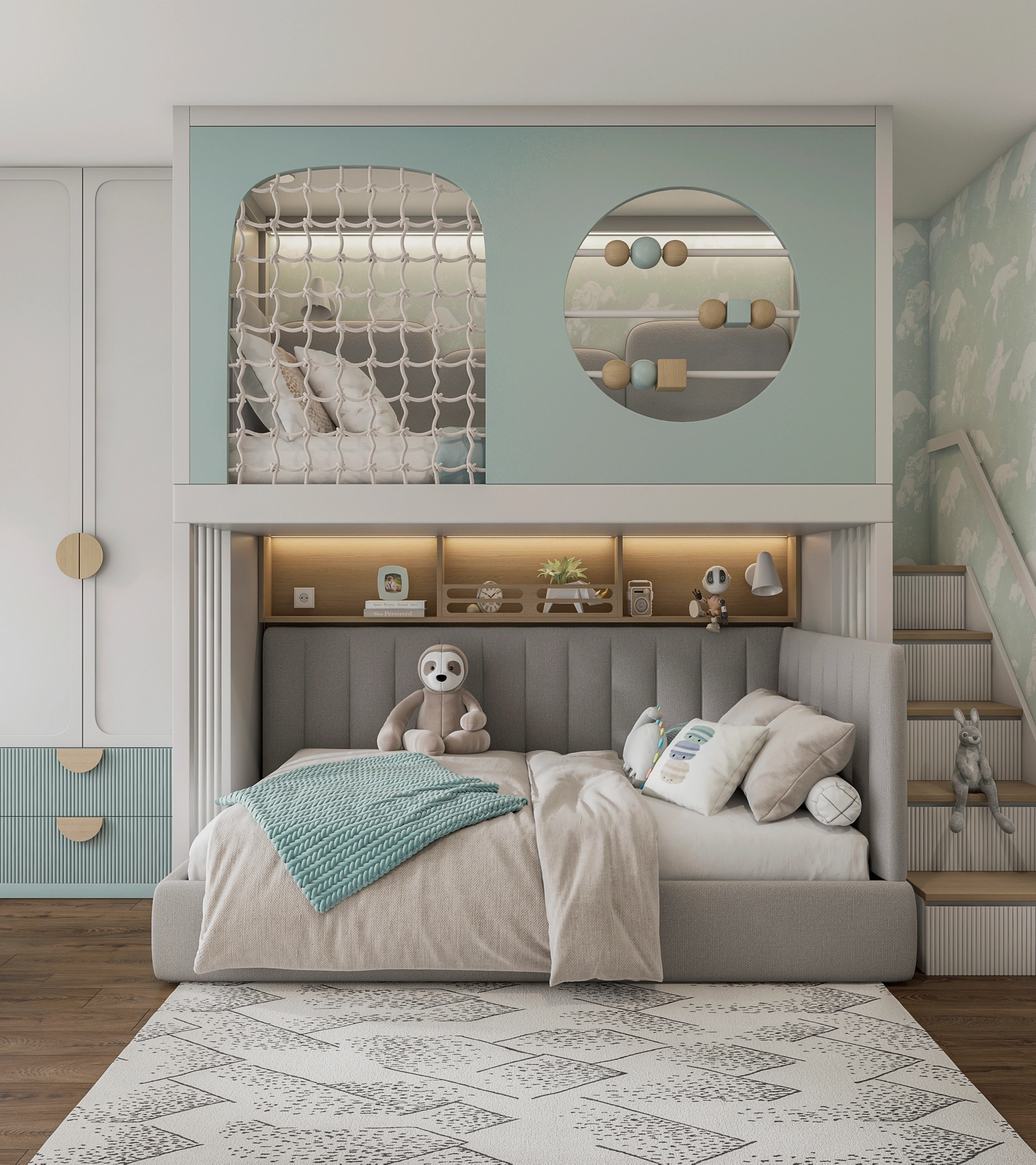 The room includes organized storage zones, a spacious wardrobe, and a thoughtful combination of open and closed shelves. Pleasant colors create a comfortable atmosphere for rest and study, while furniture ensures the space remains practical and adaptable as both children grow.