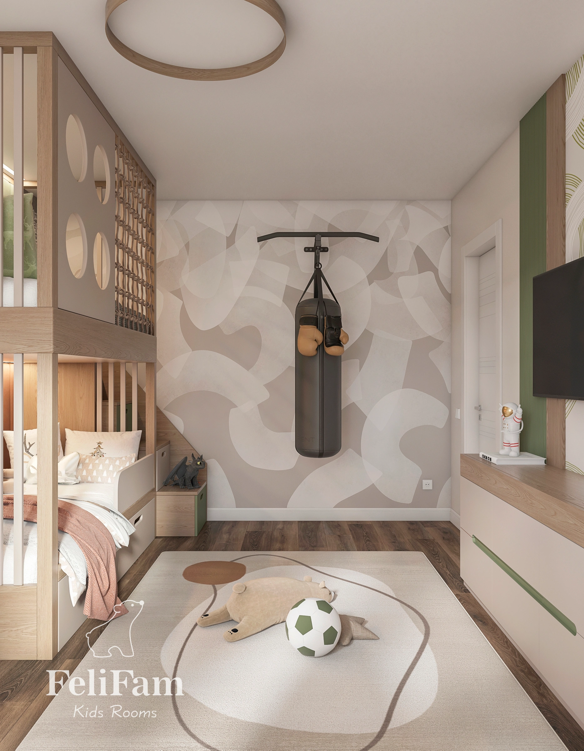 The room features a sports corner with a boxing bag for active leisure. The study area is complemented by an integrated fold-out vanity desk with a mirror, which also provides storage for accessories or cosmetics. This solution makes the room versatile, highly functional, and well adapted for children of different genders and ages.