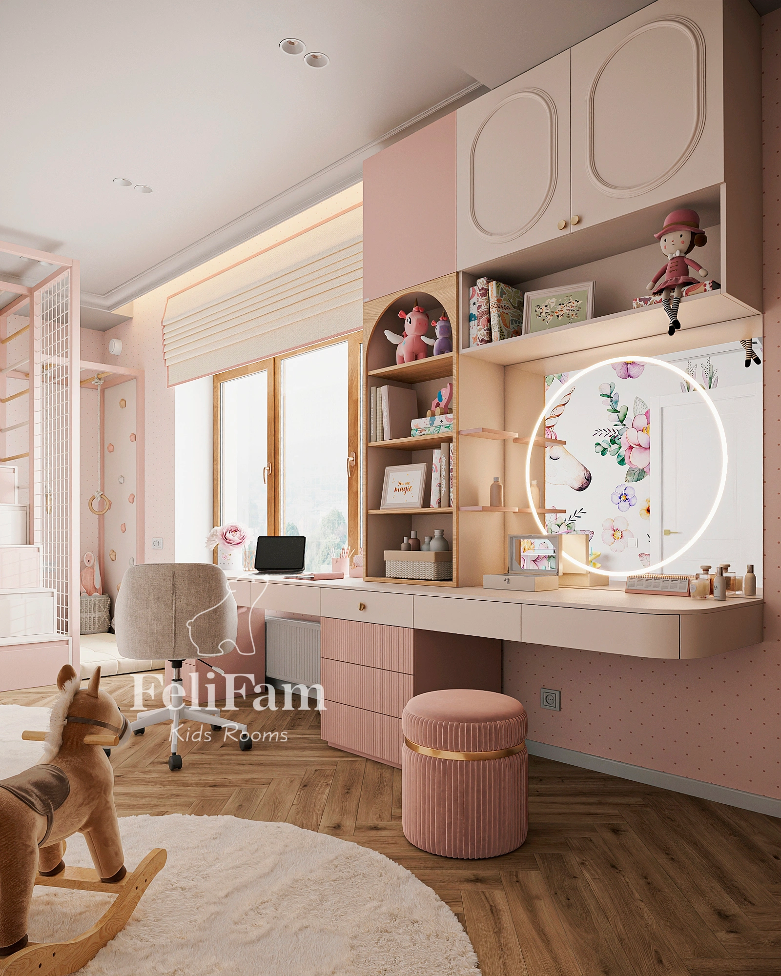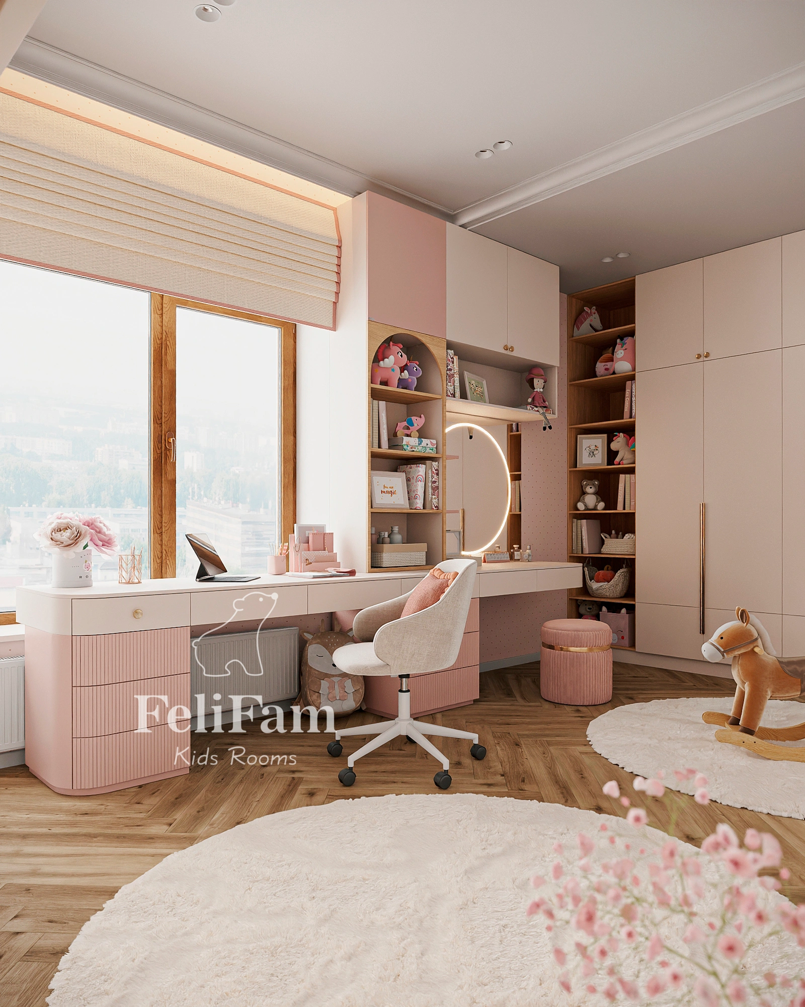 The room features a sports corner for physical activity, and the study area is positioned by the window to take advantage of natural light. Ample storage and open shelves help keep the room organized and make it easy to arrange toys, books, and learning materials, creating a balanced interior for children of different genders.