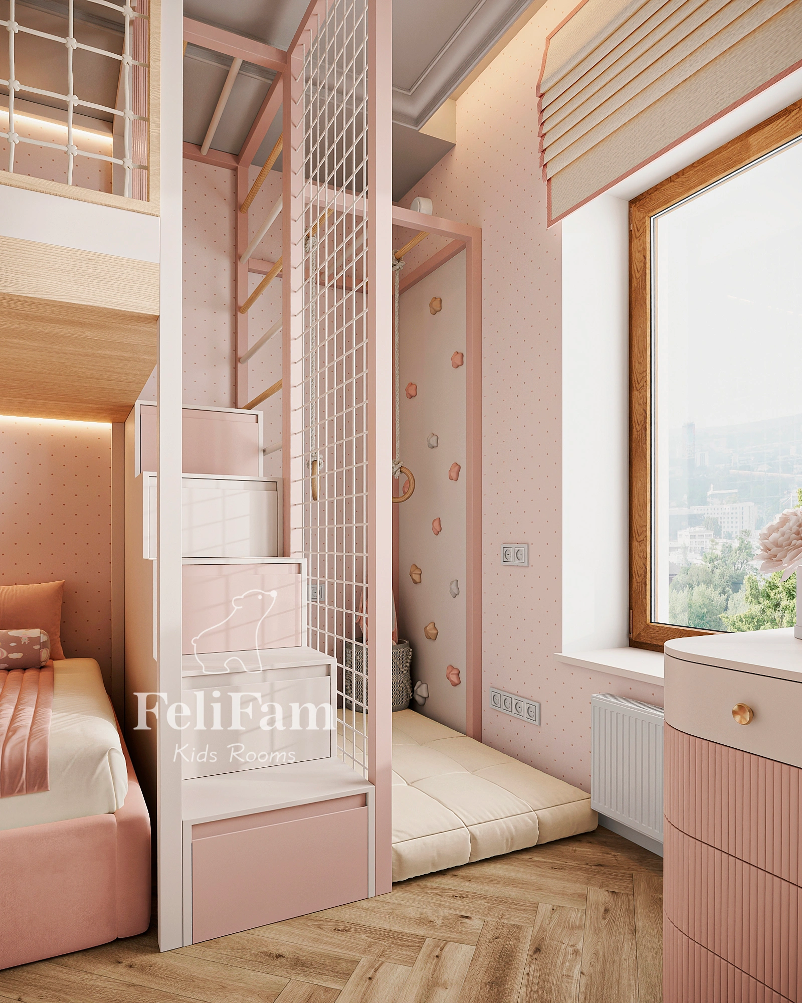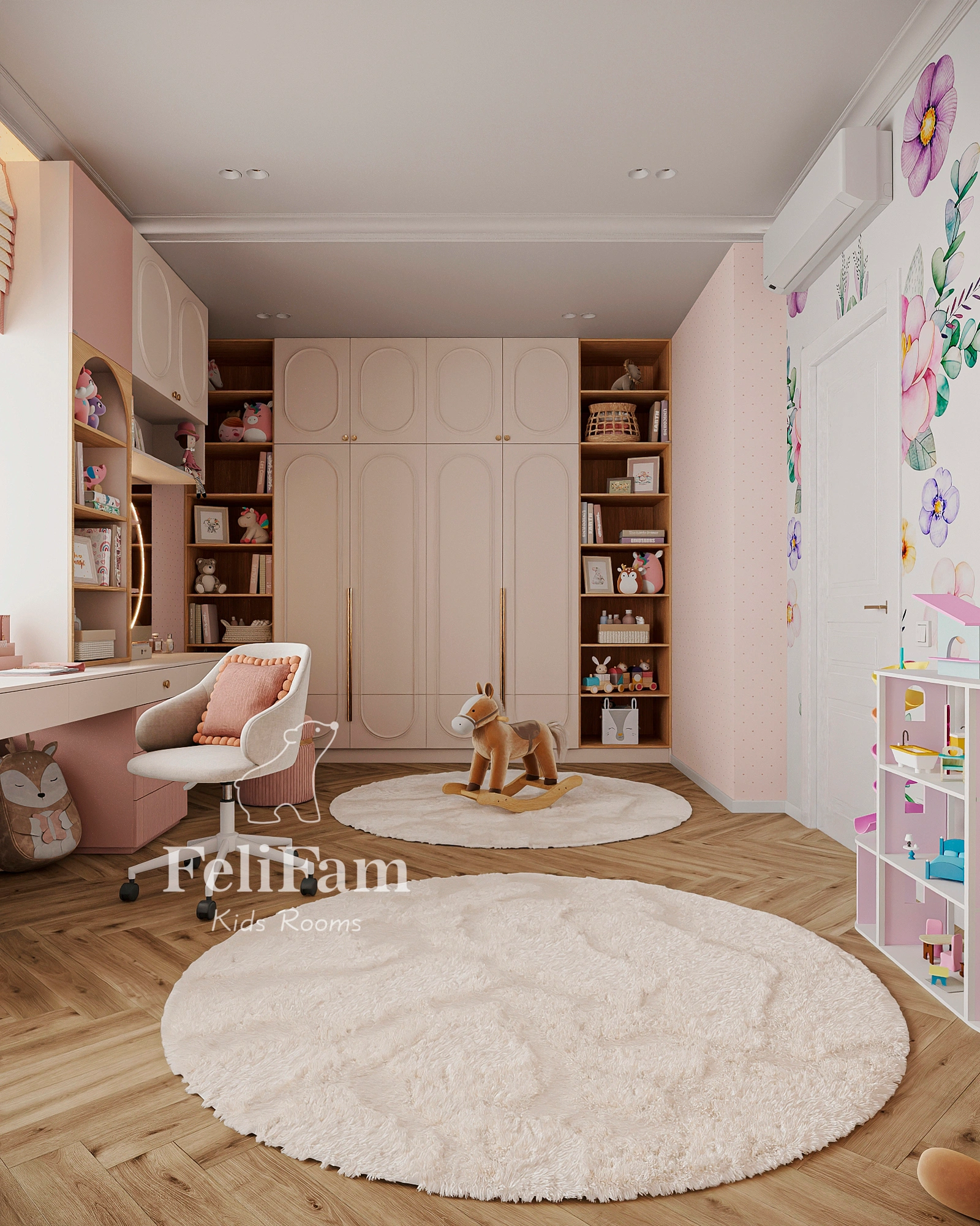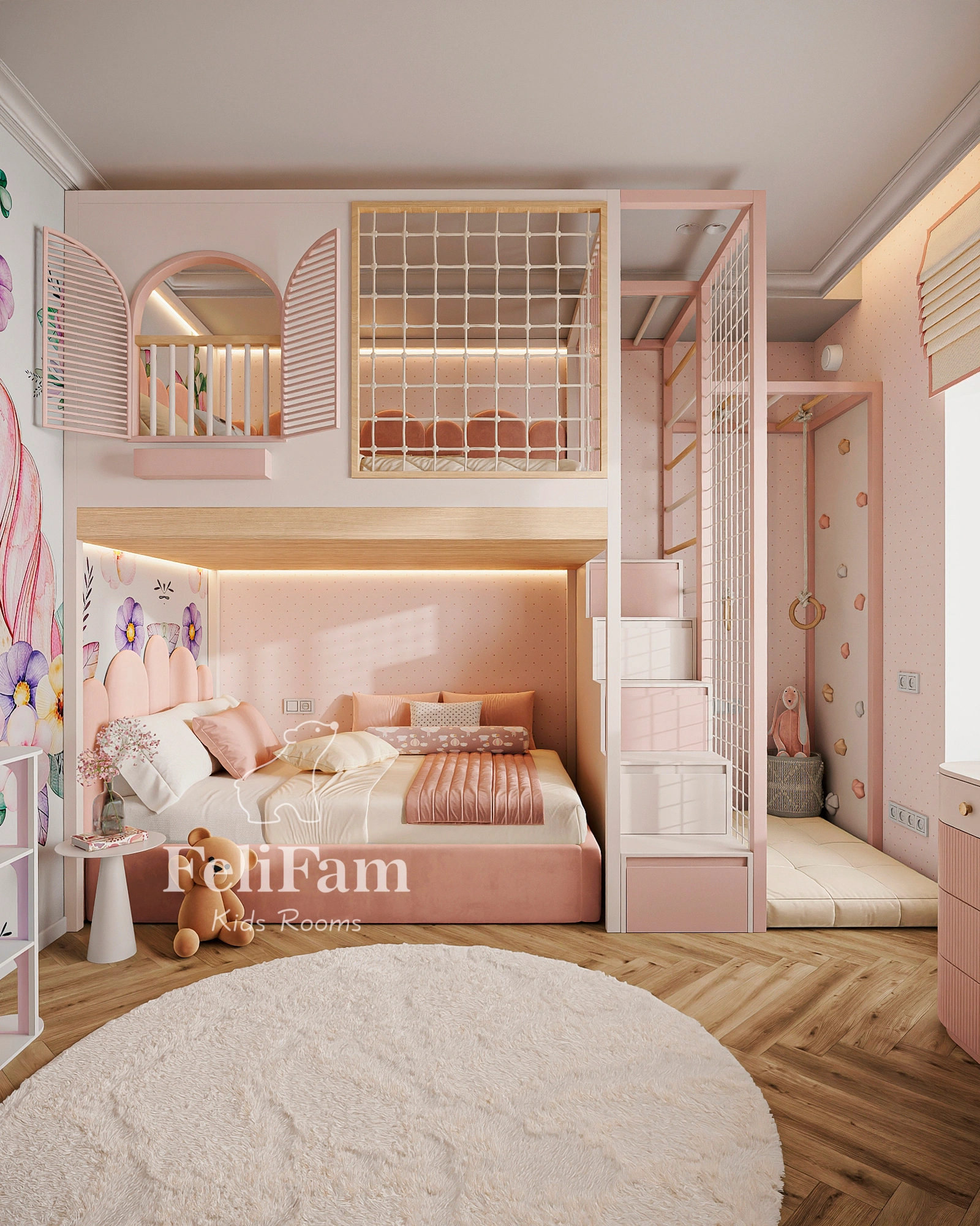 The children’s room for mixed-gender siblings is designed as a spacious and functional space for the daily life of two children. The wide bunk bed provides comfortable areas for sleeping and resting, while the thoughtful layout preserves a sense of openness even with active use of the room.