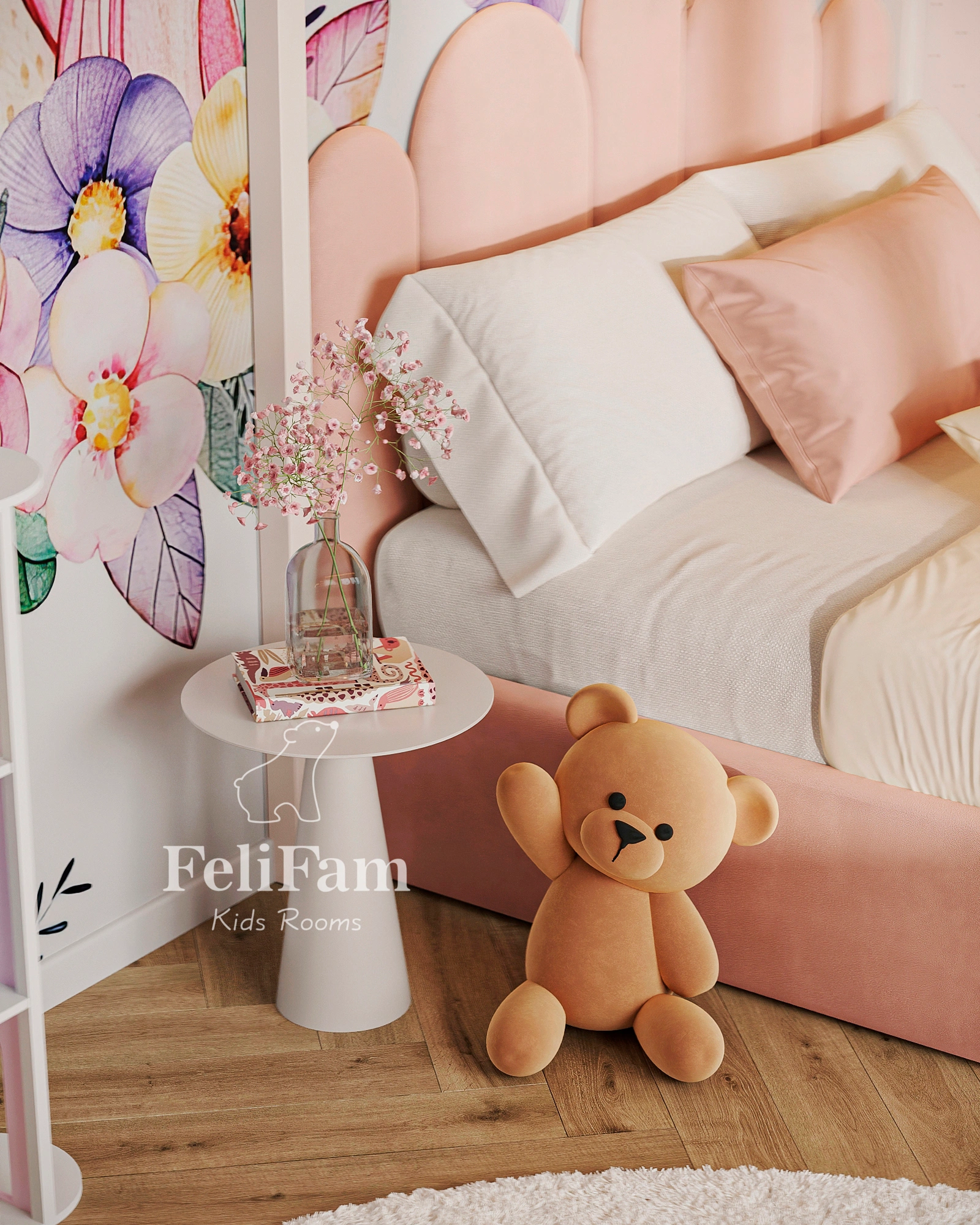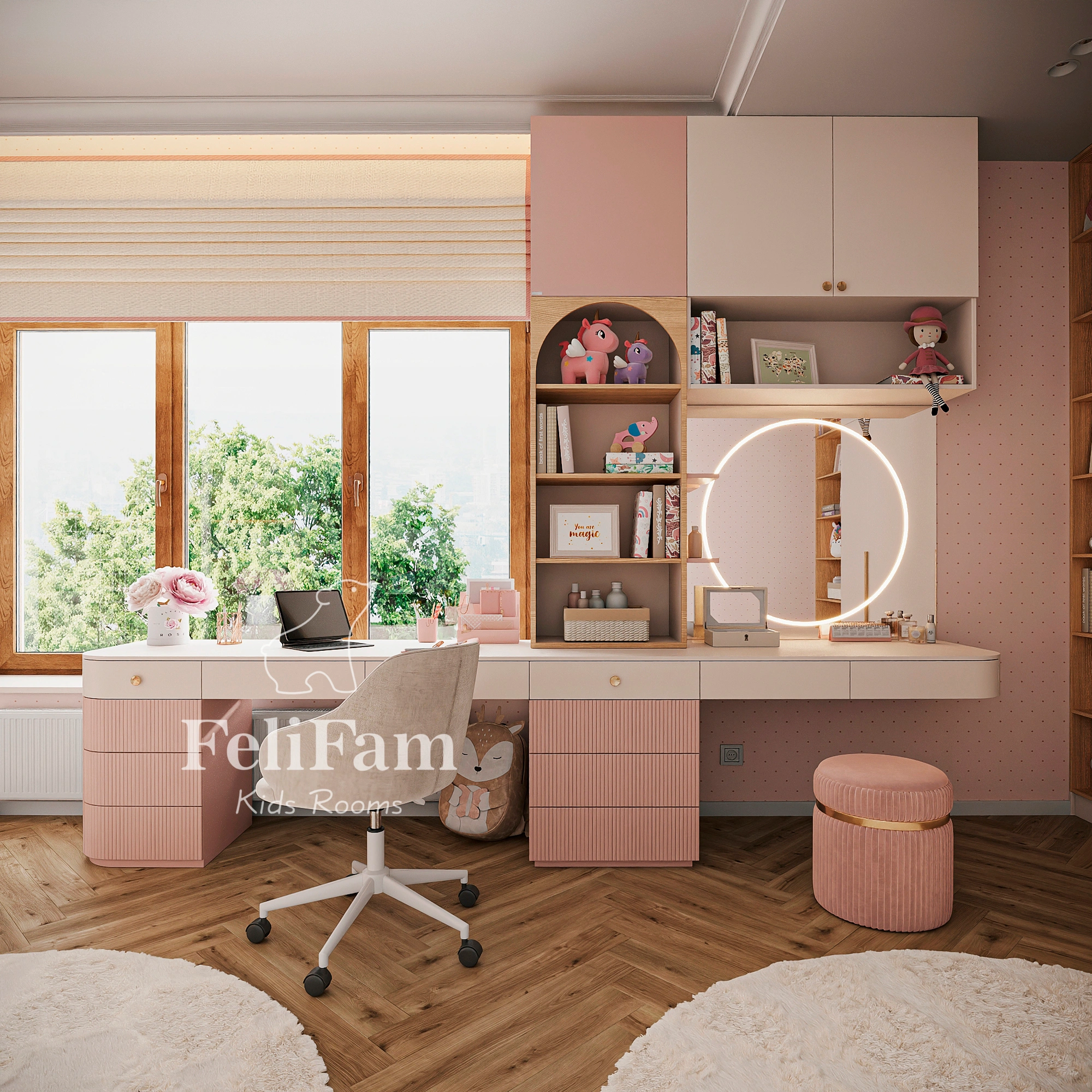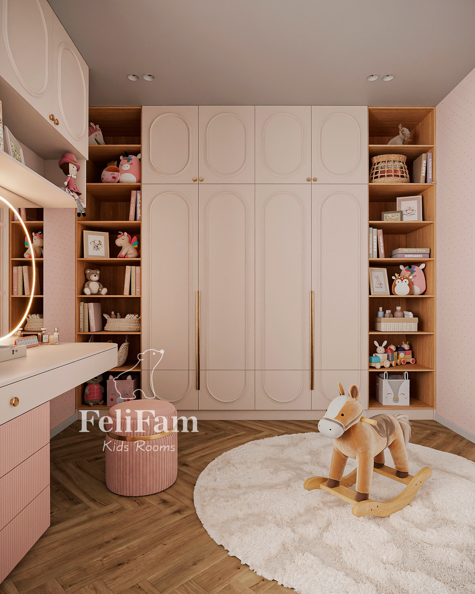 The children’s room for mixed-gender siblings is designed as a spacious and functional space for the daily life of two children. The wide bunk bed provides comfortable areas for sleeping and resting, while the thoughtful layout preserves a sense of openness even with active use of the room.