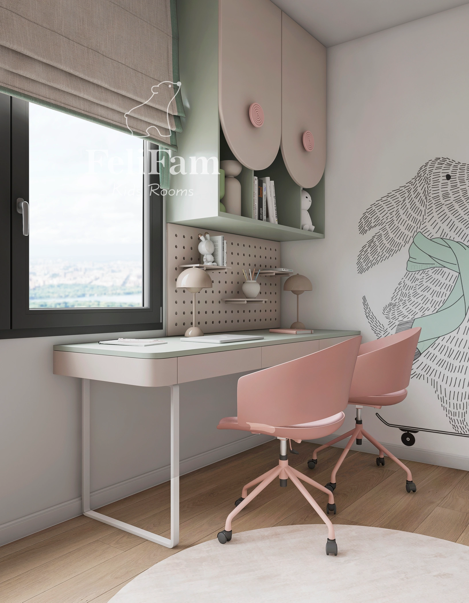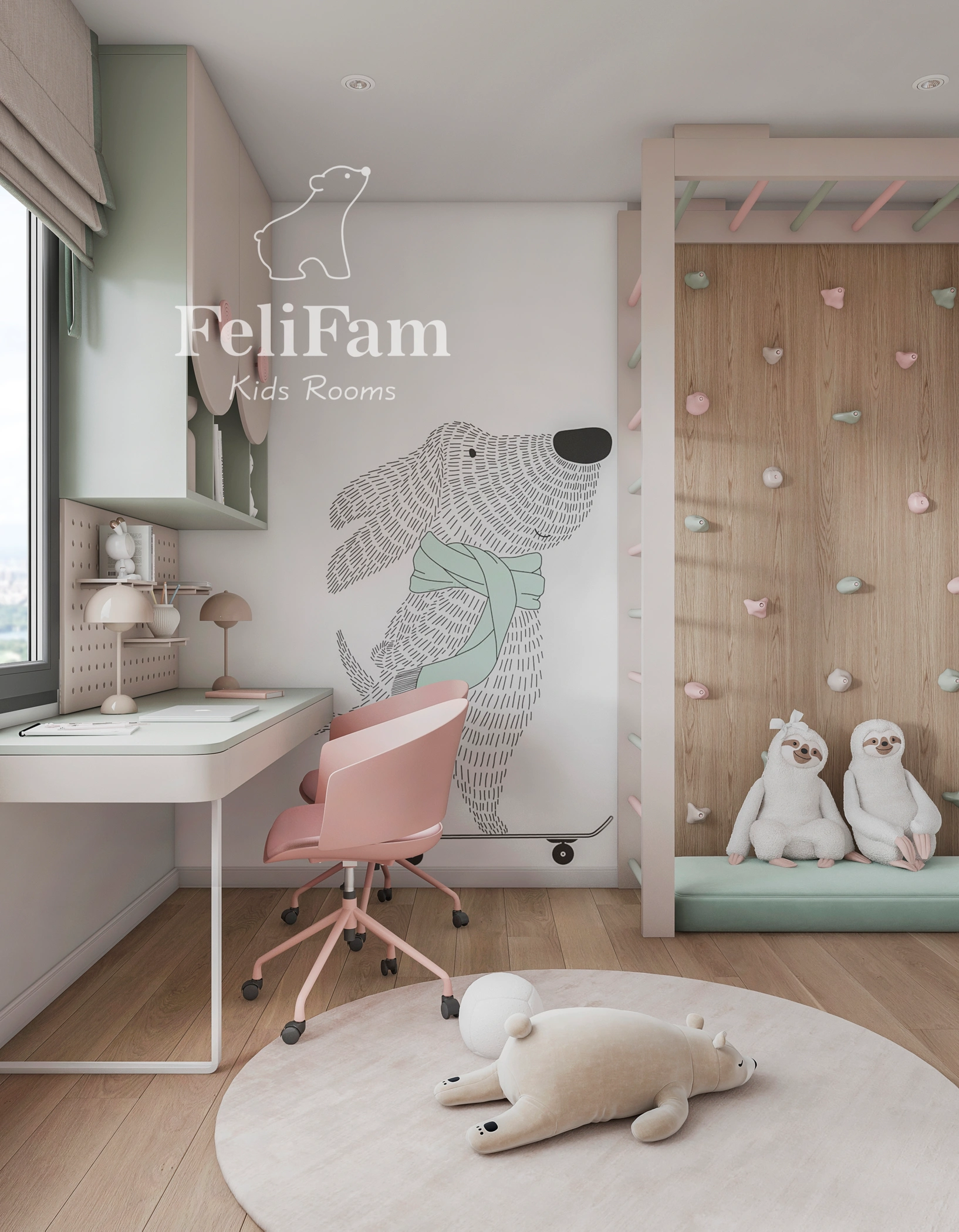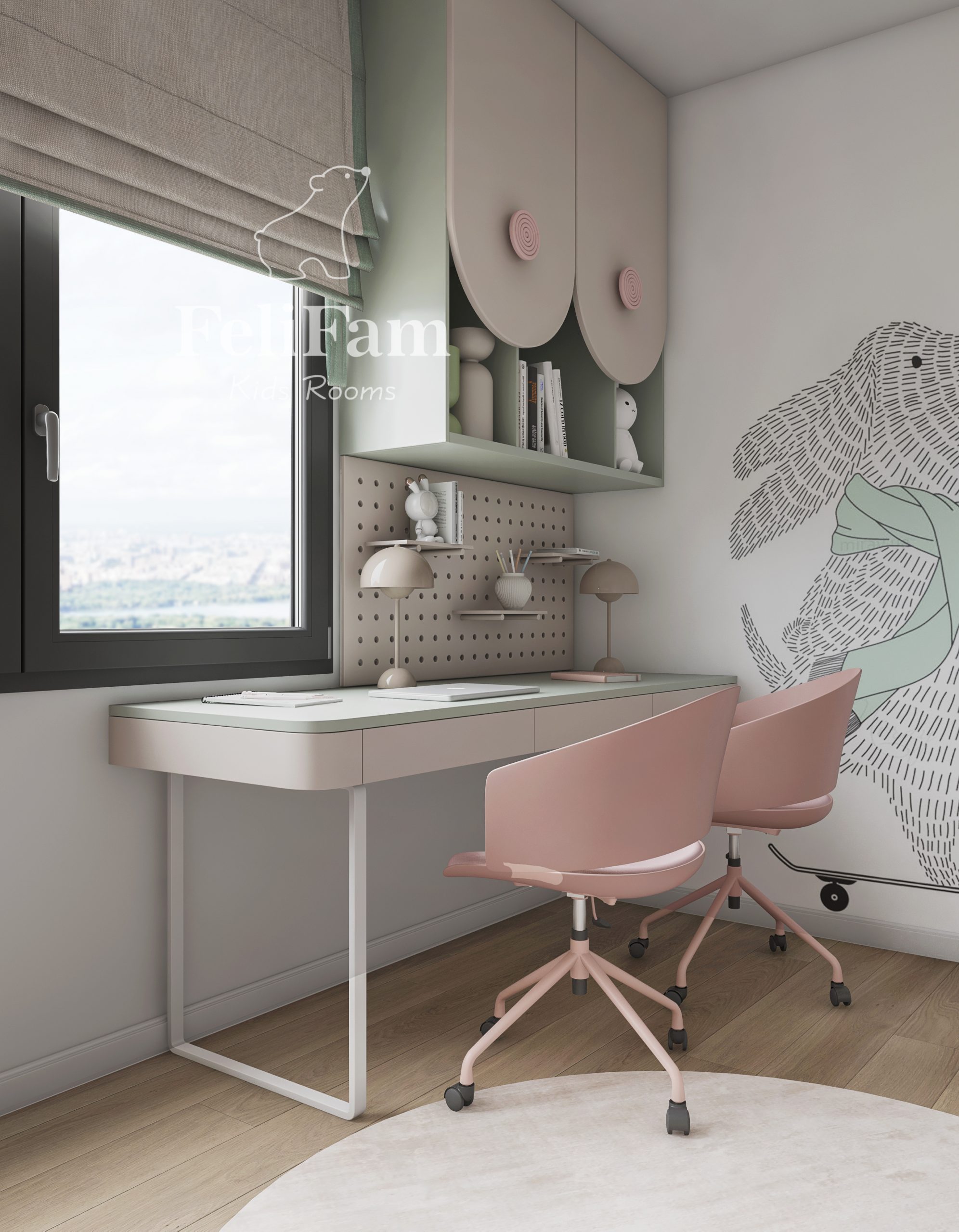 A 14 sq m children’s room for two girls is designed in a bright and functional way, taking into account the children’s interests. Wallpaper with dogs adds character to the space and creates a warm, emotional atmosphere, while every detail is carefully considered for comfort and active time.