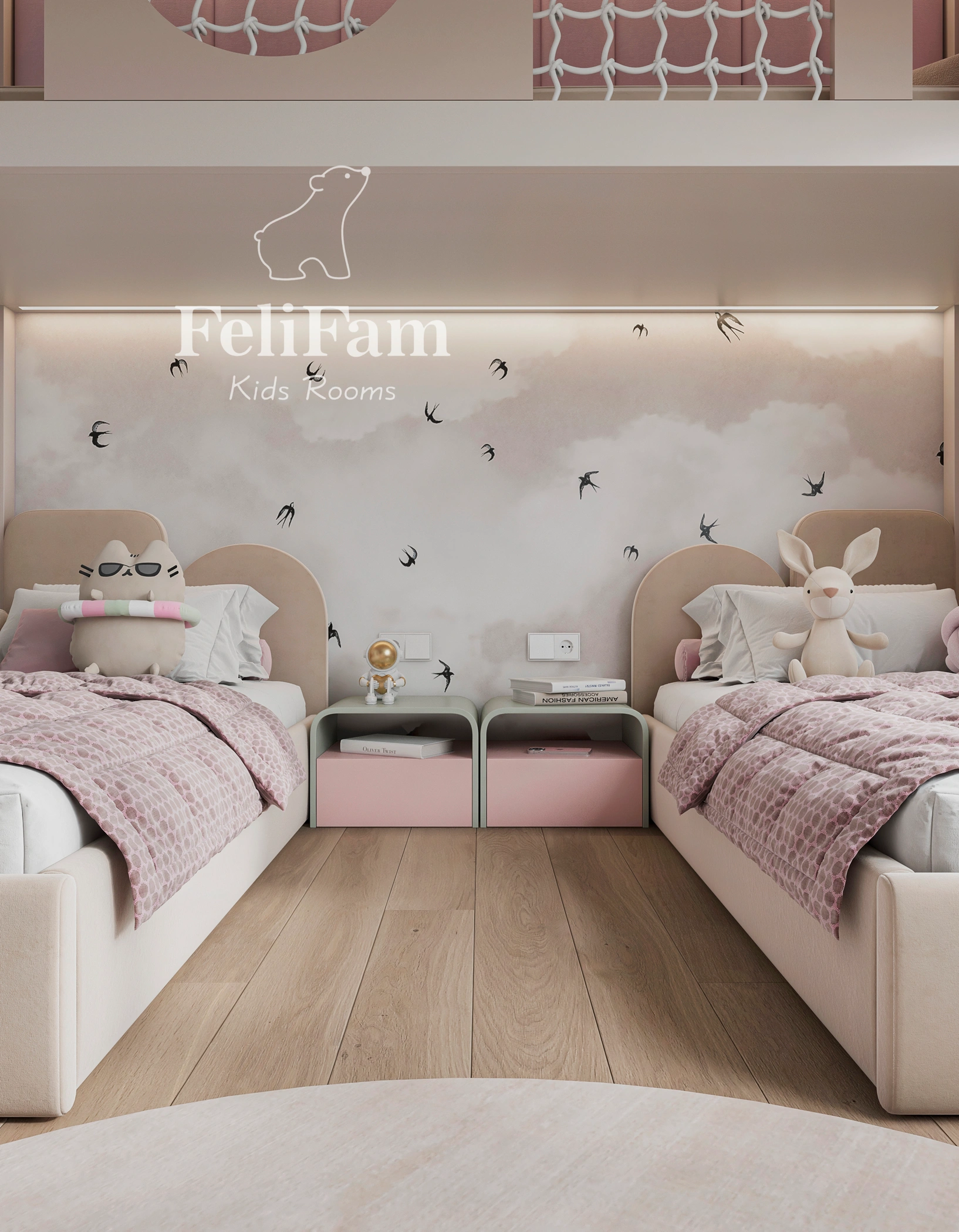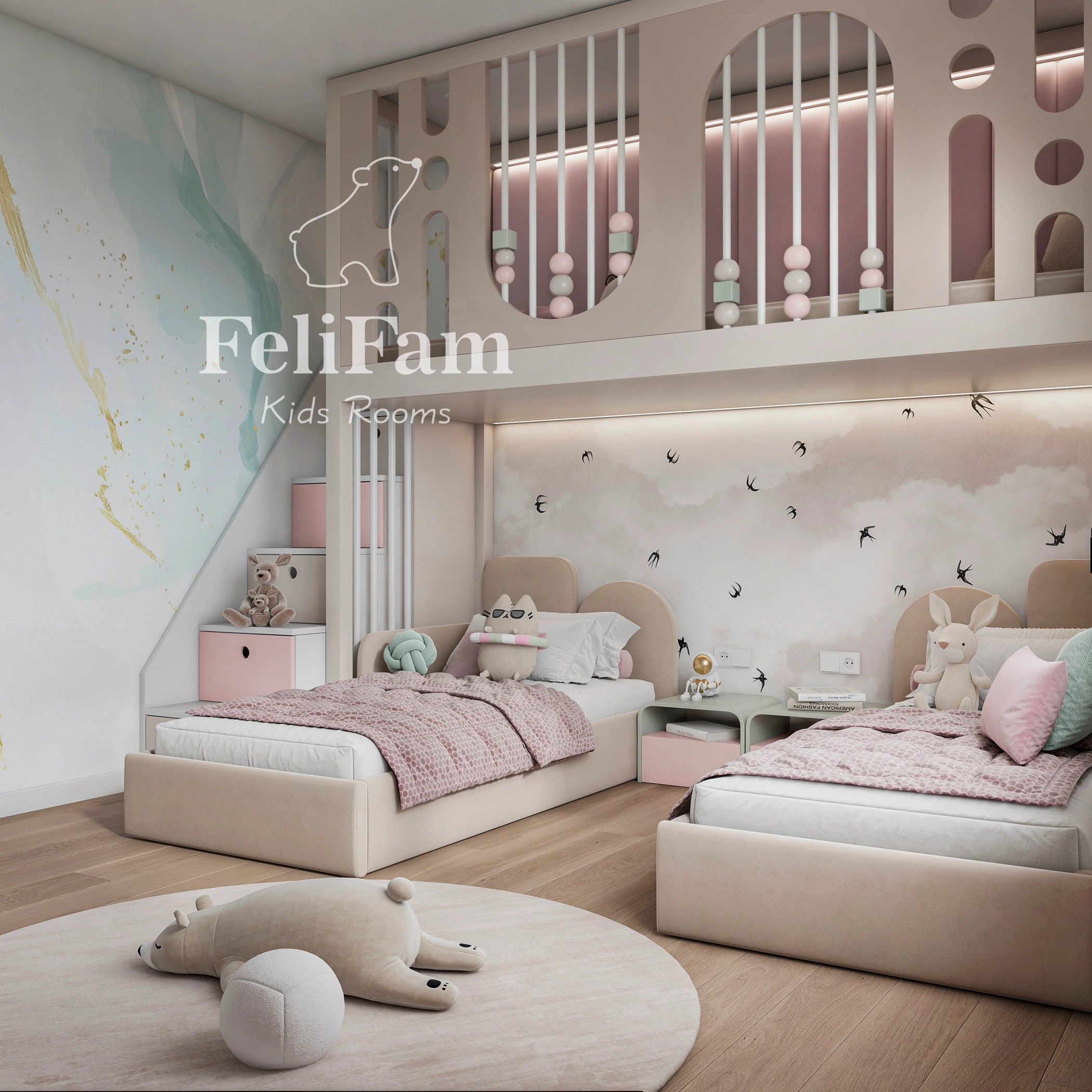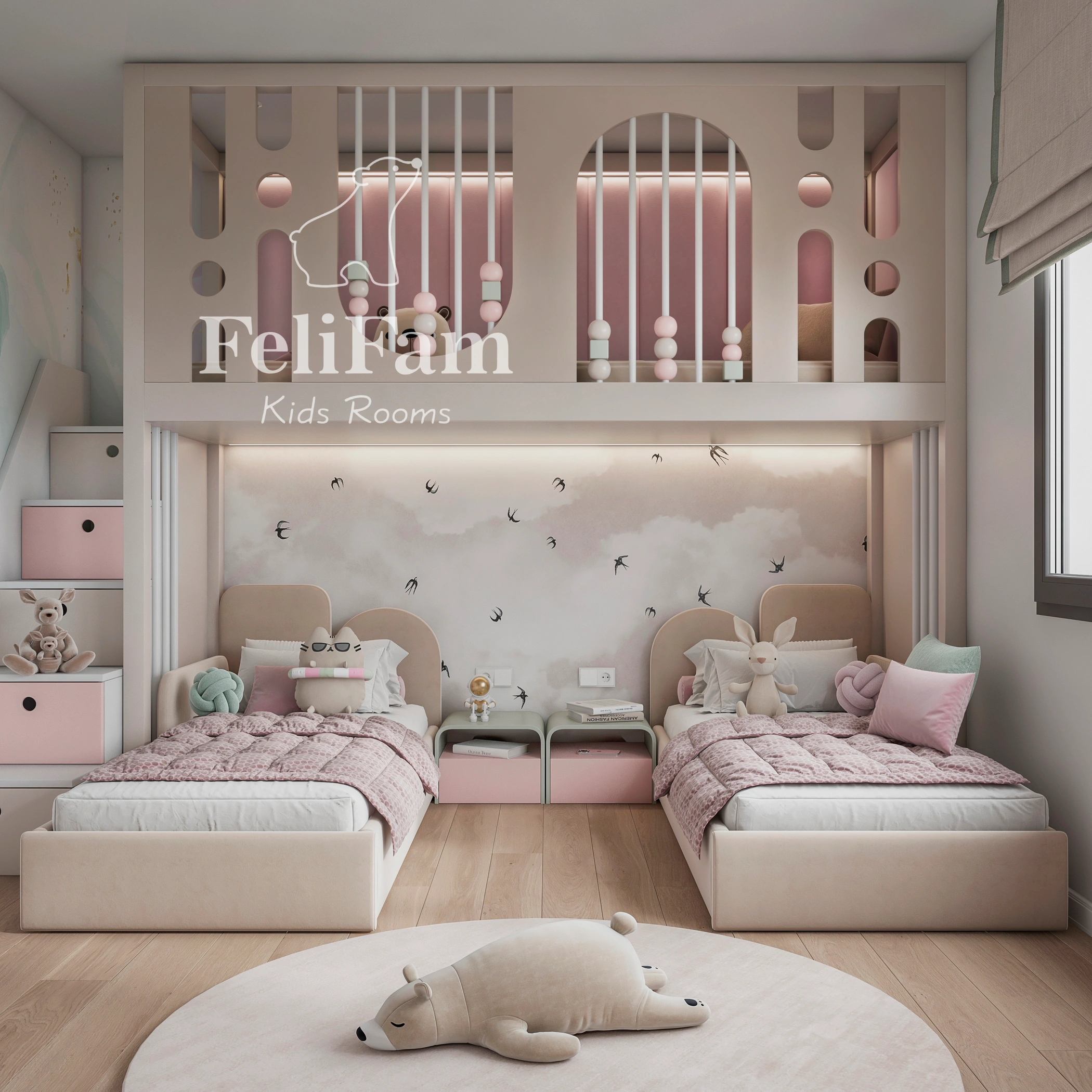 The room features two full-size beds, with a shared play area organized above them. It also includes dedicated study zones and a small sports corner, making the space multifunctional, comfortable, and well-balanced for both development and relaxation.