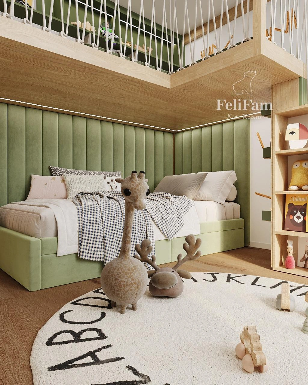 The room features a bed with soft wall panels that provide extra warmth, protection from bumps, and overall comfort during sleep. A second-level play area allows efficient use of space and creates a separate spot for active activities. The interior is complemented by an accent wardrobe and an open shelving system, offering convenient storage and helping maintain order in the room.