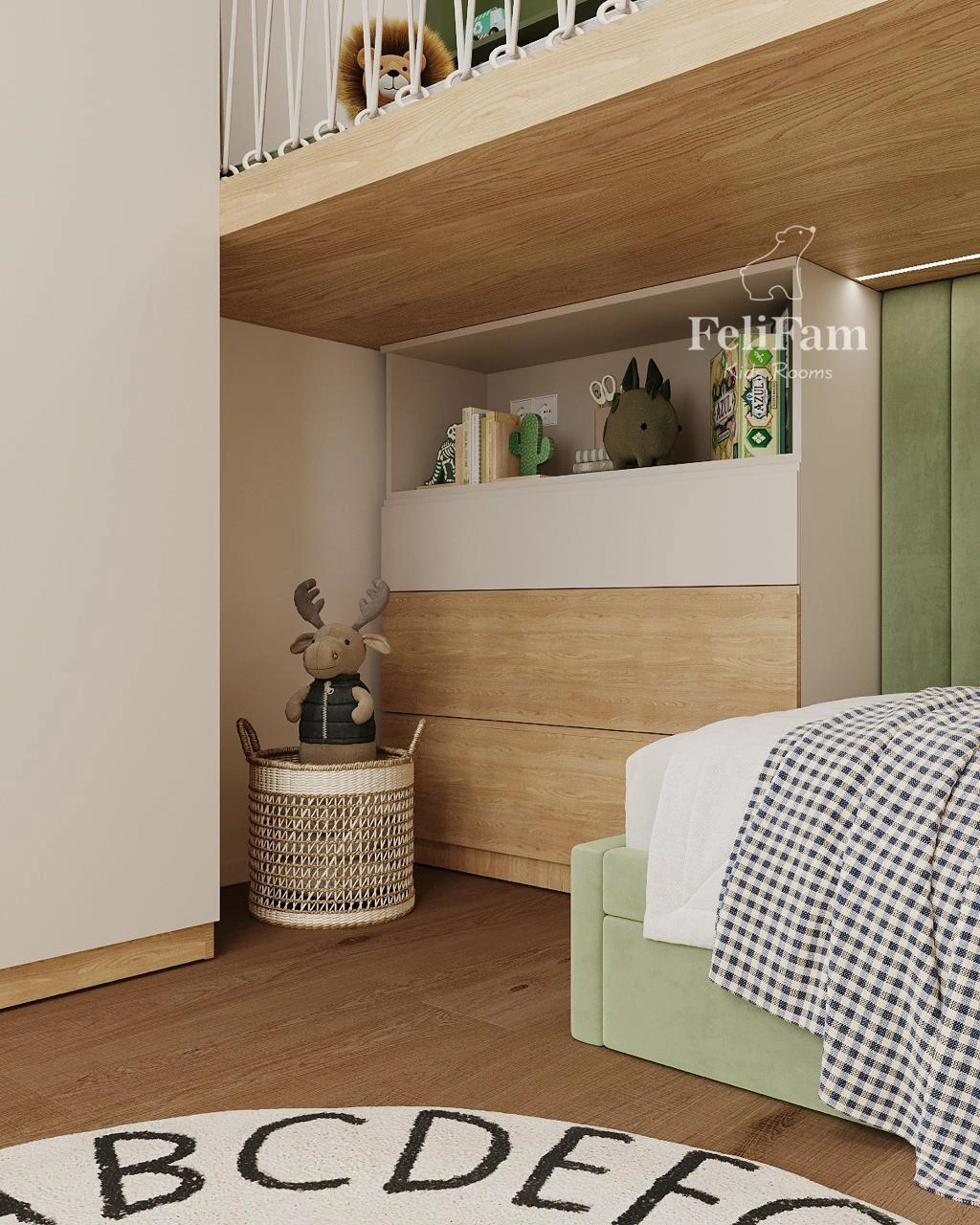 The boy’s bedroom is designed with a focus on maximum safety and the use of natural materials — a key request from the parents. All furniture is made from high-quality plywood, produced from natural wood veneer bonded with safe, certified adhesives, free from harmful substances, and distinguished by high strength and stability. This makes plywood an eco-friendly and reliable material for children’s furniture.