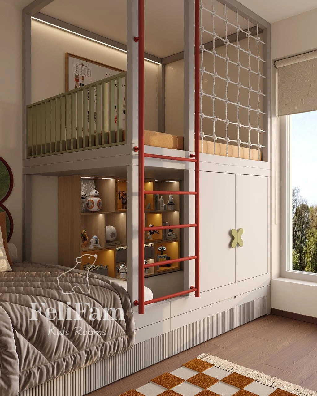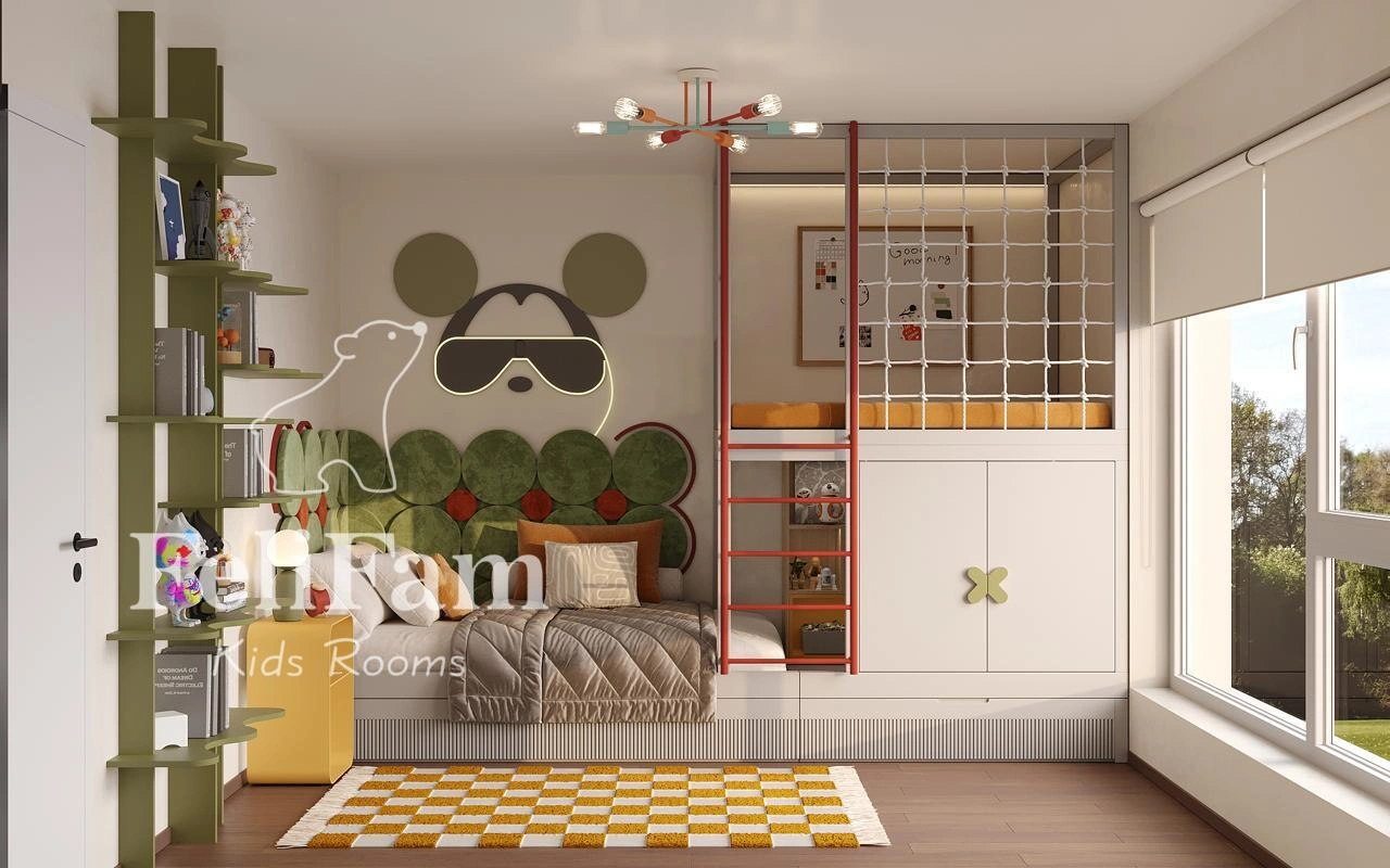 The centerpiece is a two-level module: the lower level features a bed with a pull-out extra sleeping unit, while the upper level serves as a full play area with a ladder and rope net. A large storage system keeps things organized, and niches with lighting highlight LEGO collections. The study area is designed for growth, with proper lighting, shelves for books, and space for electronics. Warm natural tones are combined with bright accents, creating a creative and vibrant environment.