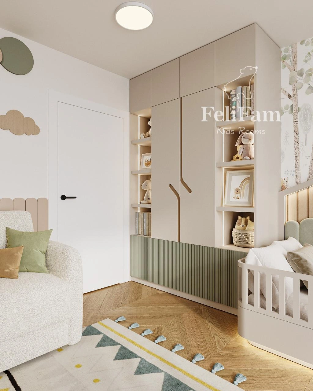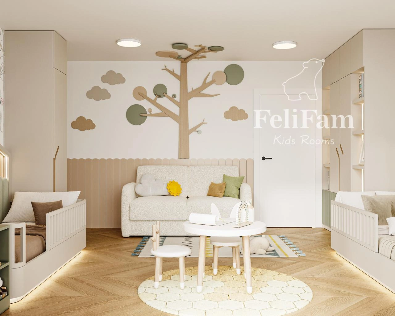 The design is выполнed in soft pastel tones with a bright green accent that makes the room feel light and cozy. The layout is carefully planned for convenience, smart storage, and a comfortable shared environment for both children.