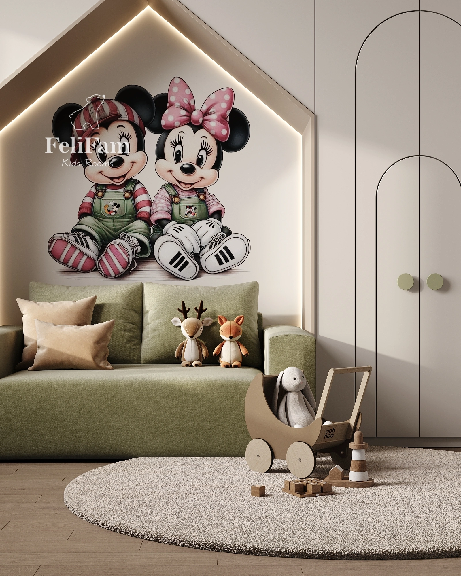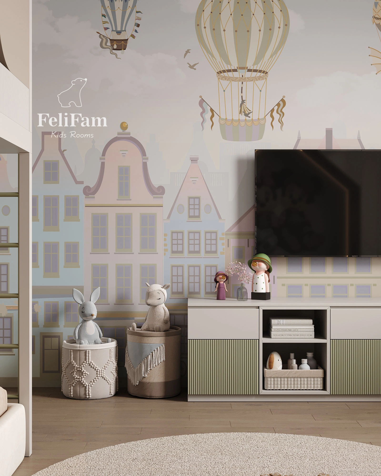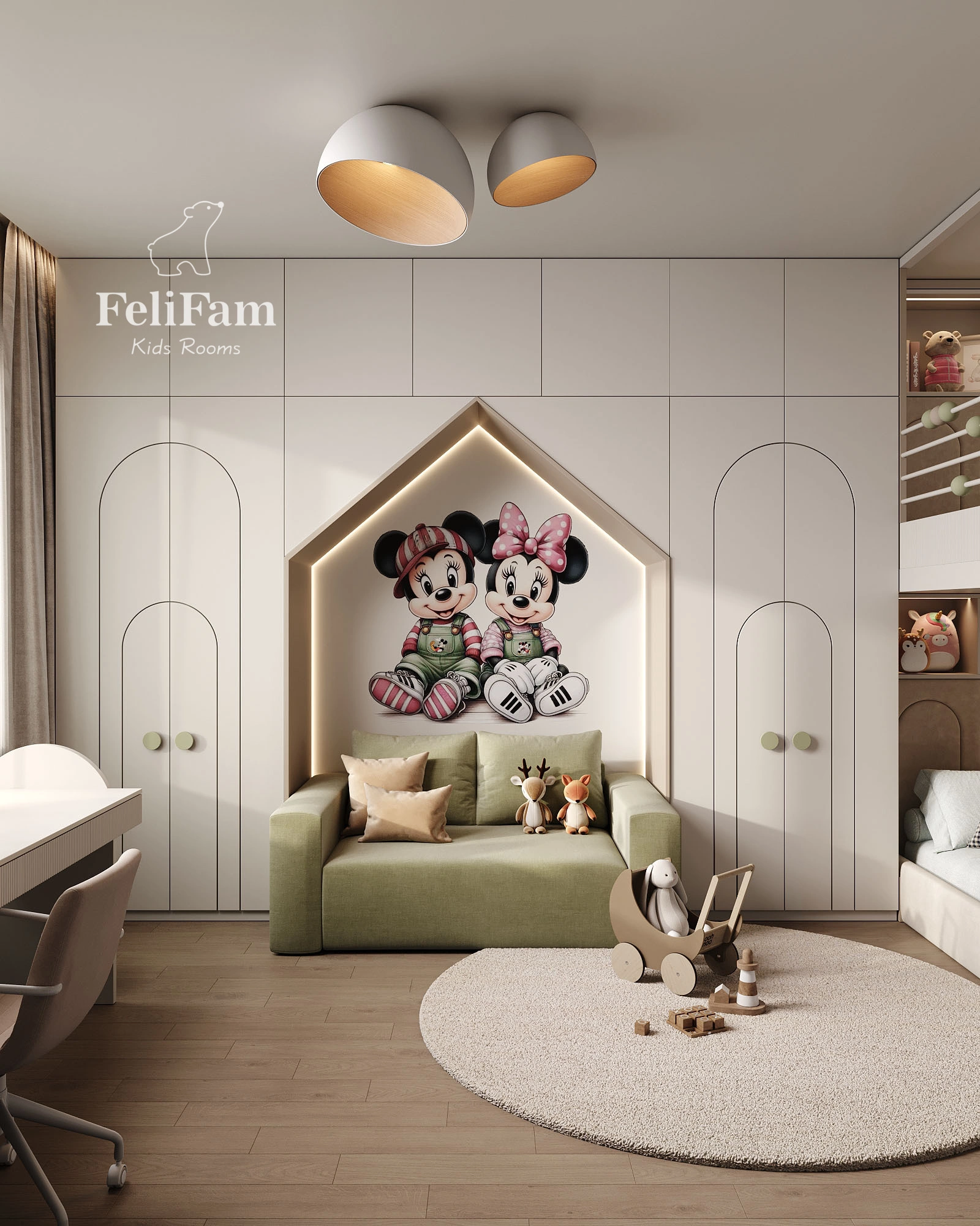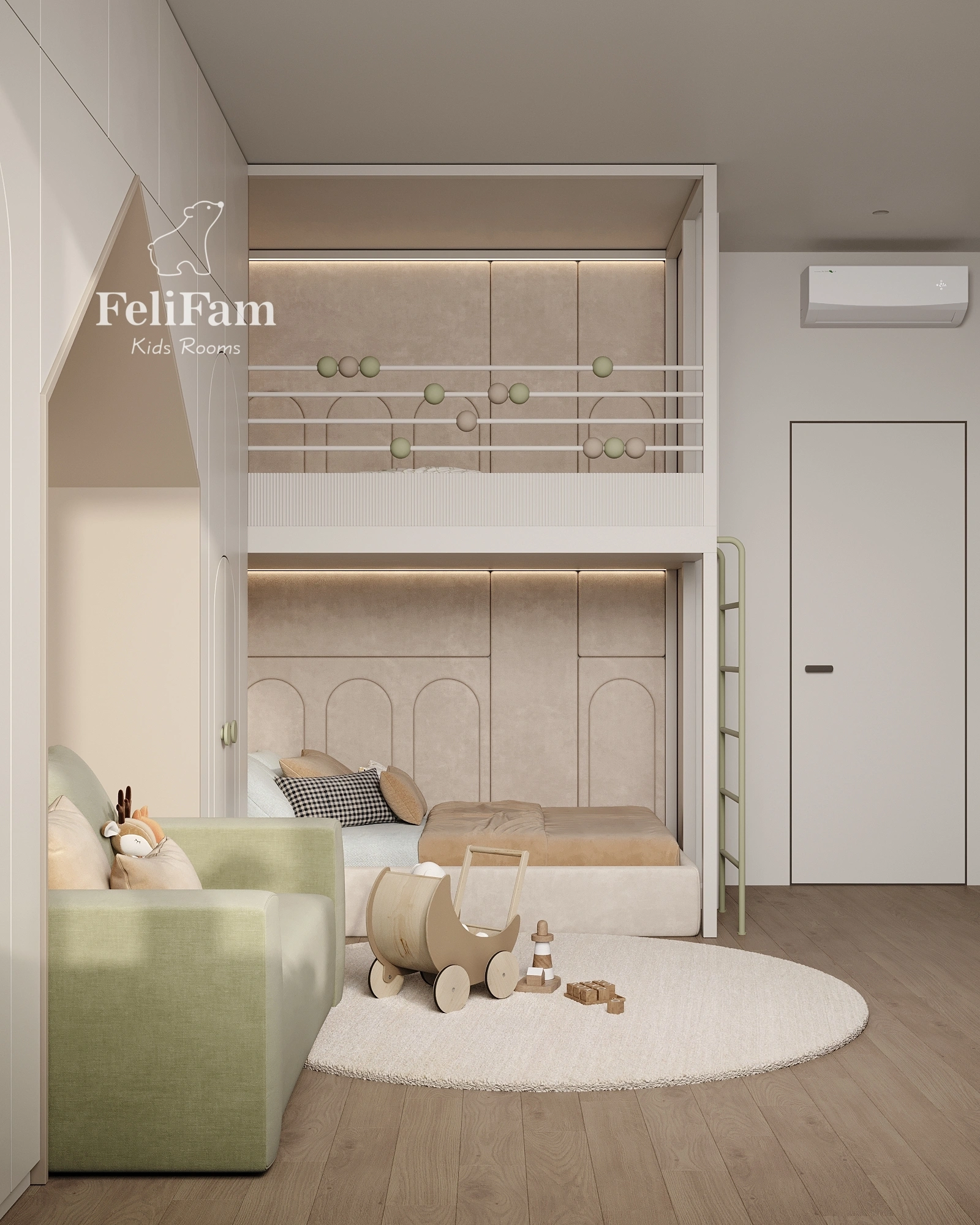 Children’s bedroom designed for a boy and a girl, aged 3 and 5. The main feature is a bunk bed, which maximizes space while providing comfortable sleep for each child. The room also includes a spacious wardrobe for storage, and a cozy niche sofa adds a relaxing corner.