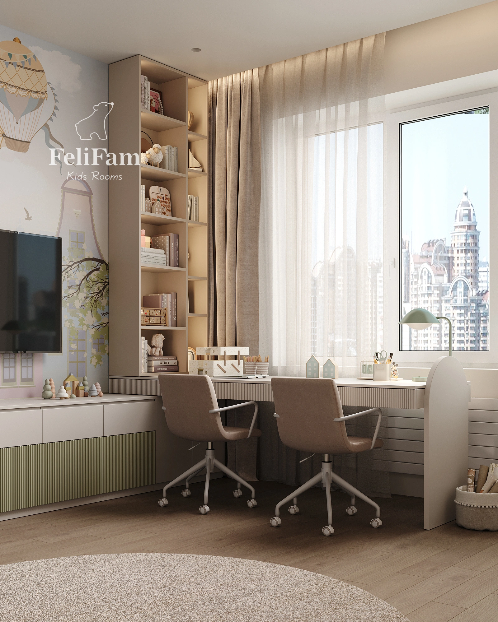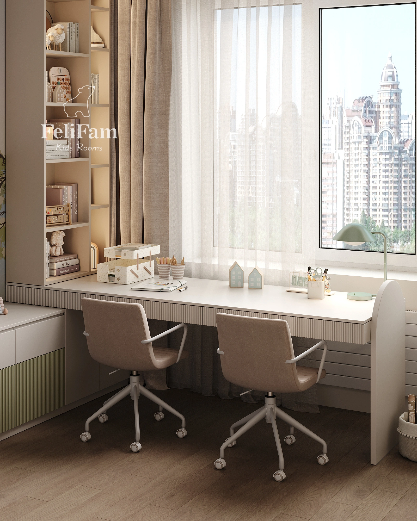 A dedicated study area offers a comfortable workspace for both children, supporting learning and creative activities. The interior combines functionality, safety, and thoughtful design, making the most efficient use of the room’s space.