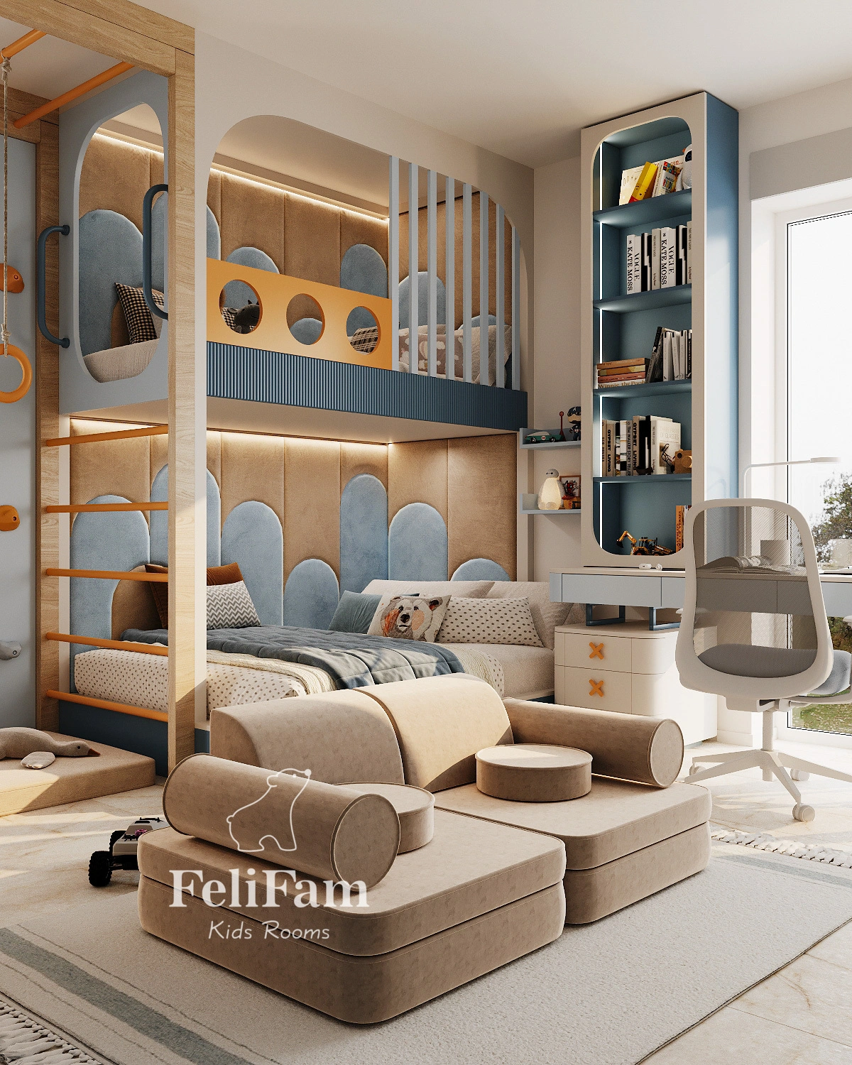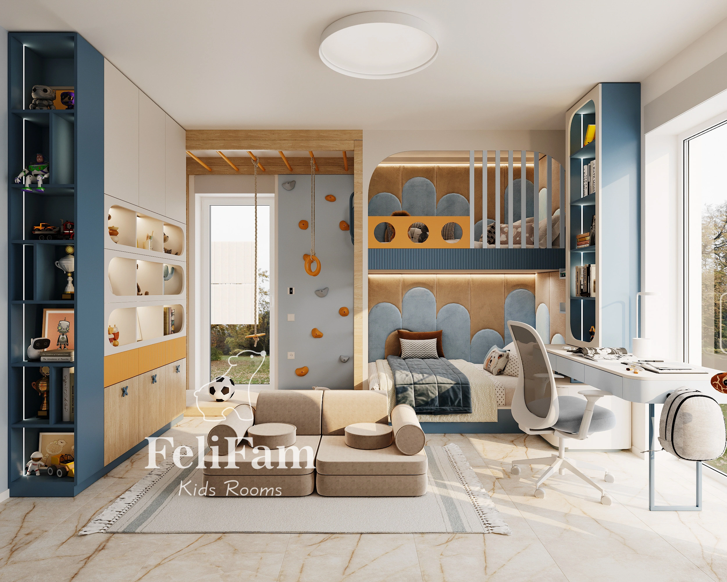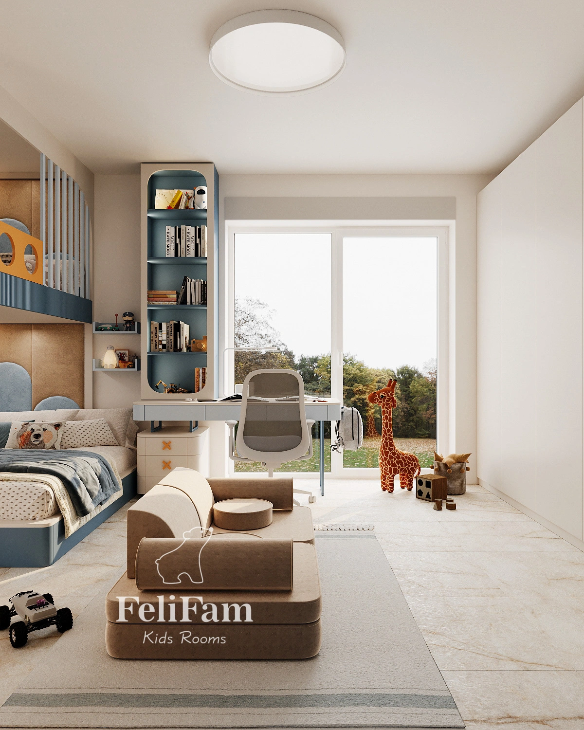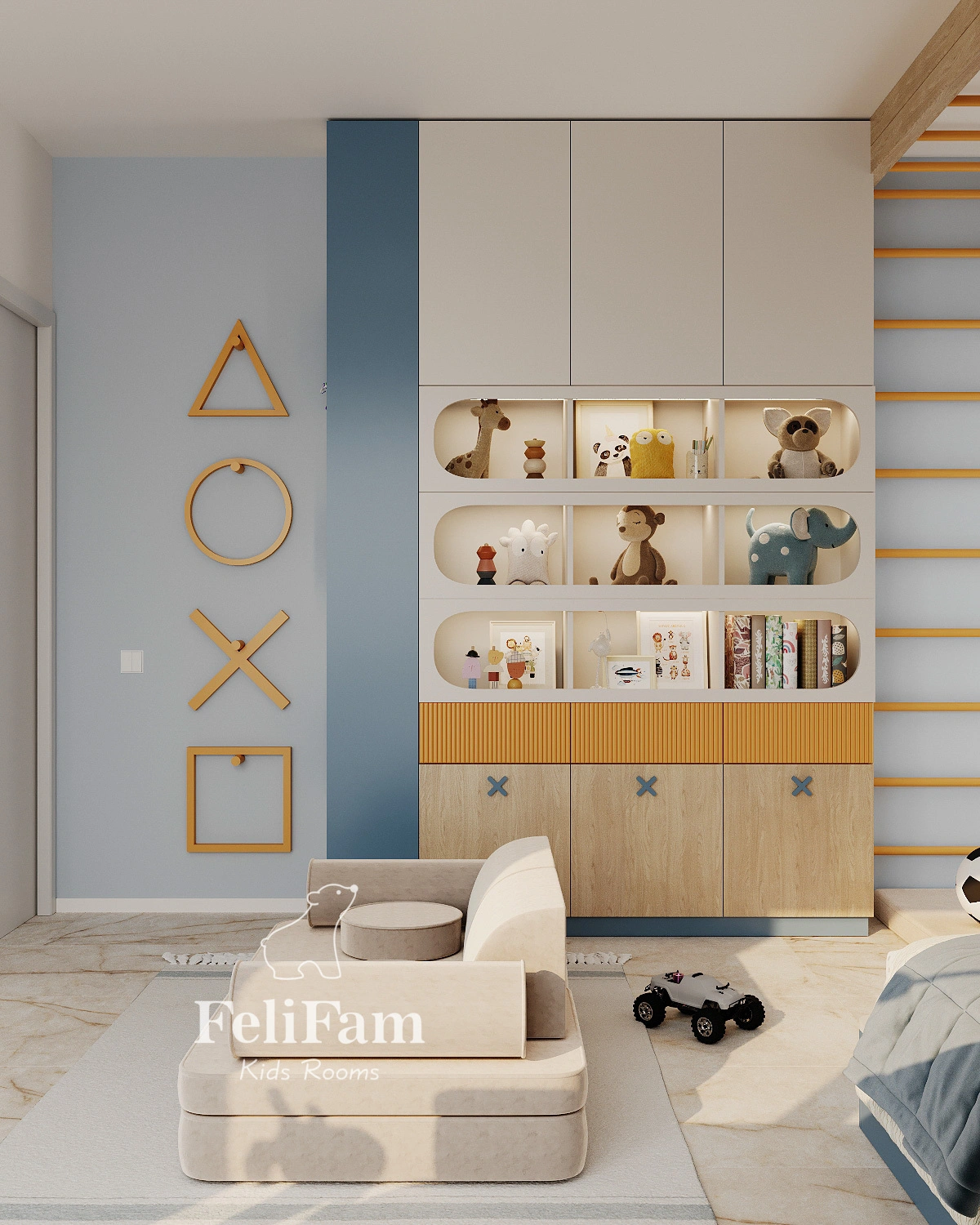 The interior of a 4-year-old boy’s room is designed as a multifunctional space combining comfort and safety. The layout includes areas for sleeping, studying, and active play, allowing the child to rest and grow without feeling overwhelmed. Thoughtful planning ensures convenience and free movement throughout the room.