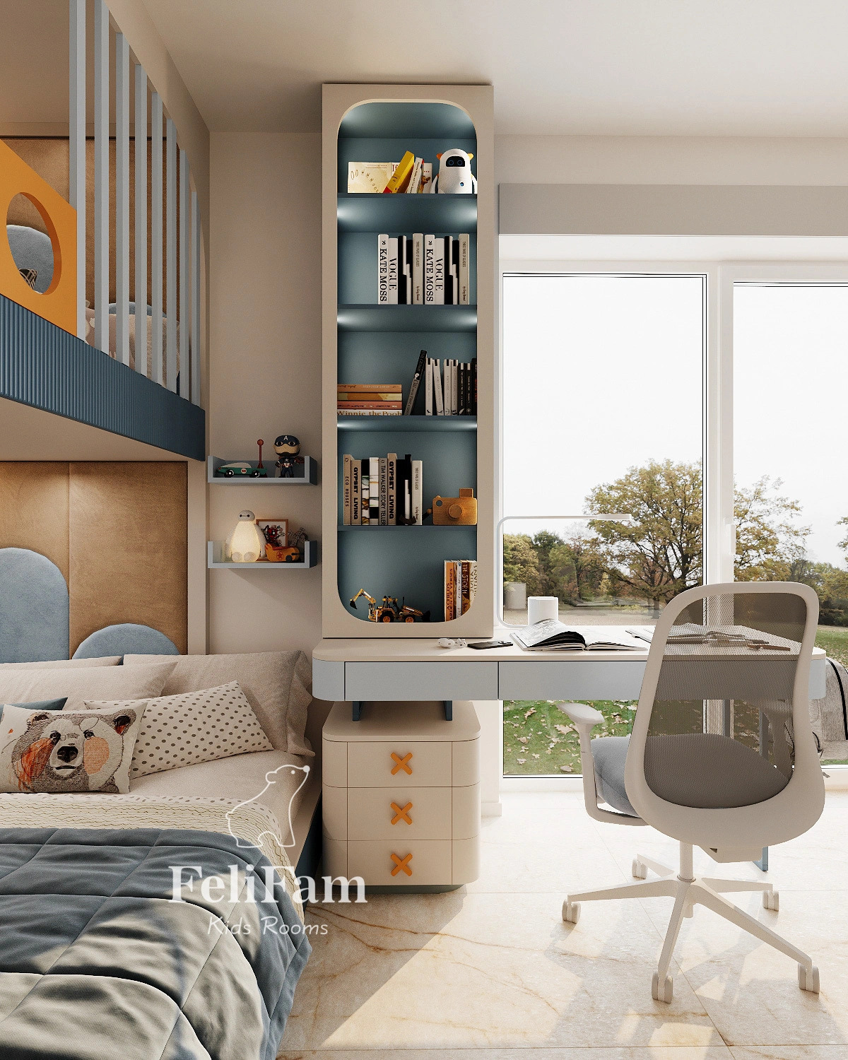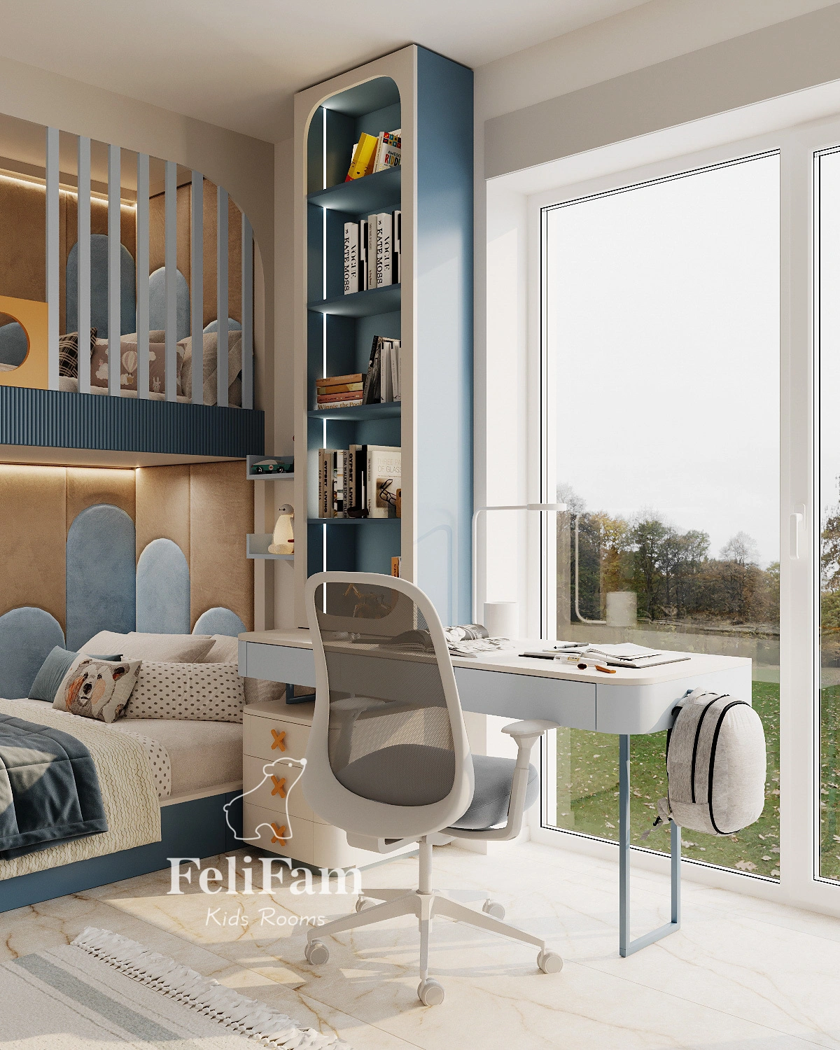 Soft and bright accents create a cozy atmosphere and stimulate imagination. Practical storage solutions, well-planned lighting, and ergonomic furniture make the space functional for years to come, blending stylish design with everyday practicality for the child.