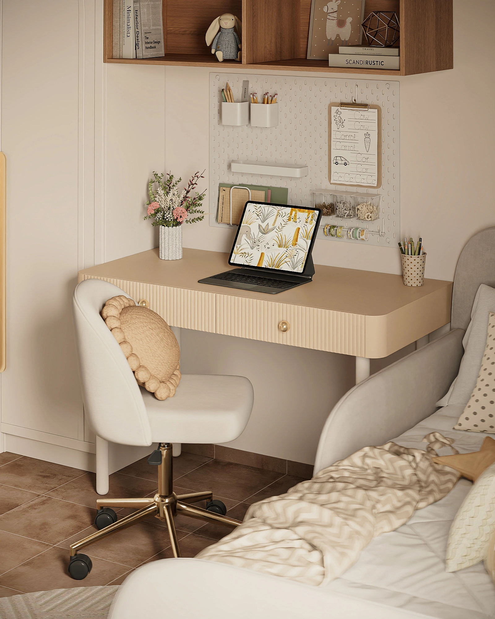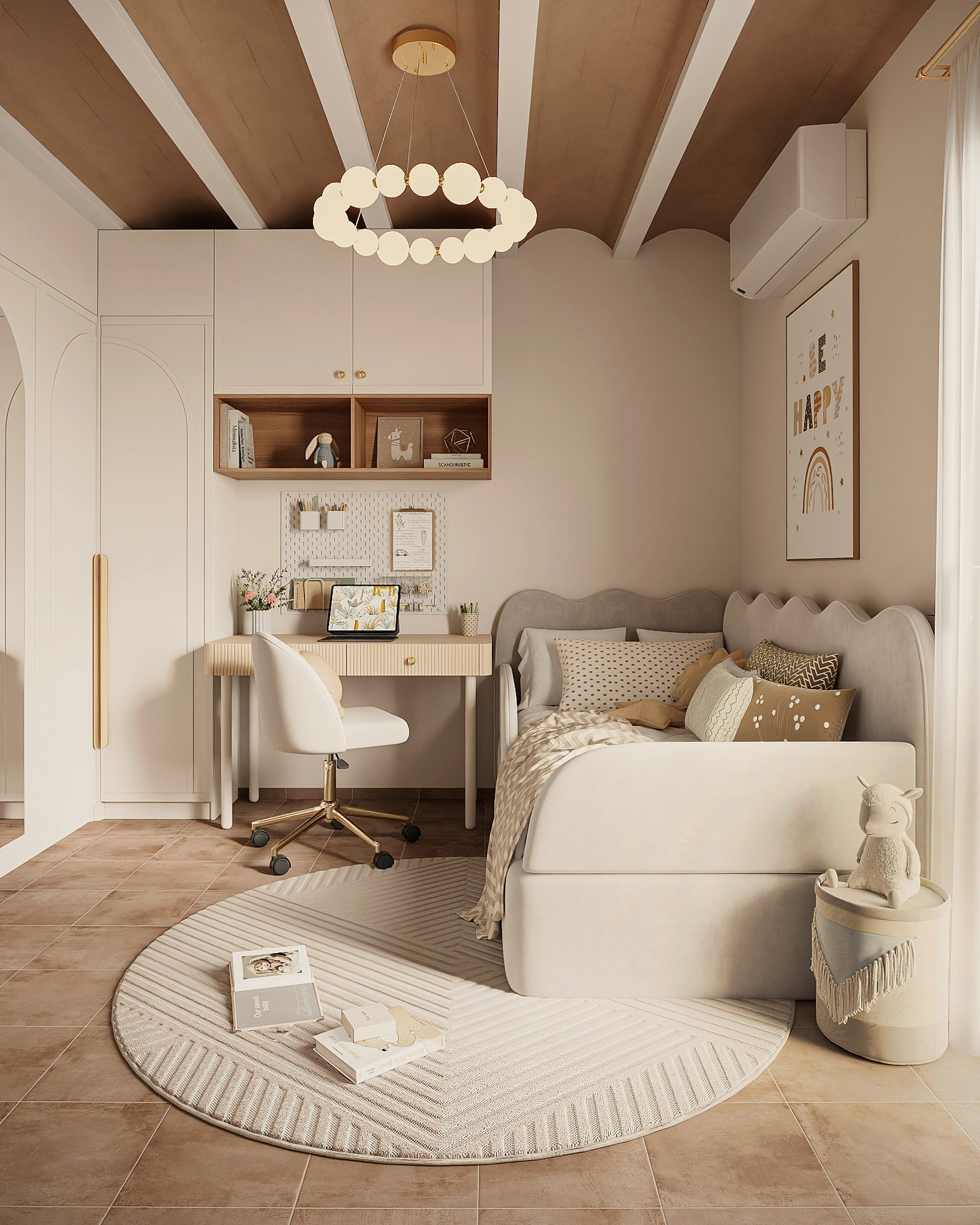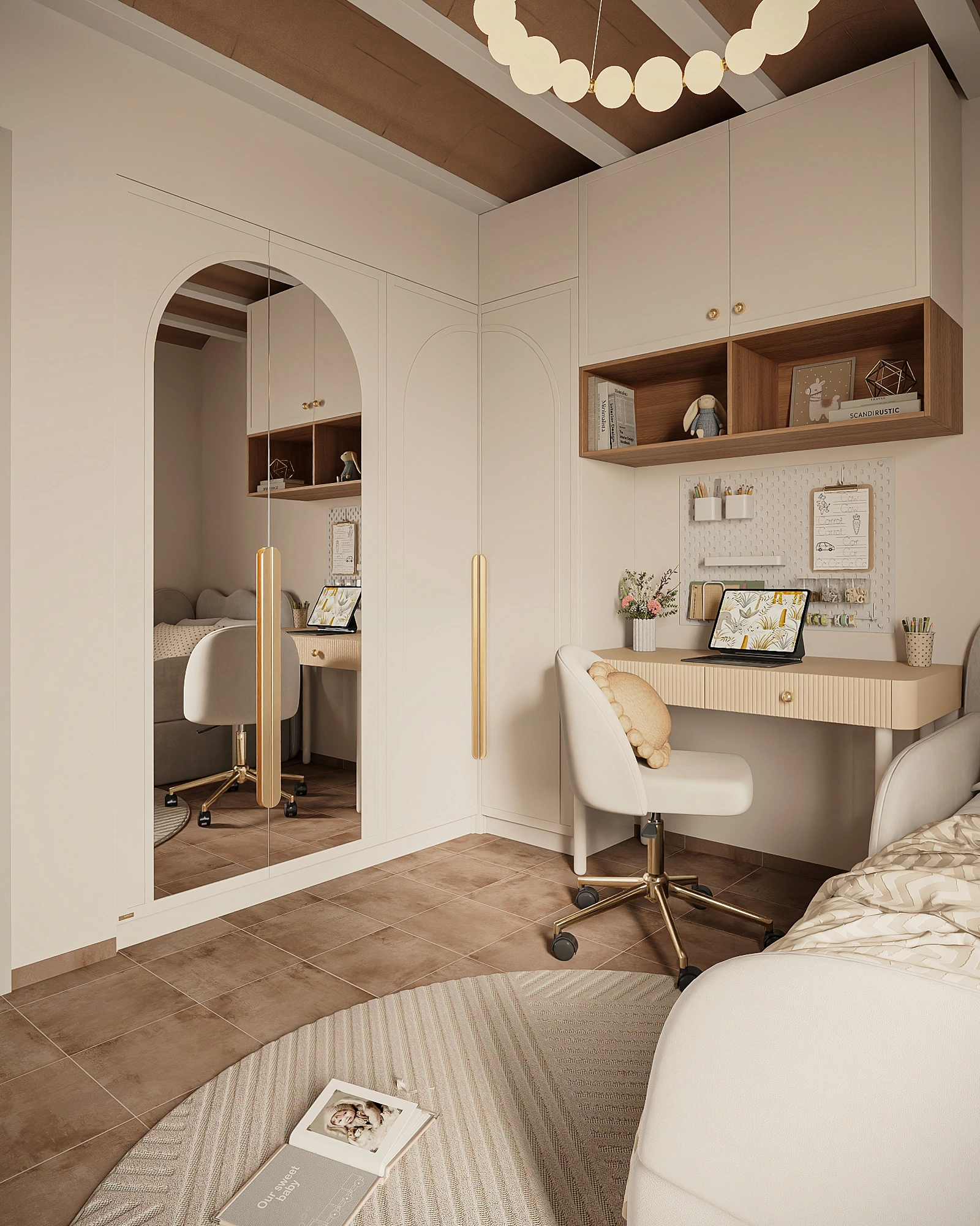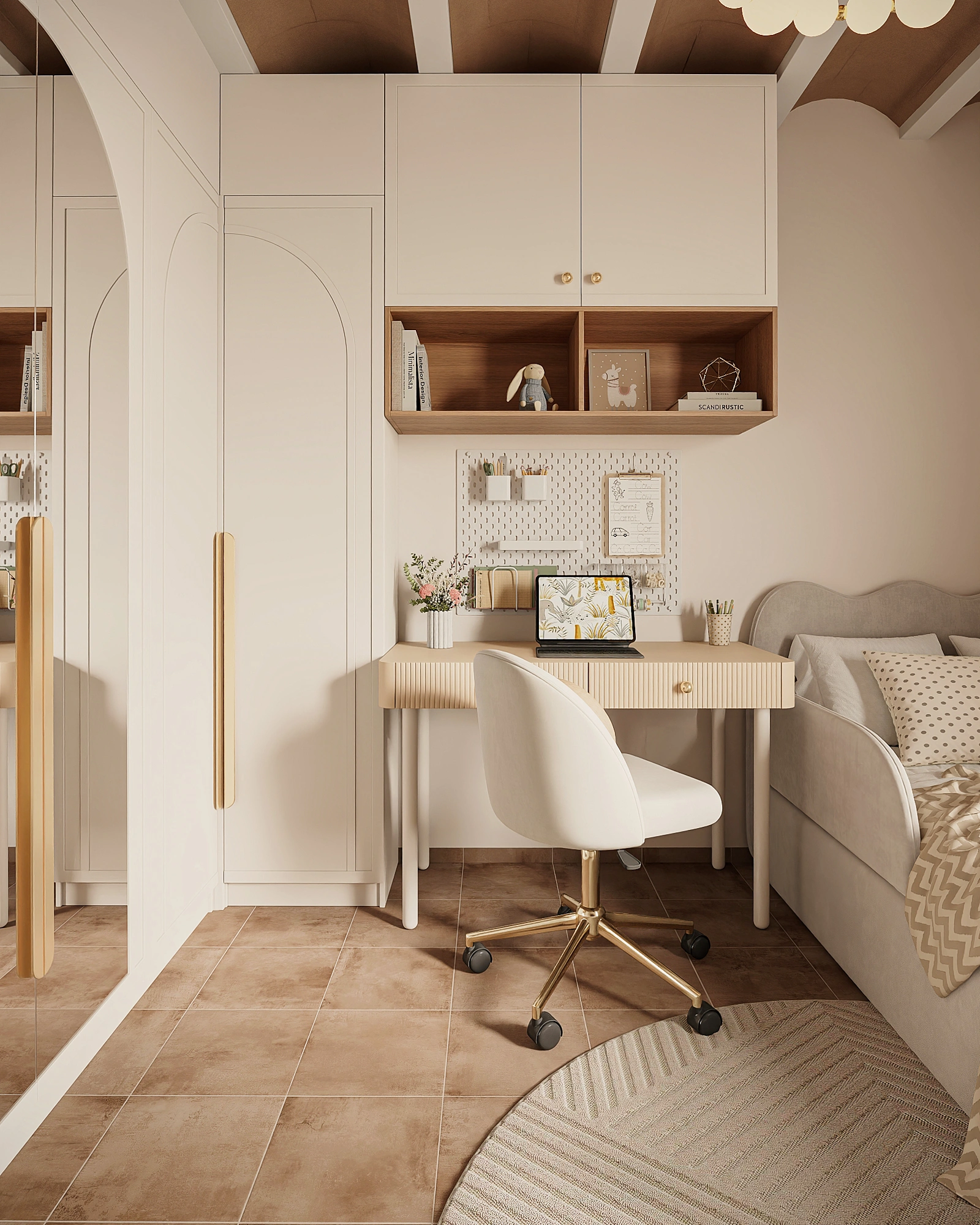 A 9 sqm girls’ room is organized for maximum functionality: the compact space accommodates a comfortable and safe bed, a study and creative area, and a spacious wardrobe. Every detail is designed for ease of use and safety while leaving enough room for movement and play.