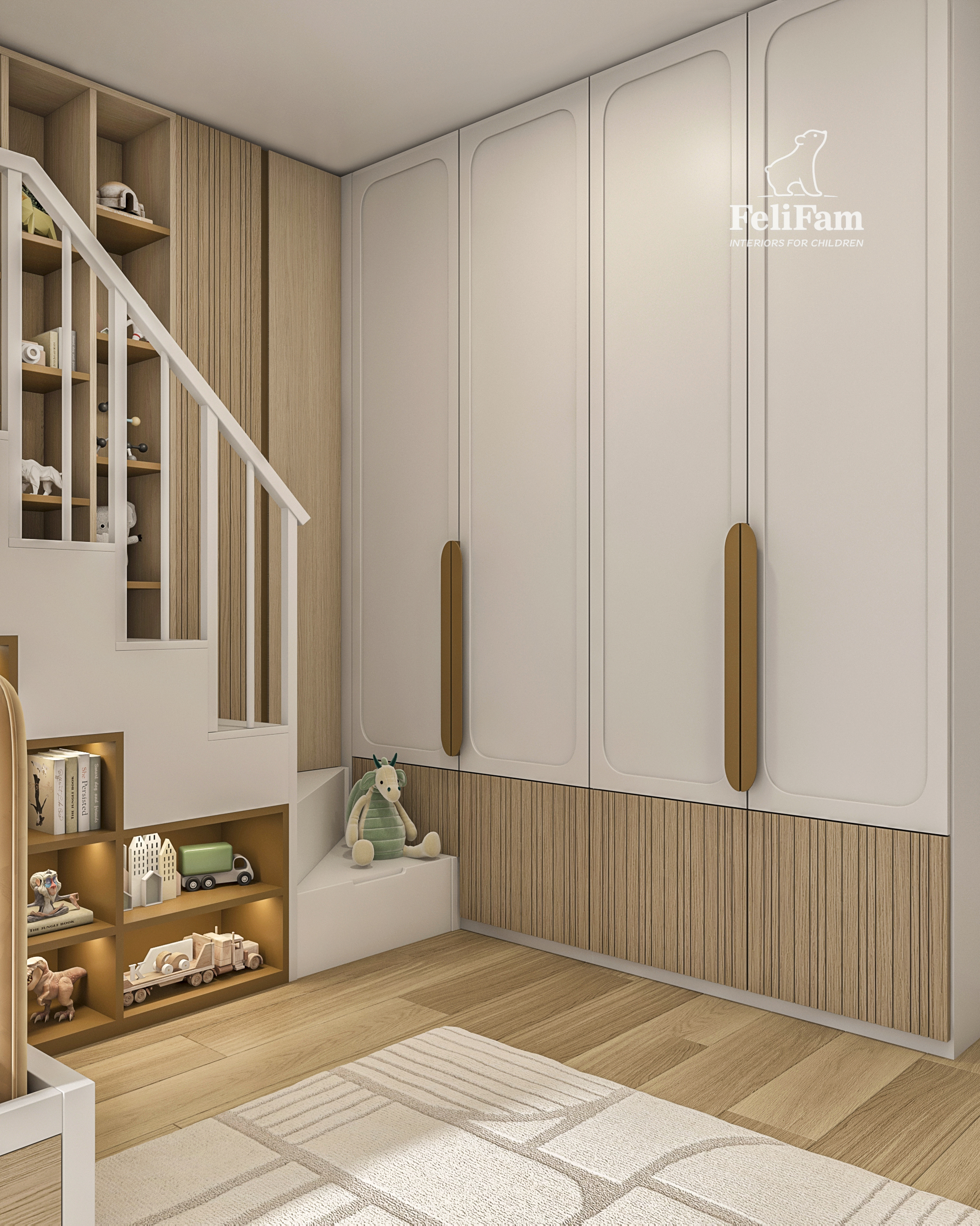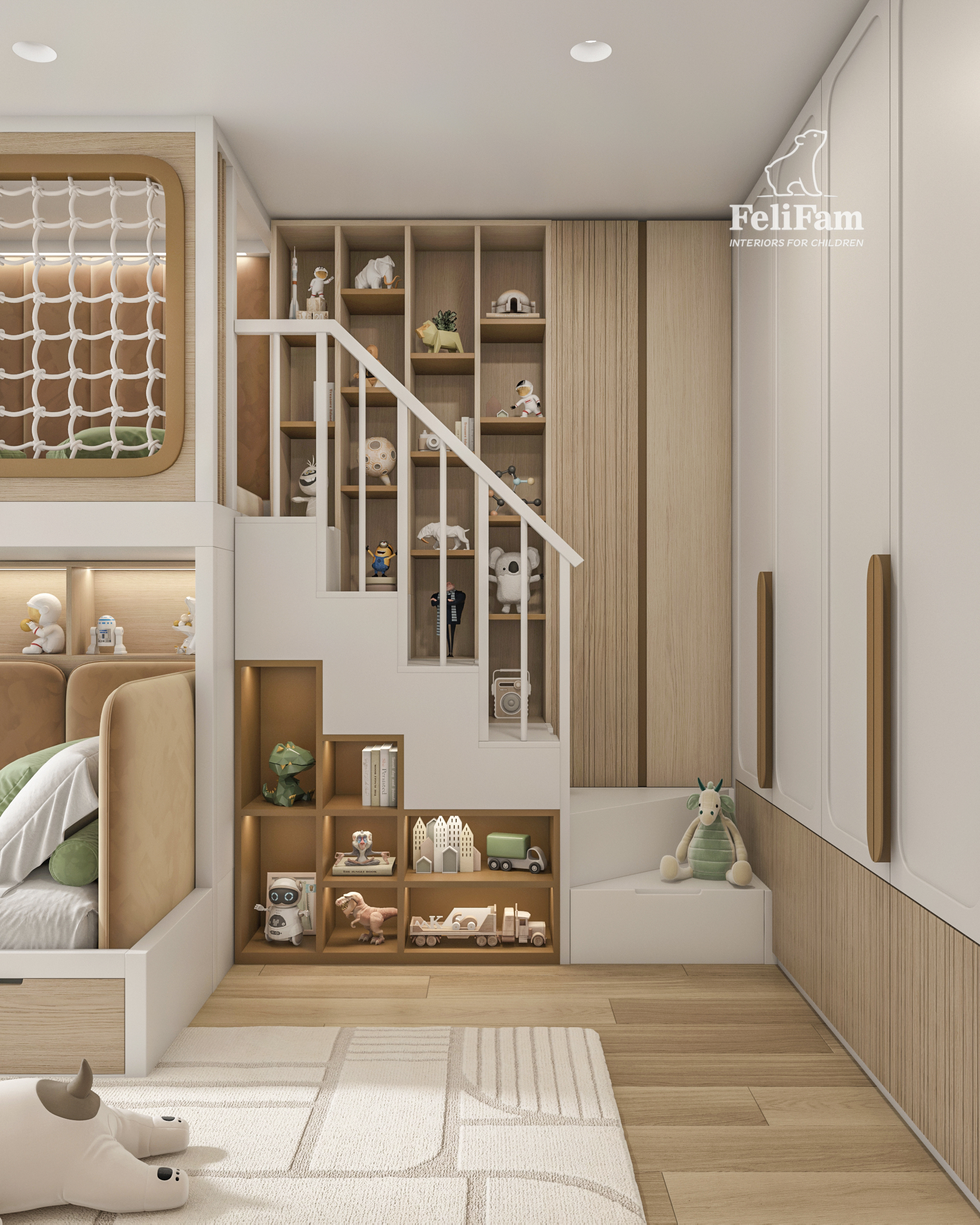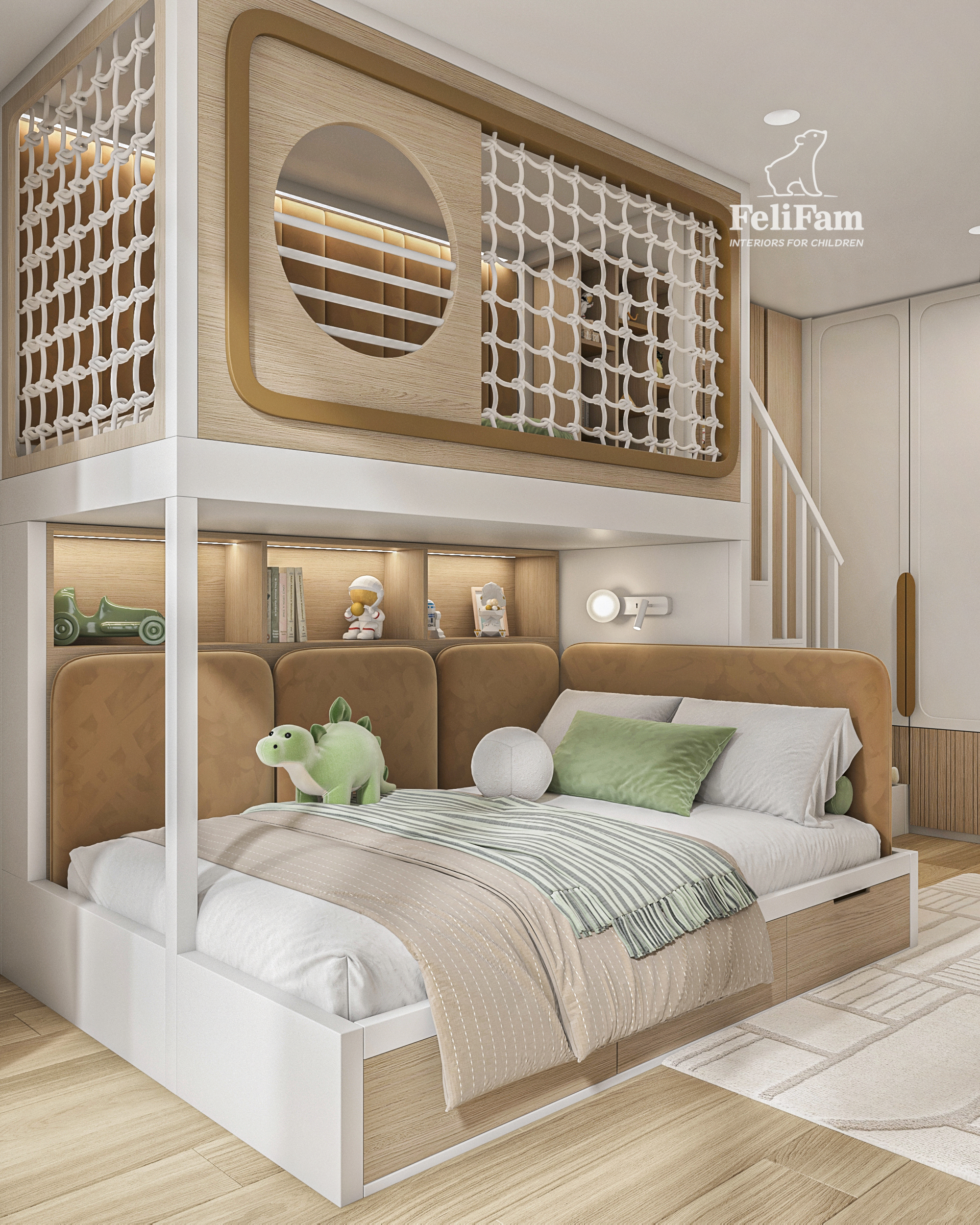 The main element is a multi-level structure with a full-size bed, a play area on the second level, and stairs with built-in drawers. The room also includes a study corner, open shelving, and a decorative accent that can be easily updated over time.
