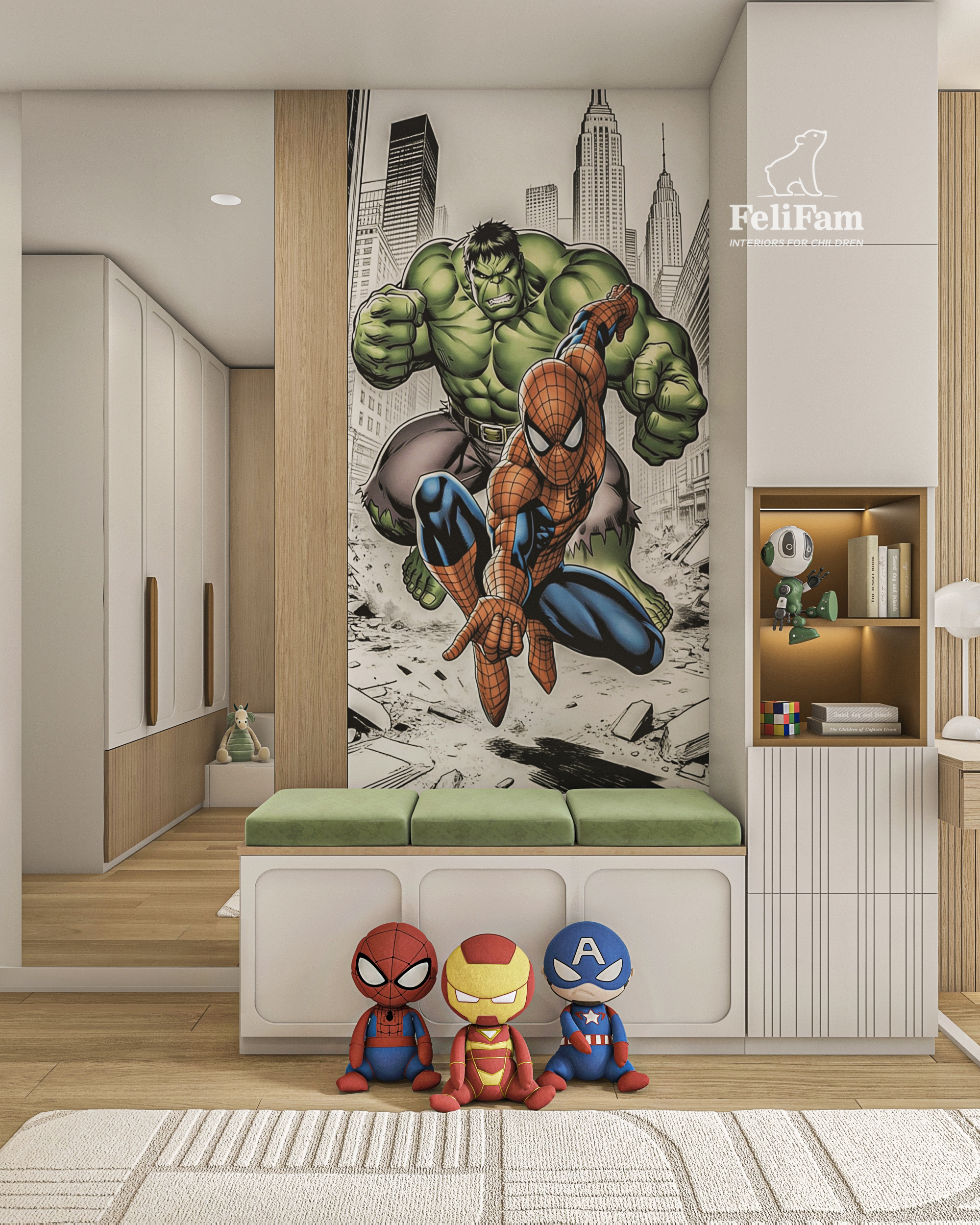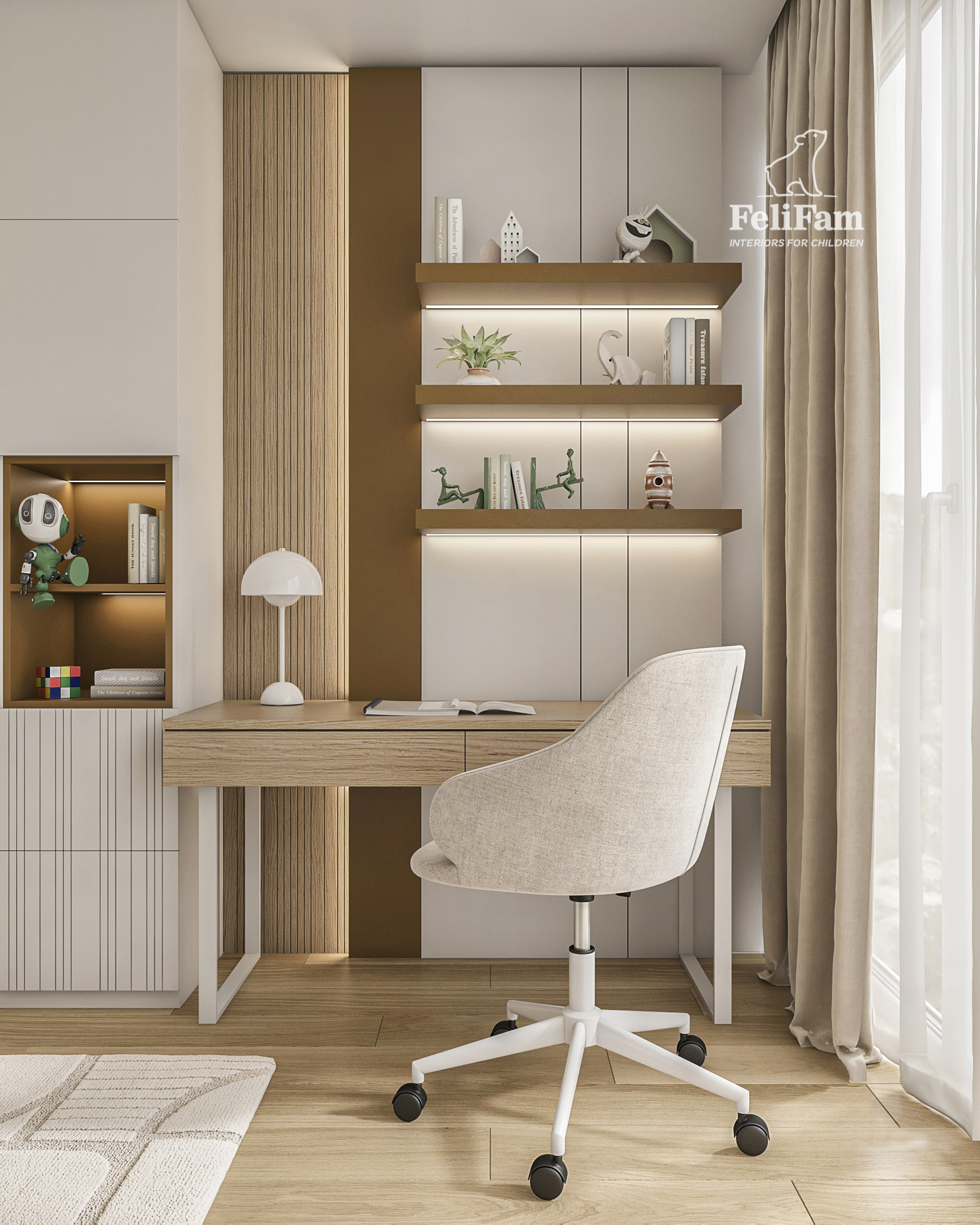 Toddler boy’s bedroom designed as a functional space that easily adapts to the child’s needs as he grows. The interior features a calm Scandinavian style with natural textures, soft tones, and smart storage solutions.