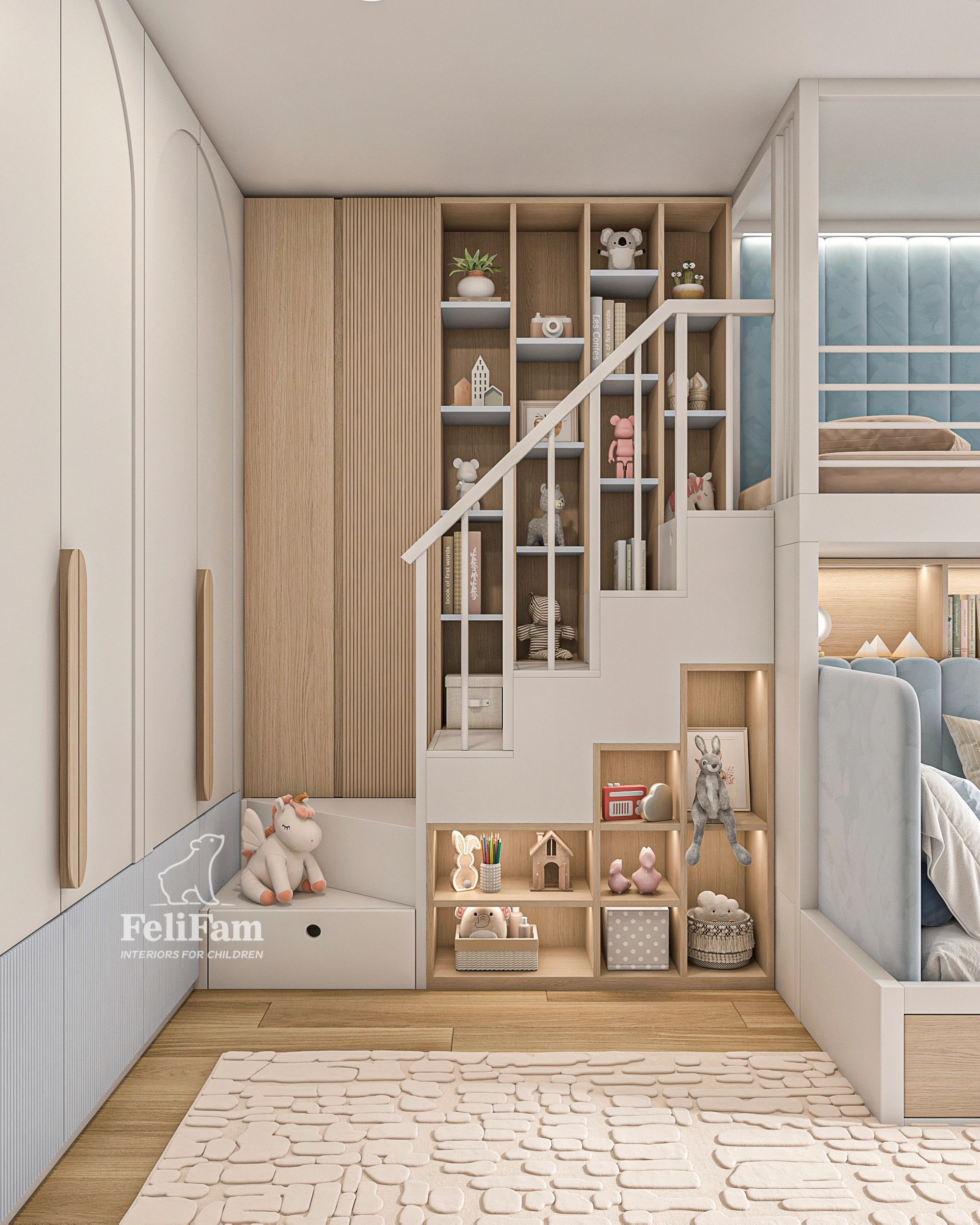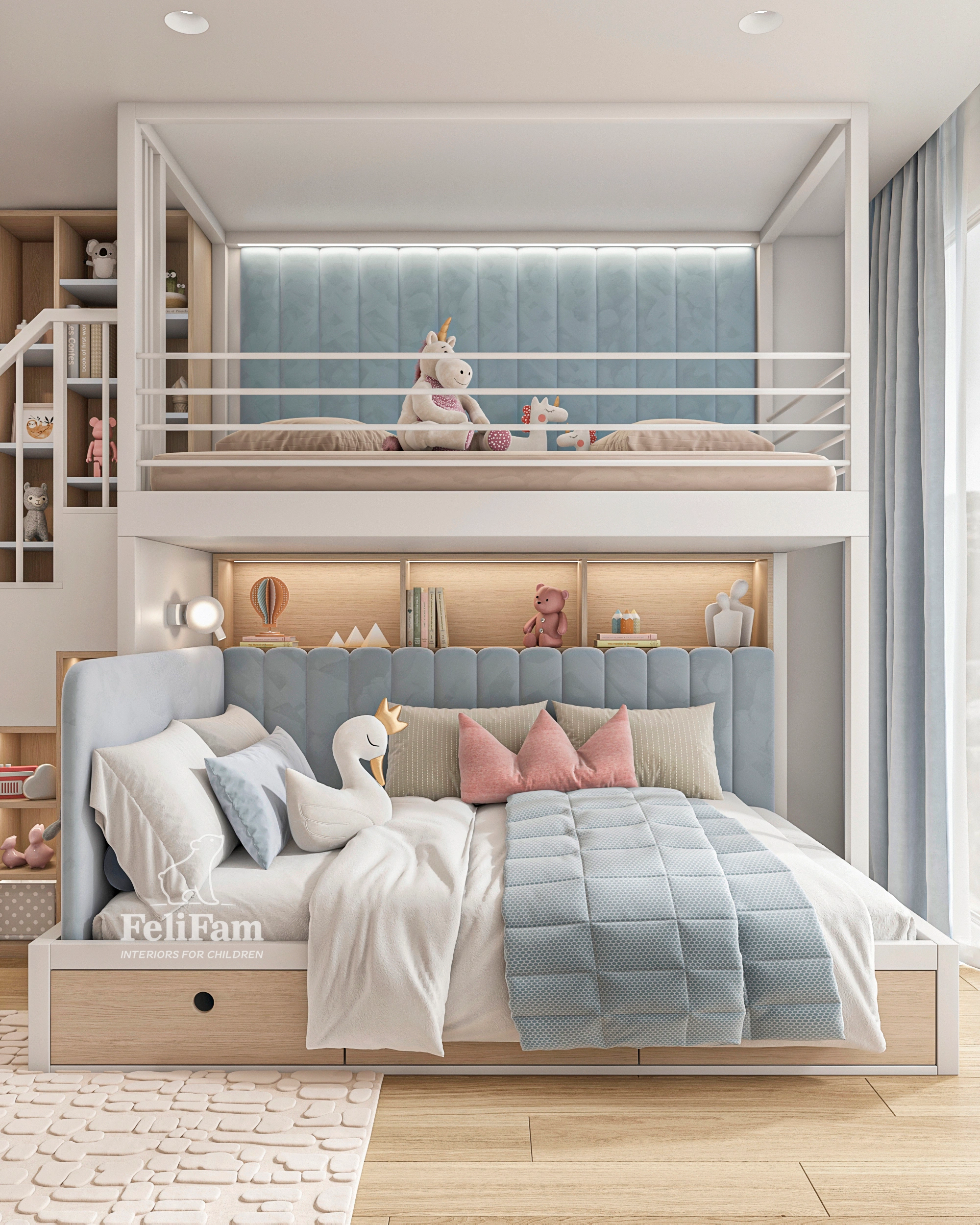A two-level structure becomes the key feature of the interior, adding functionality and creating separate zones for rest and play. The lower level includes a spacious bed, while the upper level is designed as a play area.